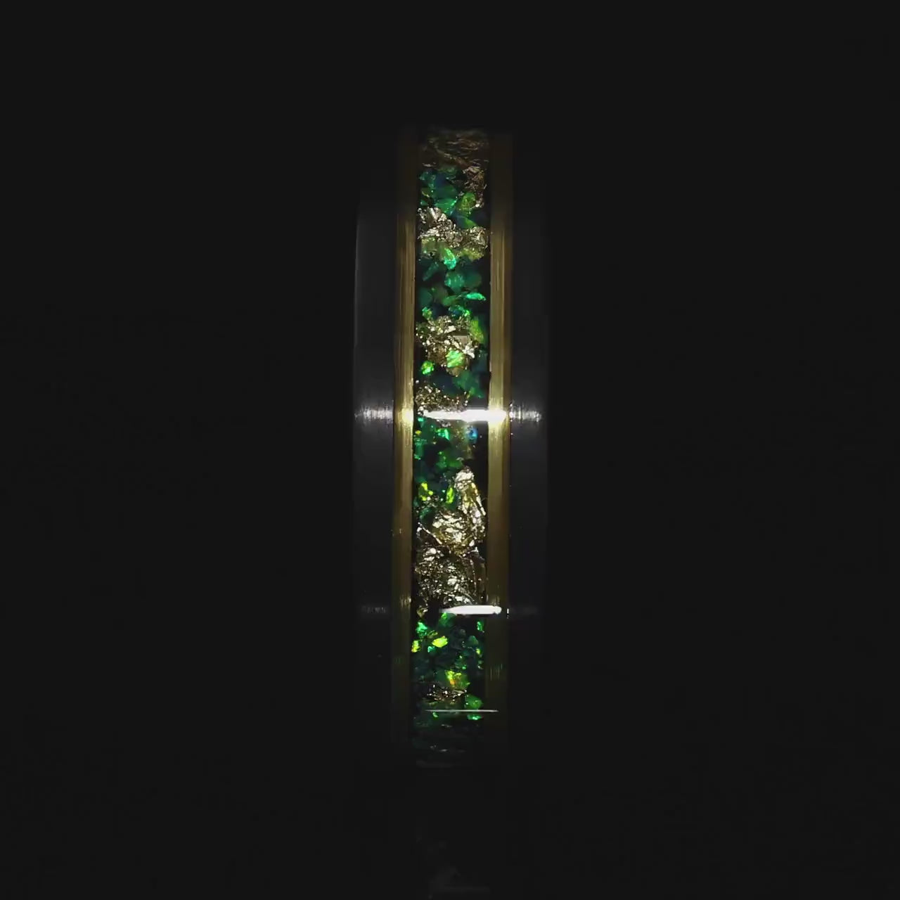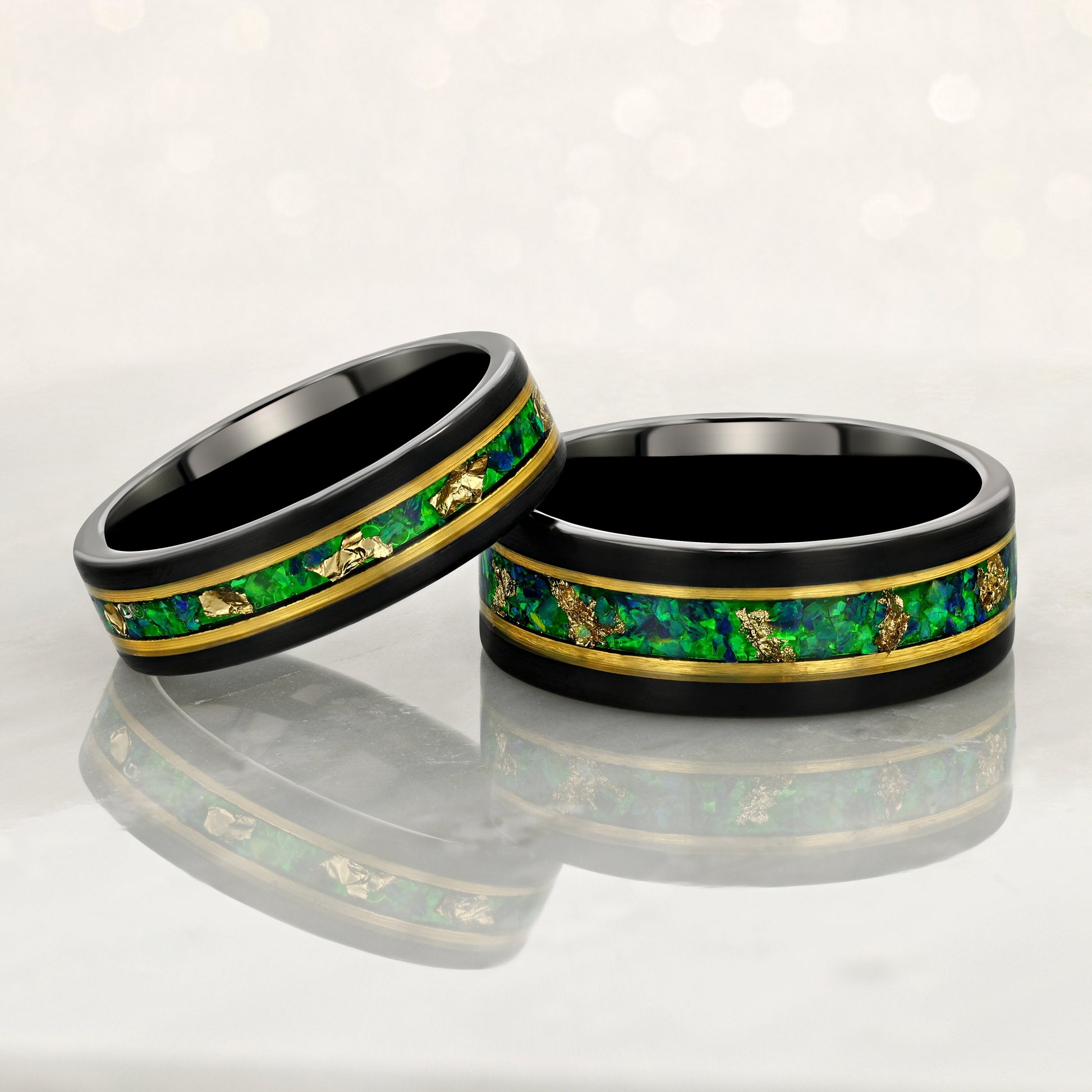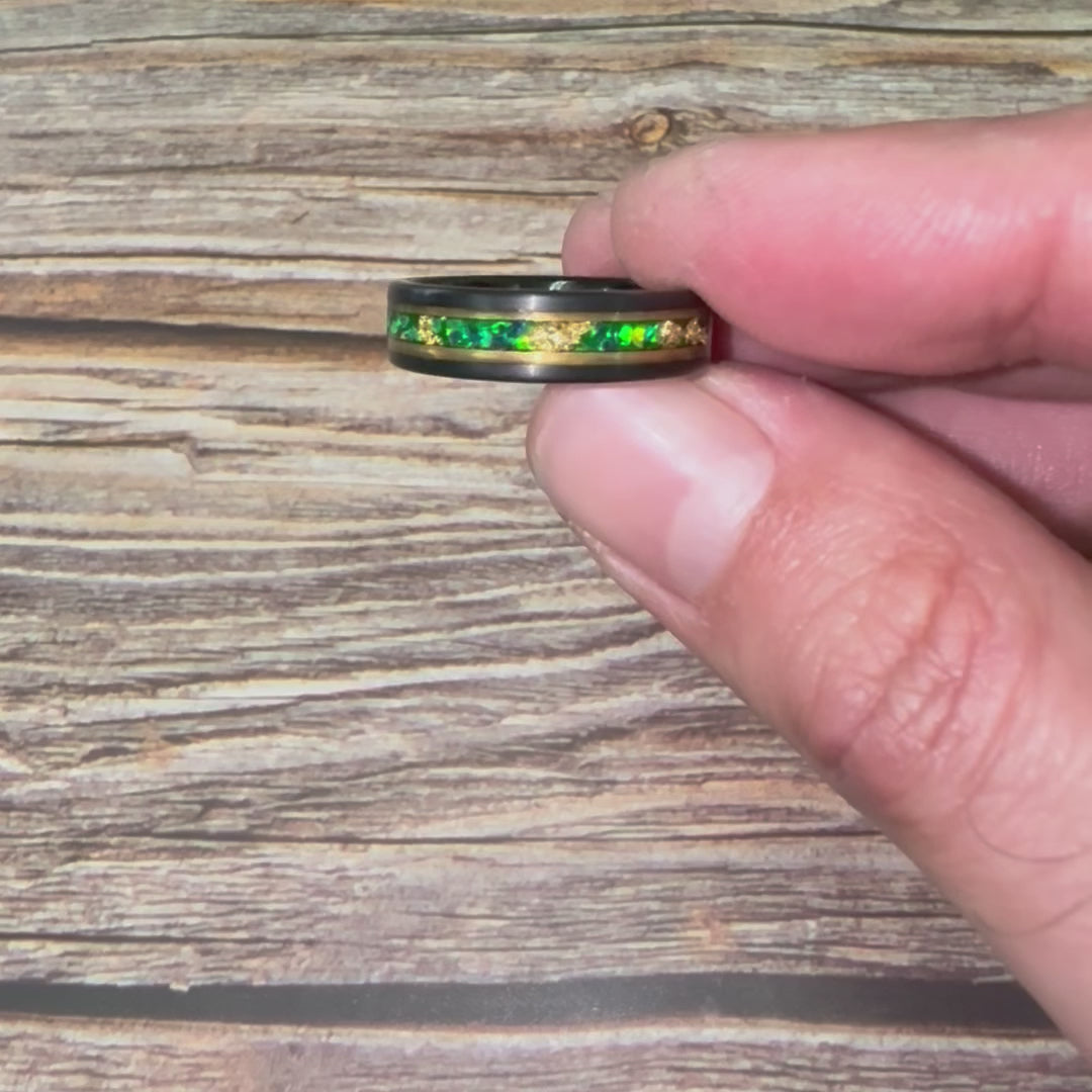 “Binary" Tungsten Carbide Black Ring 8mm, 6mm w/ Green Opal, Gold Accents and Gold Leaf