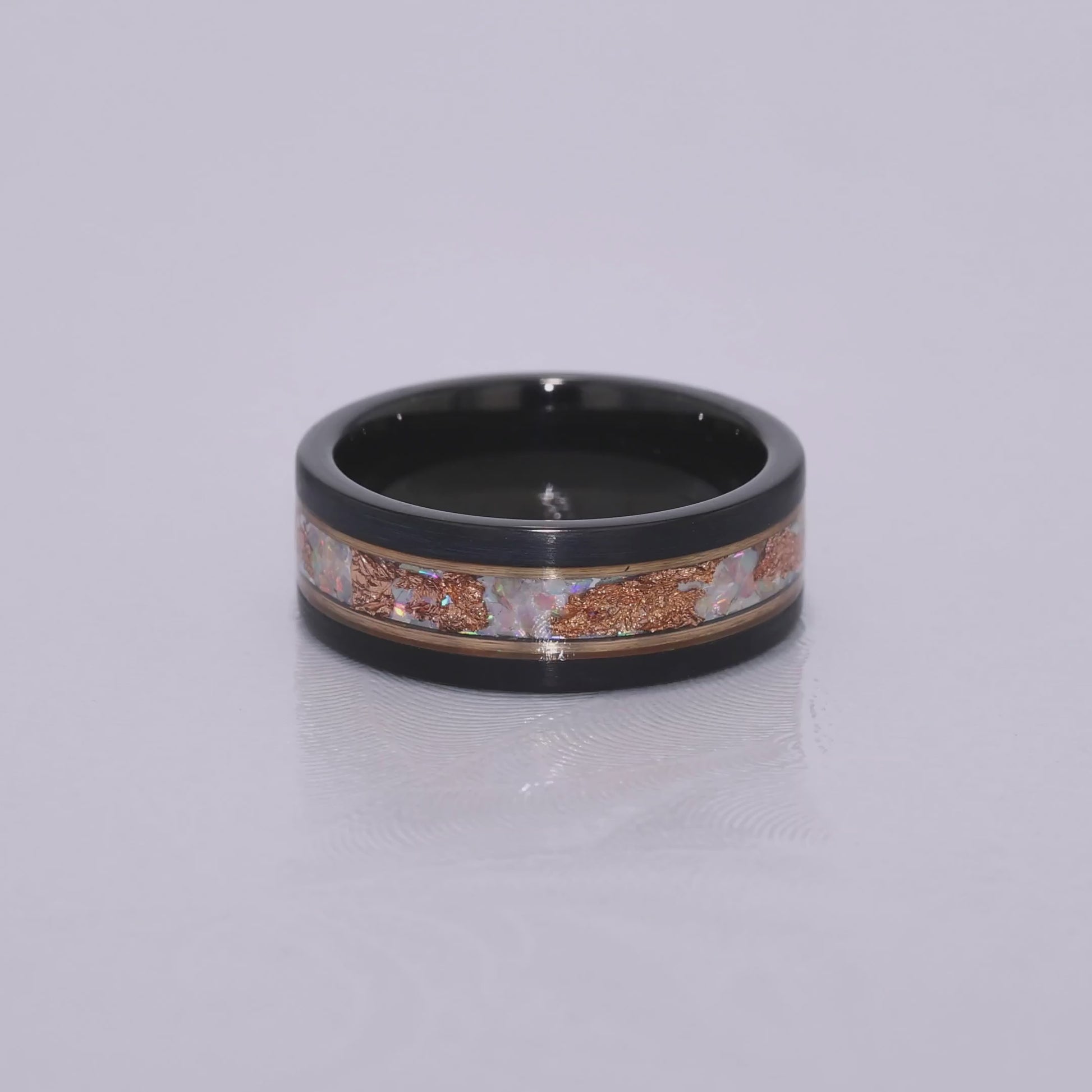 “Binary" Tungsten Carbide Black Ring 8mm w/ White Opal, Rose Gold Accents and Rose Gold Leaf