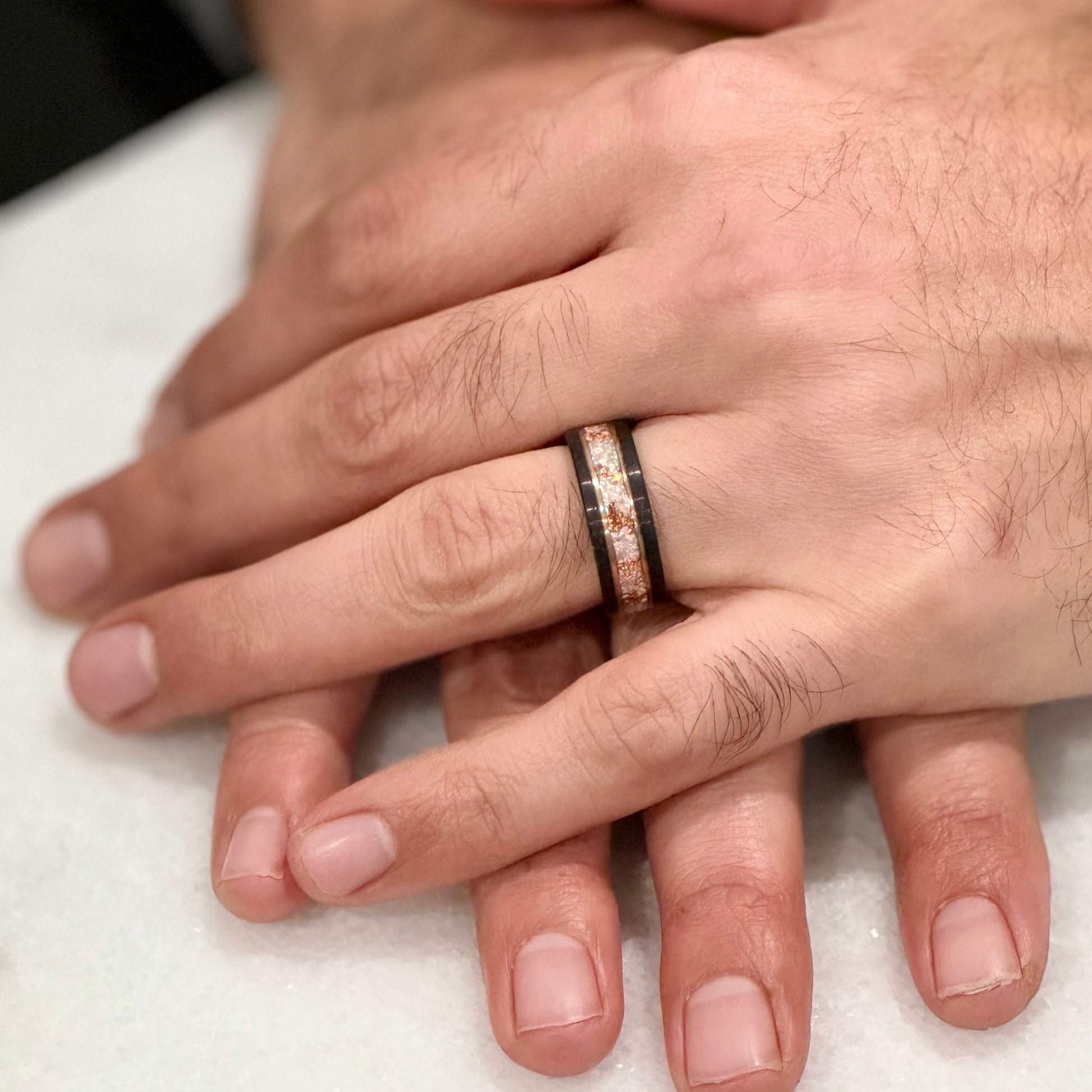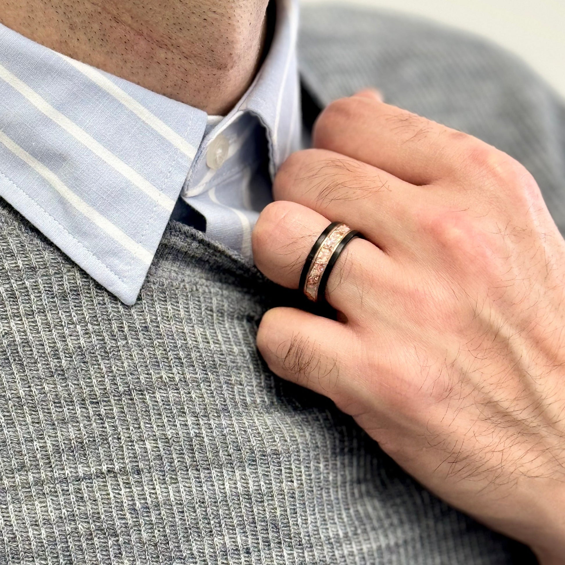 SaleBinary Tungsten Black Ring - 8mm Meteorite, Rose Gold Accents, and Copper Leaf
