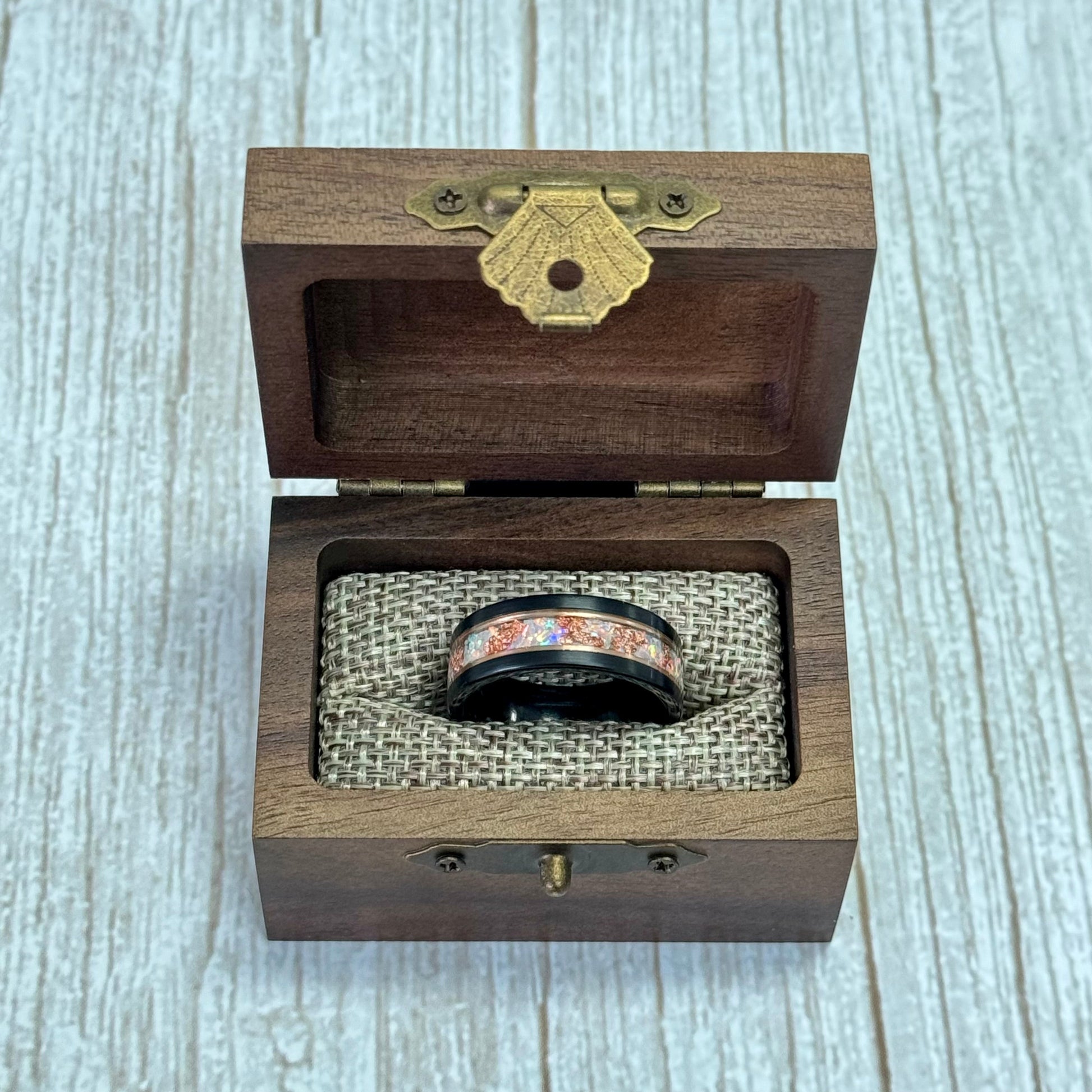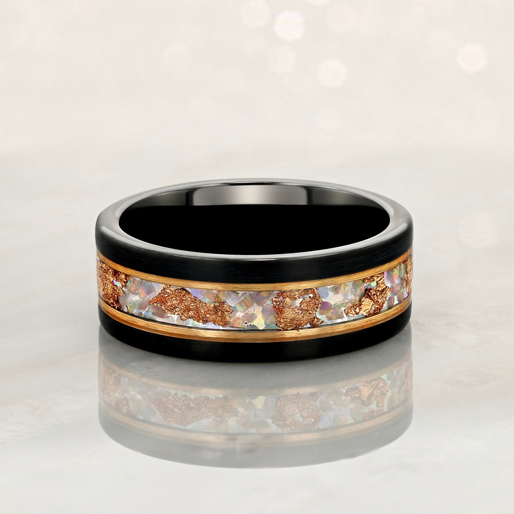 Sale“Binary" Tungsten Carbide Black Ring 8mm w/ White Opal, Rose Gold Accents and Rose Gold Leaf