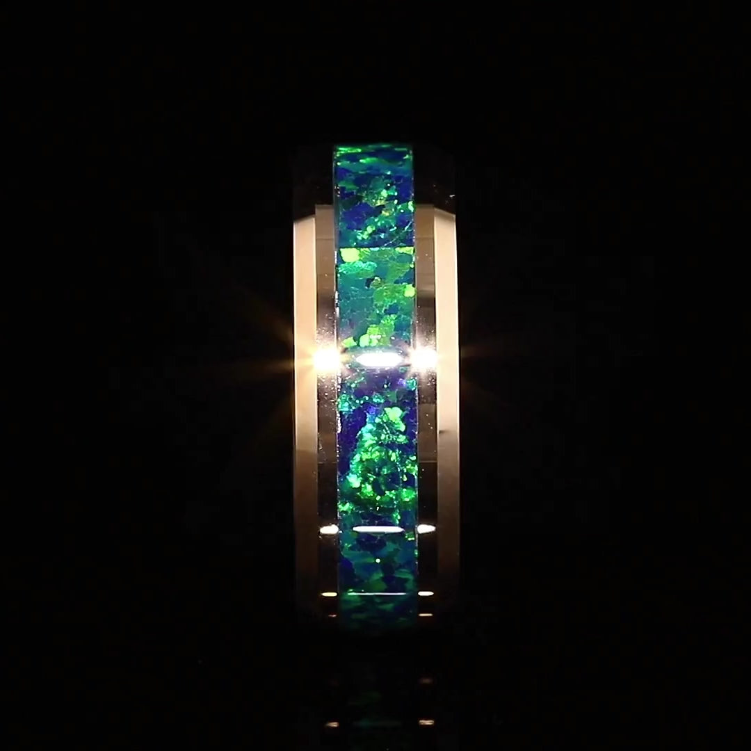 “IRIDESCENCE” Tungsten Carbide Rose Gold Ring 8mm w/ Blue - Green Opal - Pristine Pieces By Amy