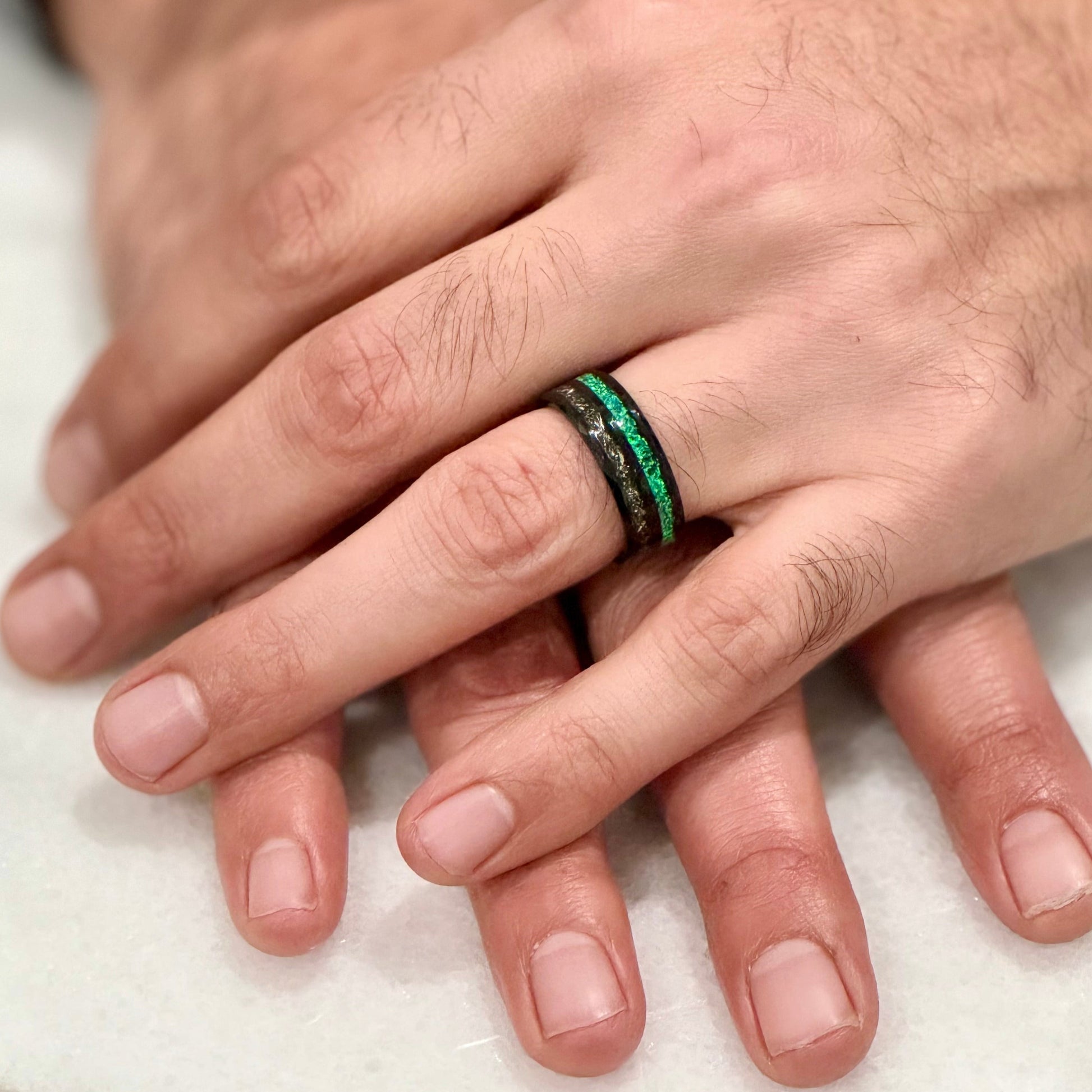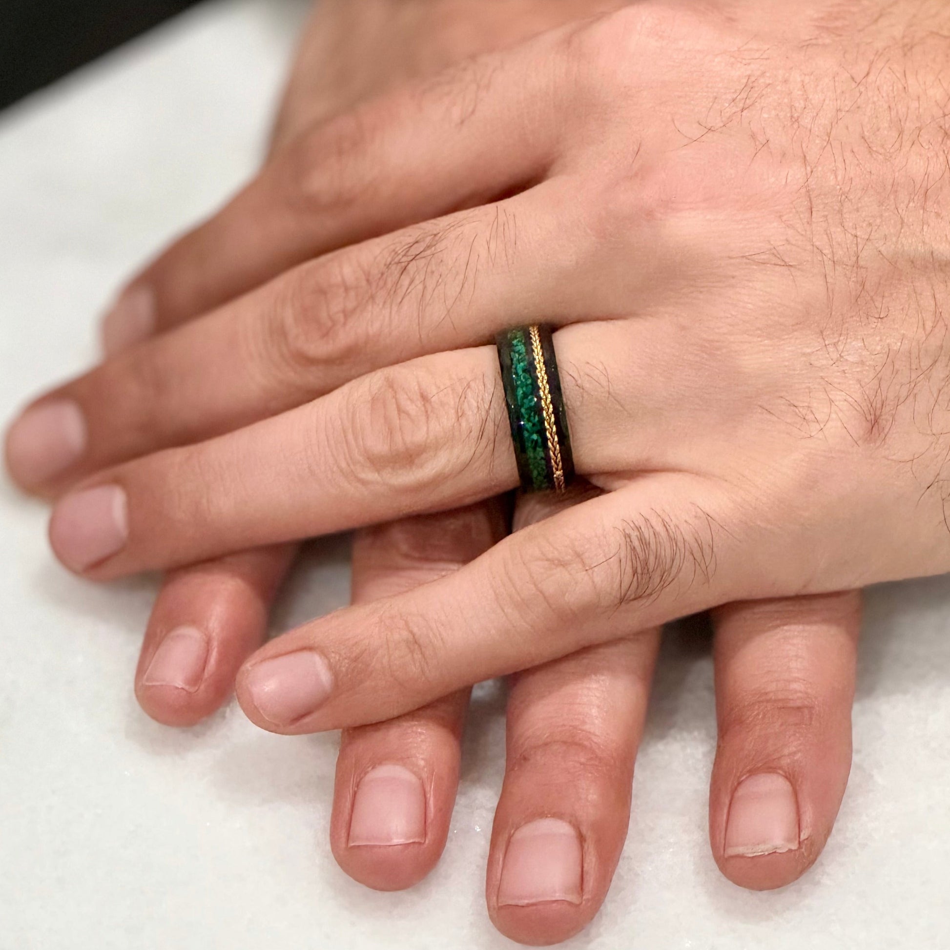 “Binary" Tungsten Carbide Black Ring 8mm, 6mm w/ Green Opal, Gold Accents and Gold Leaf