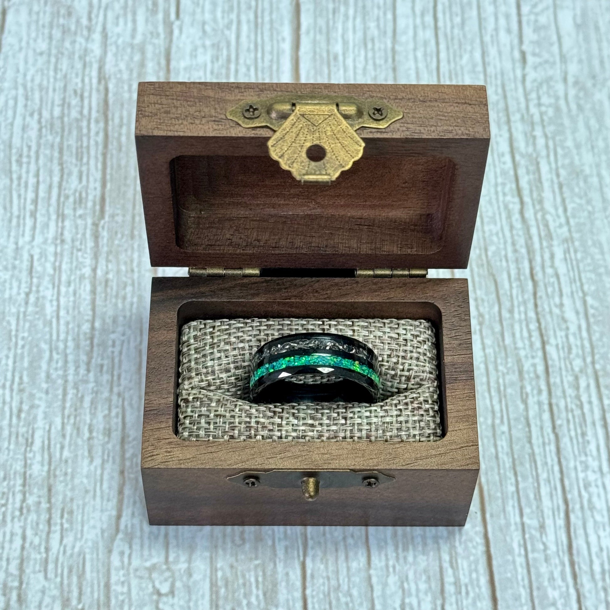 Sale"HALO" Tungsten Carbide Black Ring 8mm w/ Green Opal and Koa Wood