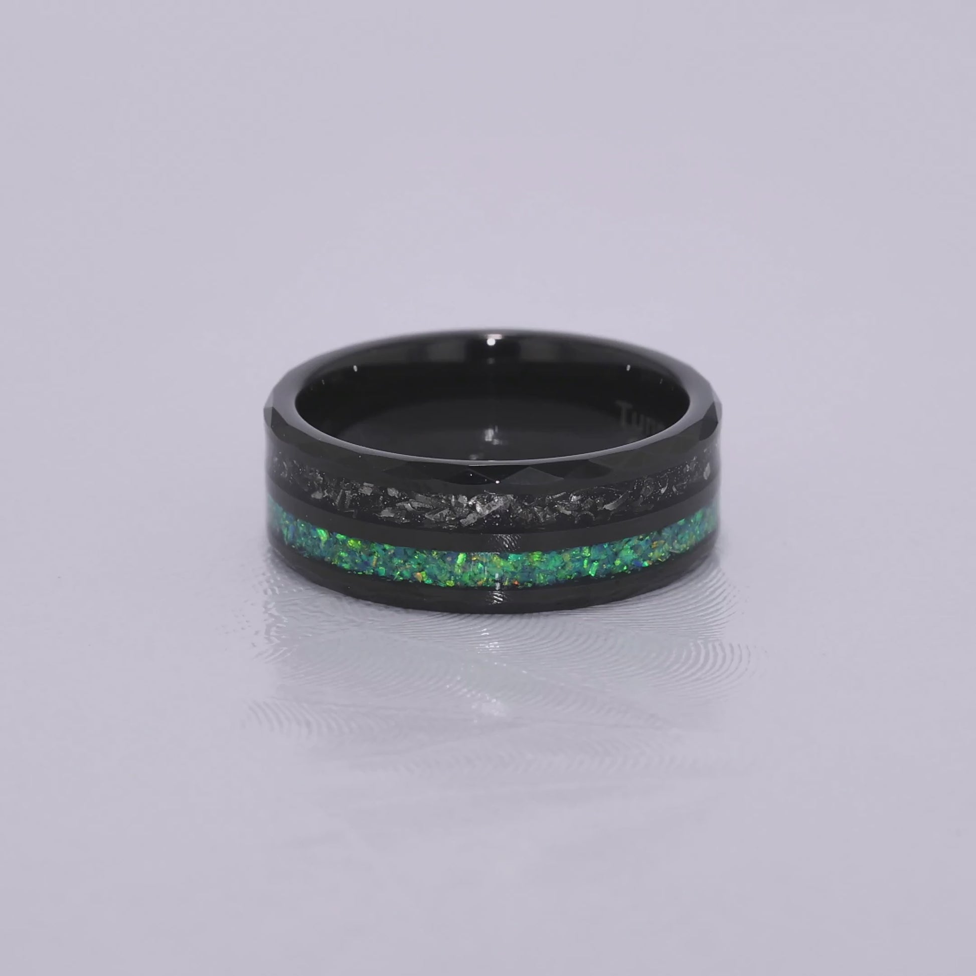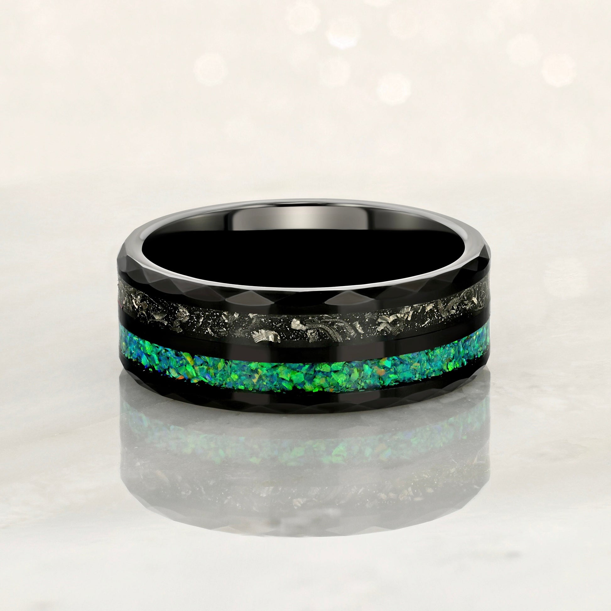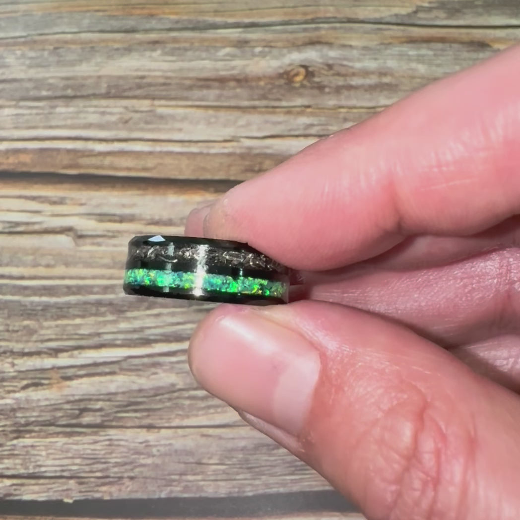 “CELESTIAL” Tungsten Carbide Black Ring 8mm w/ Meteorite and Crushed Green Opal