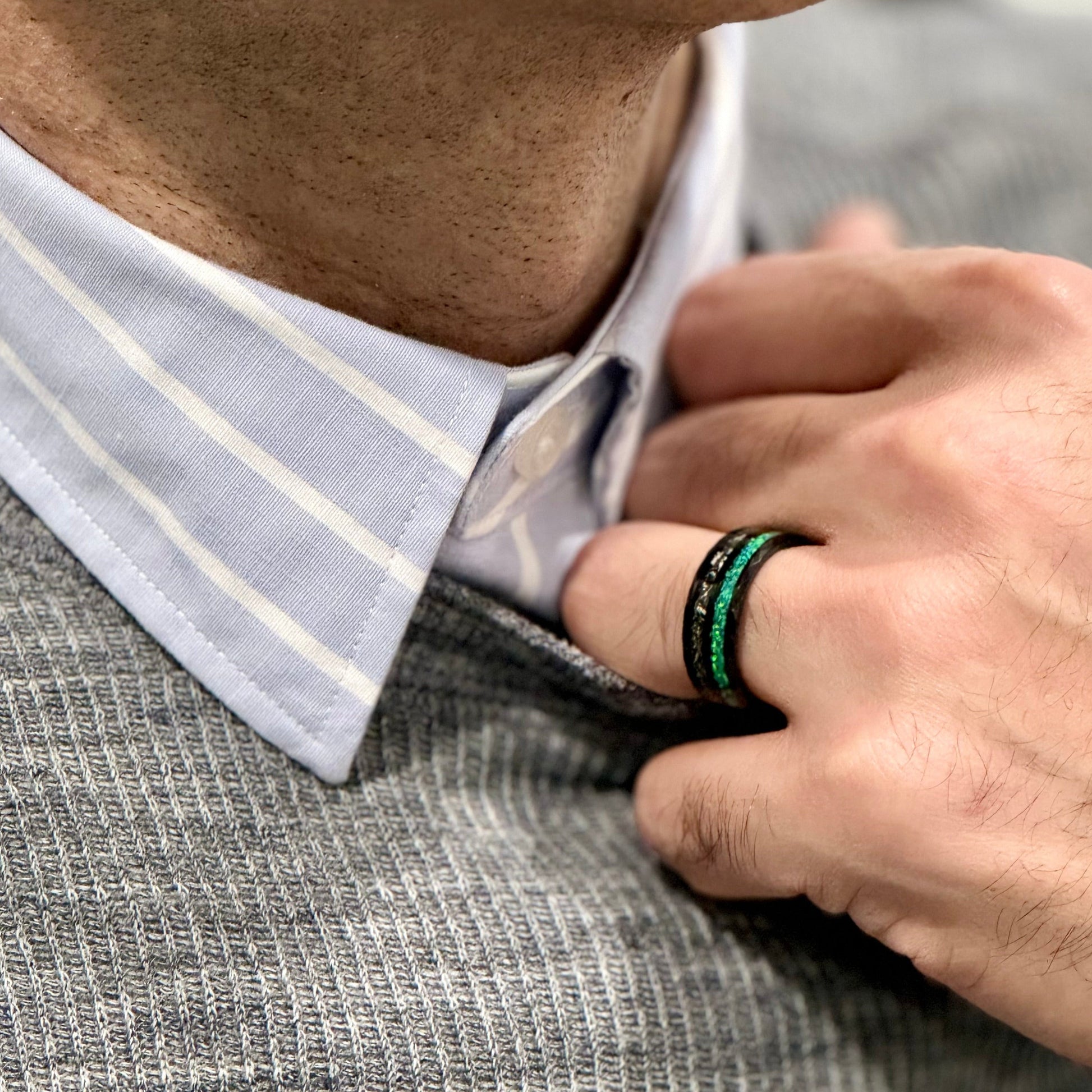Regular price $374.00 Sale price $280.50“CELESTIAL” Tungsten Carbide Black Ring 8mm w/ Meteorite and Crushed Green Opal