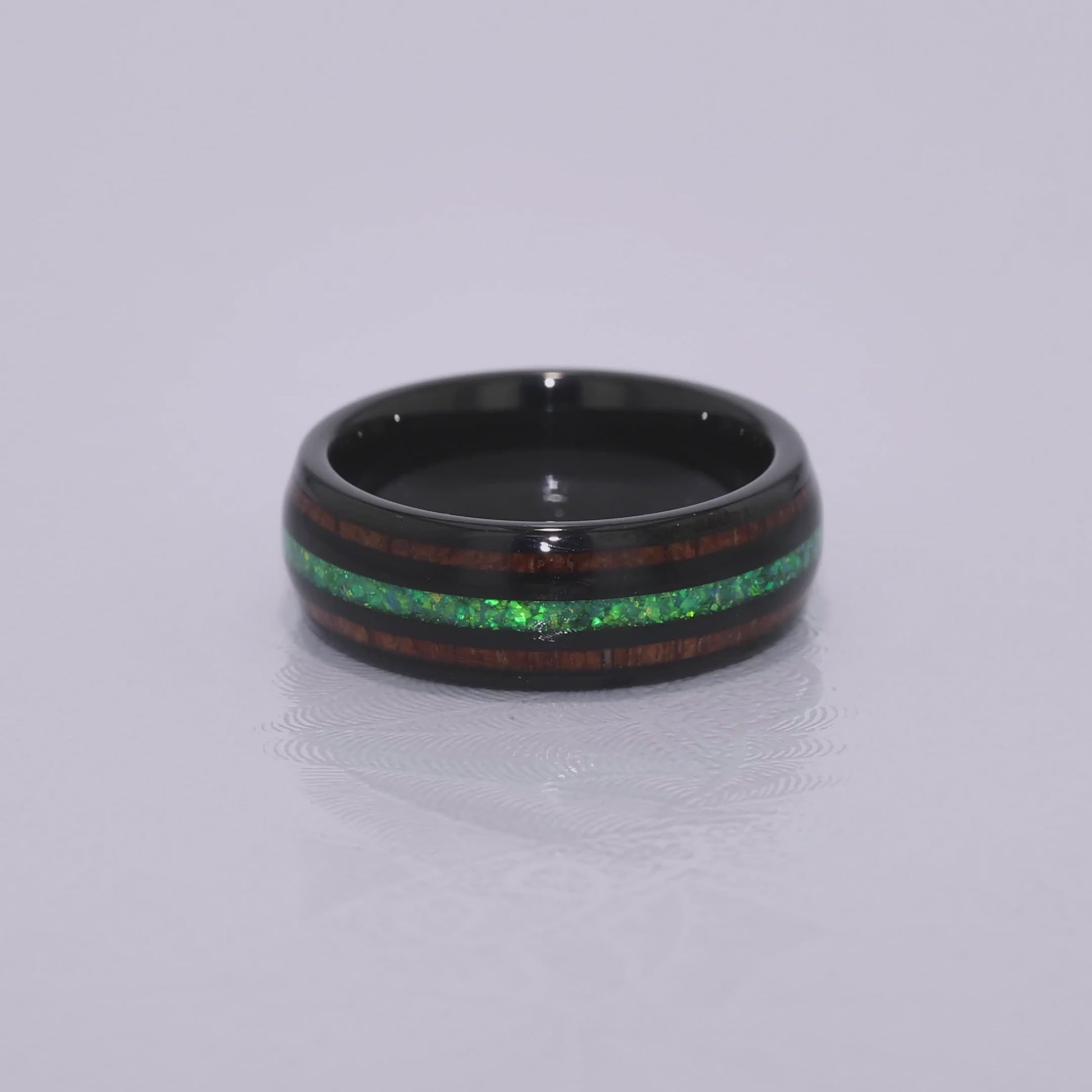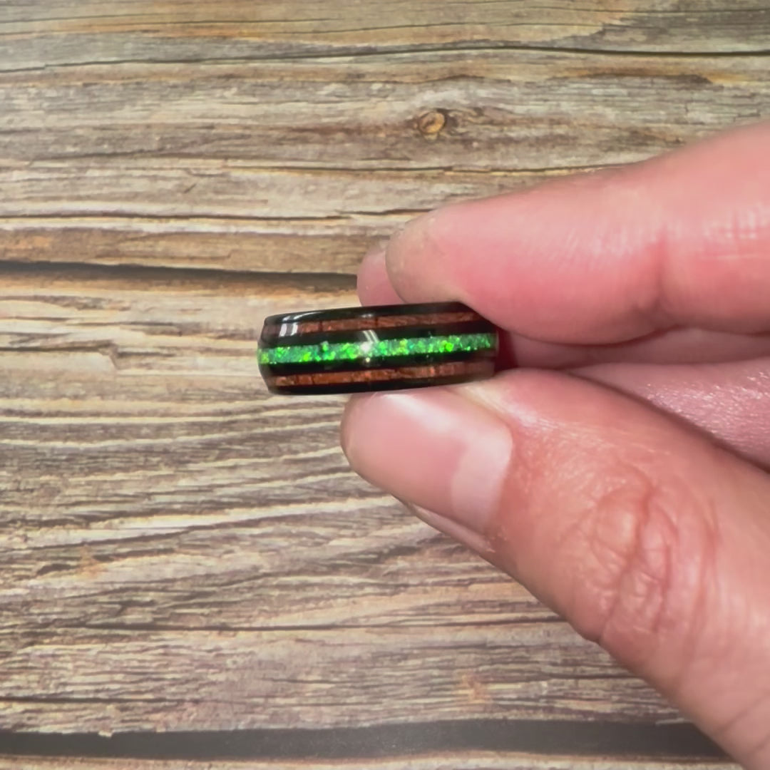"HALO" Tungsten Carbide Black Ring 8mm w/ Green Opal and Koa Wood