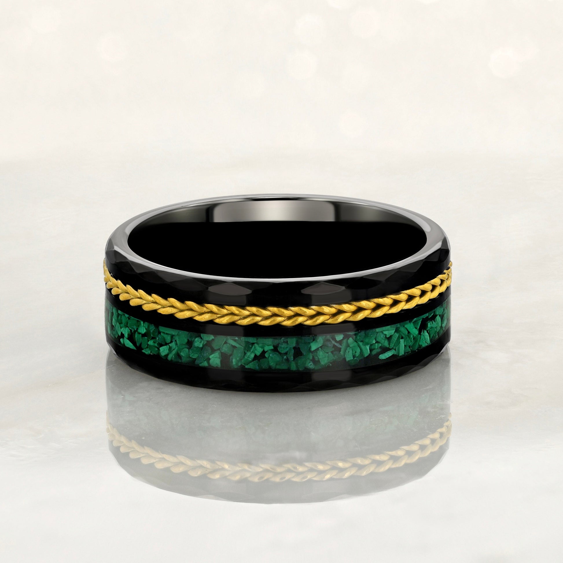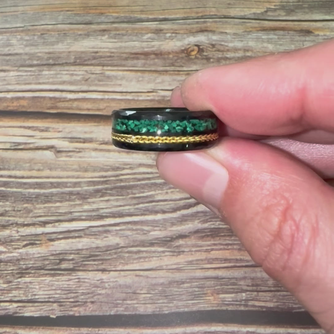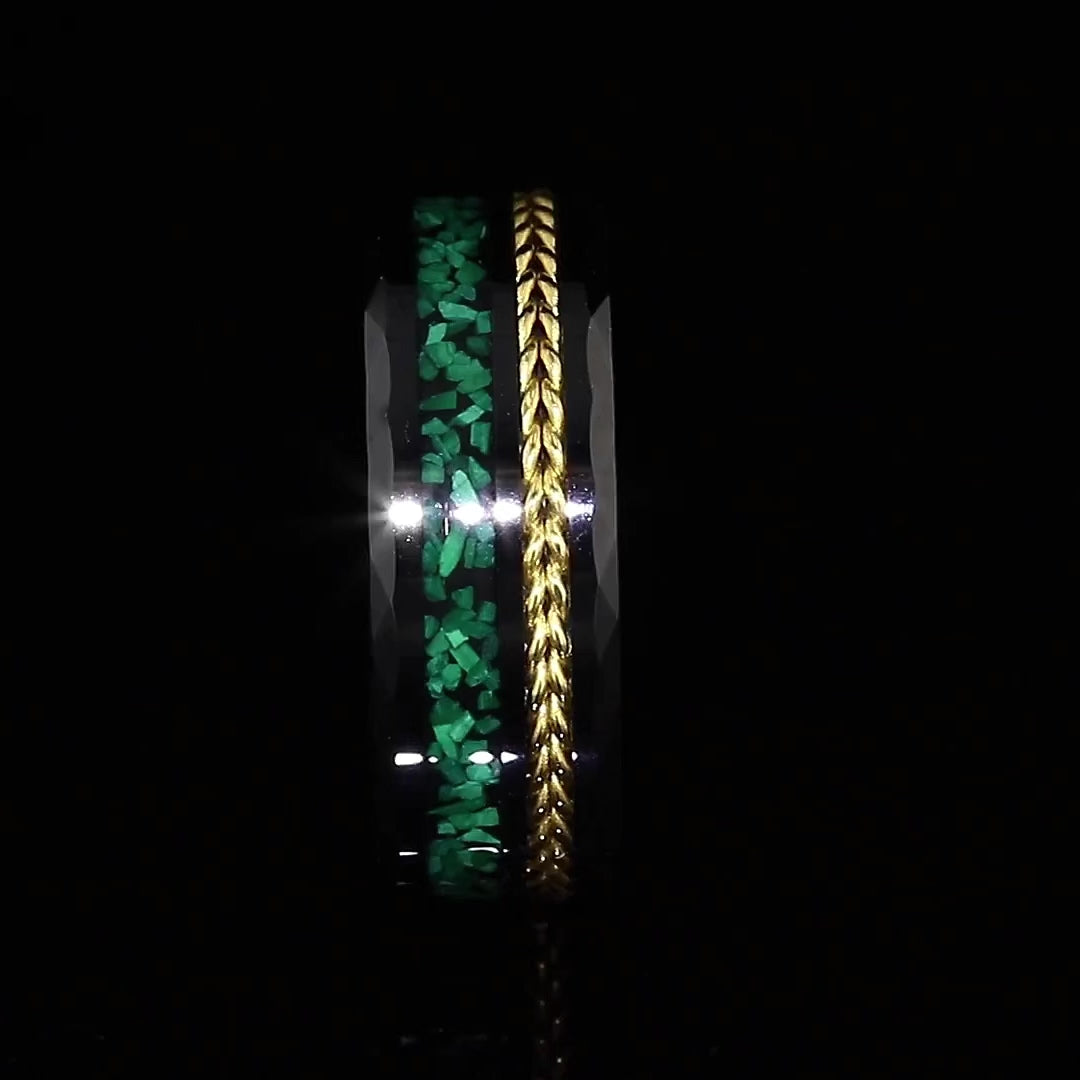 "TETHER" Tungsten Carbide Black Ring 8mm w/ Malachite and Gold Rope