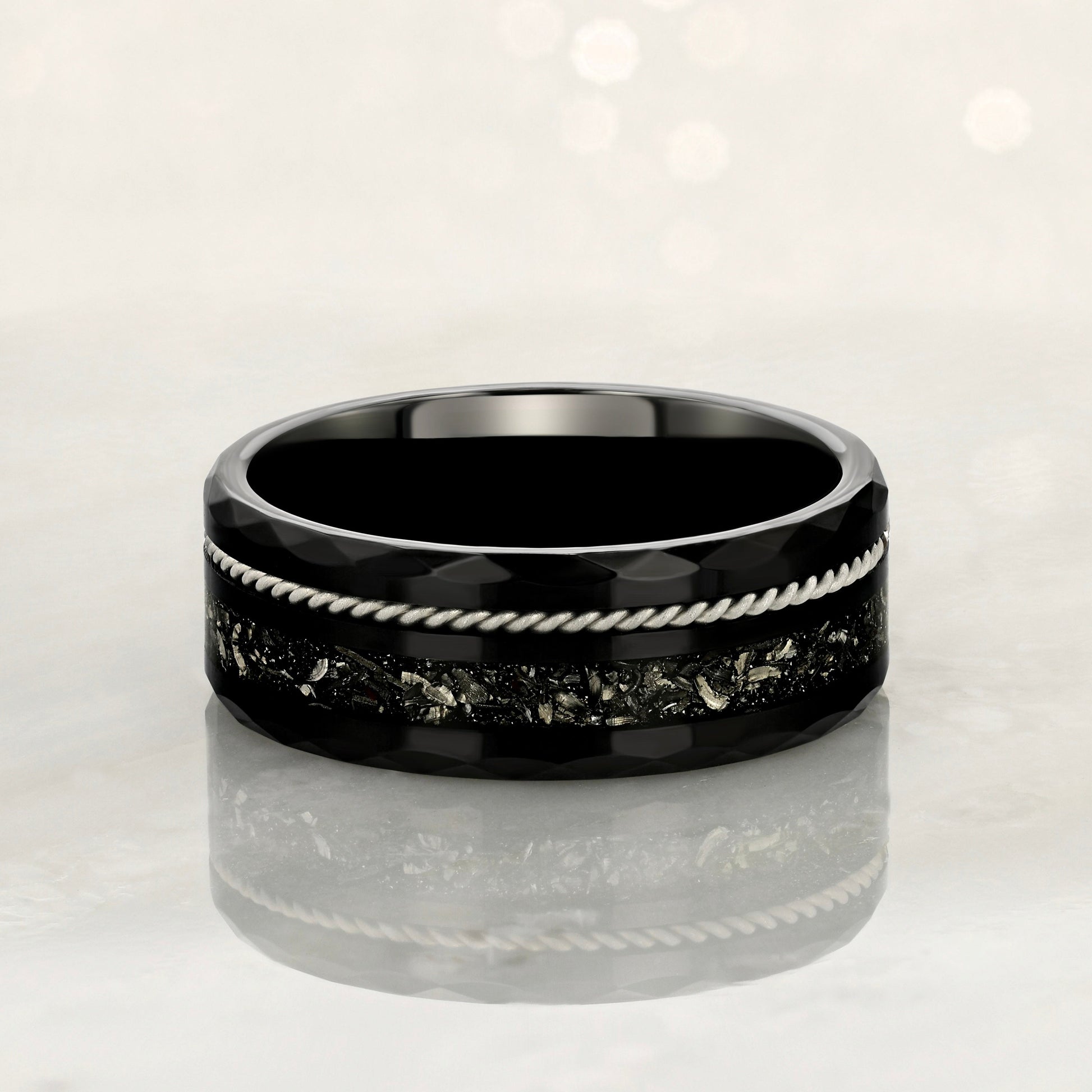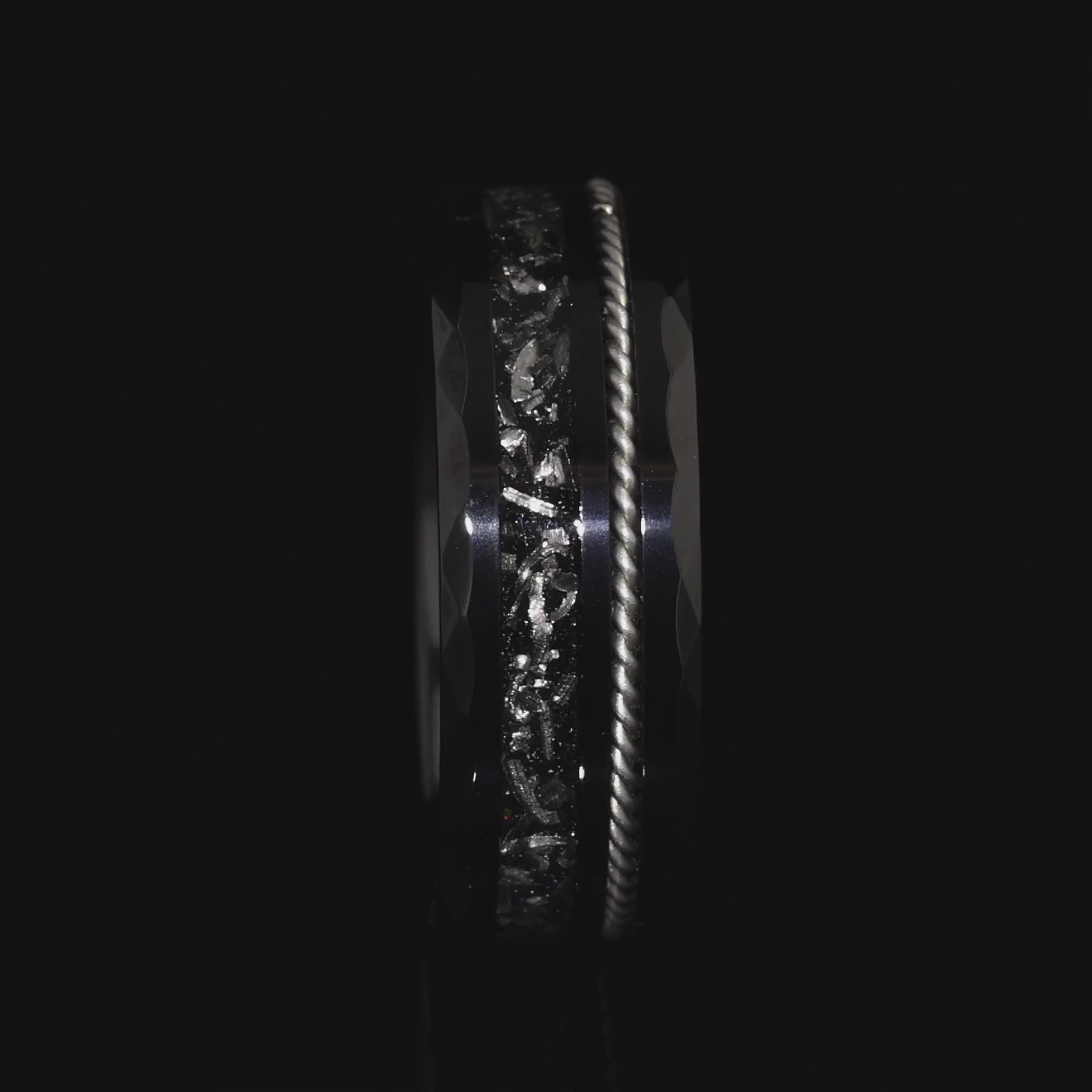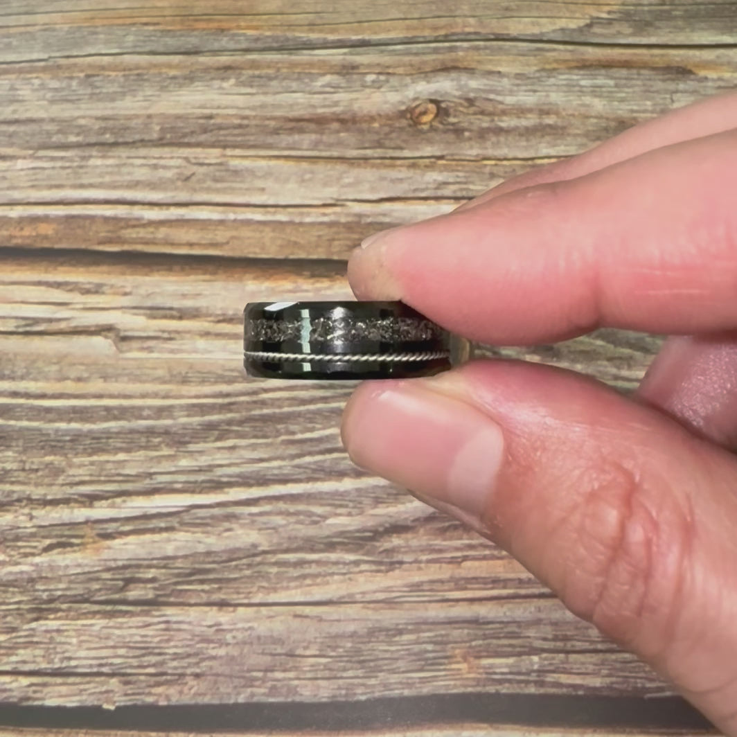 "TETHER" Tungsten Carbide Black Ring 8mm w/ Crushed Meteorite and Silver Rope