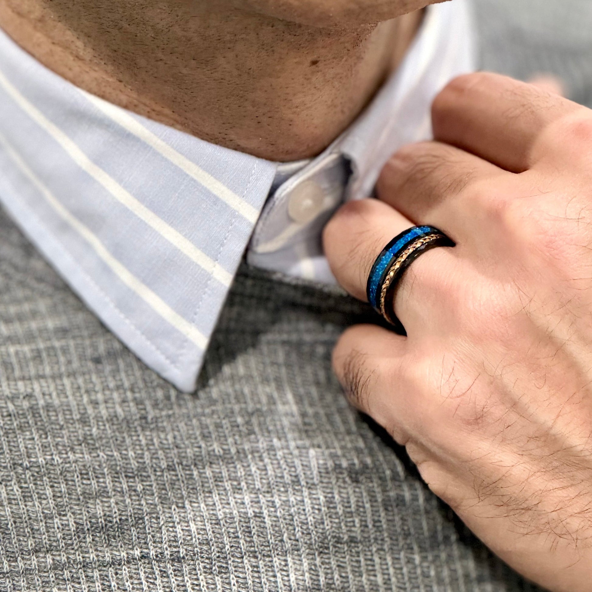 Regular price $299.00 Sale price $224.25"TETHER" Tungsten Carbide Black Ring 8mm w/ Blue Opal and Rose Gold Weave