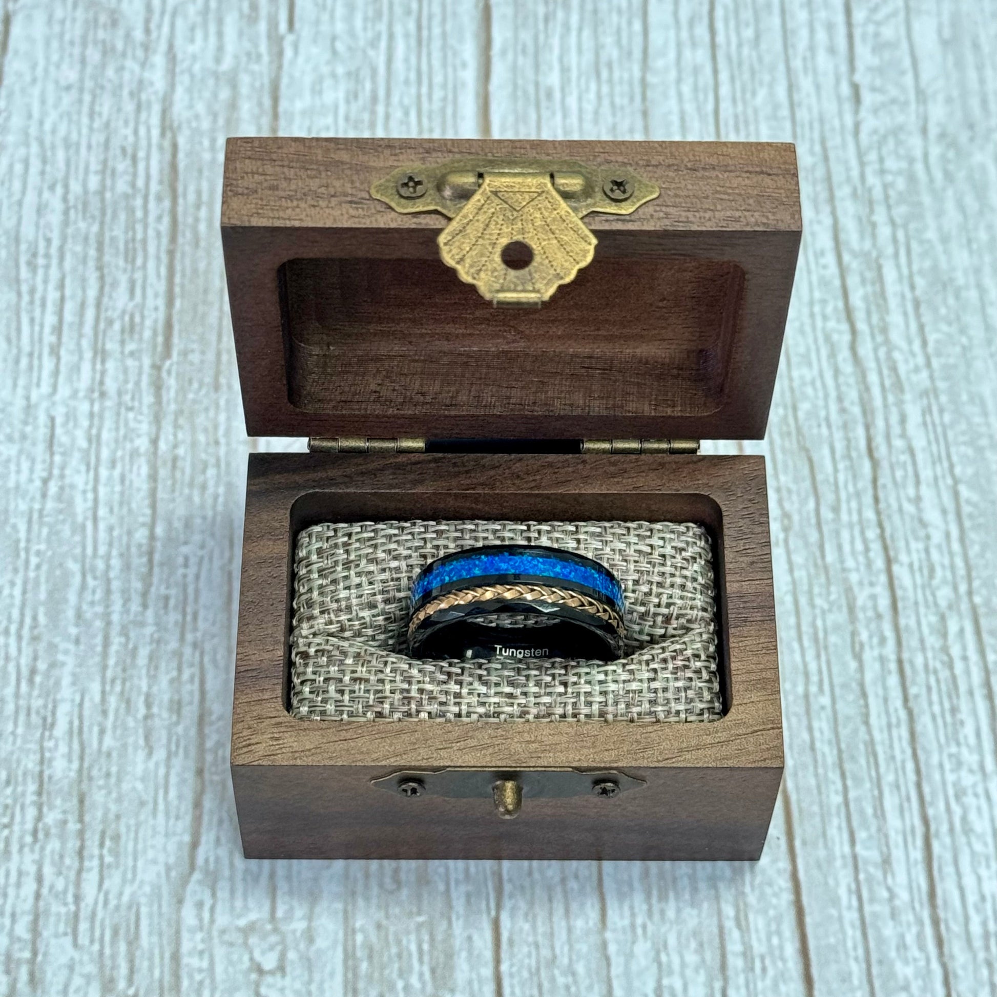 Sale"HALO" Tungsten Carbide Black Ring 8mm w/ Blue Opal and Koa Wood