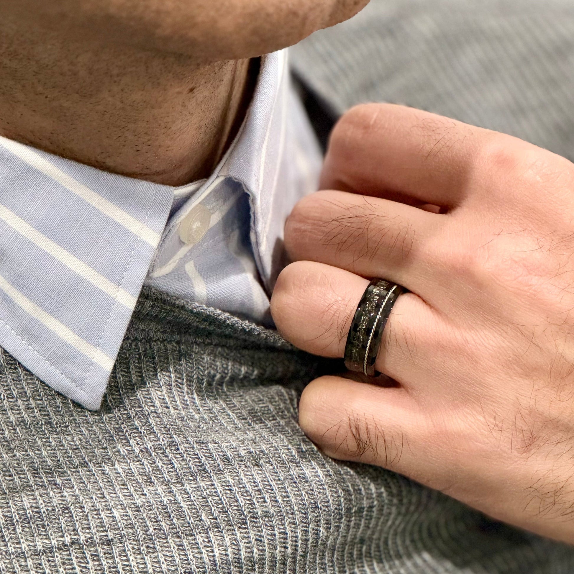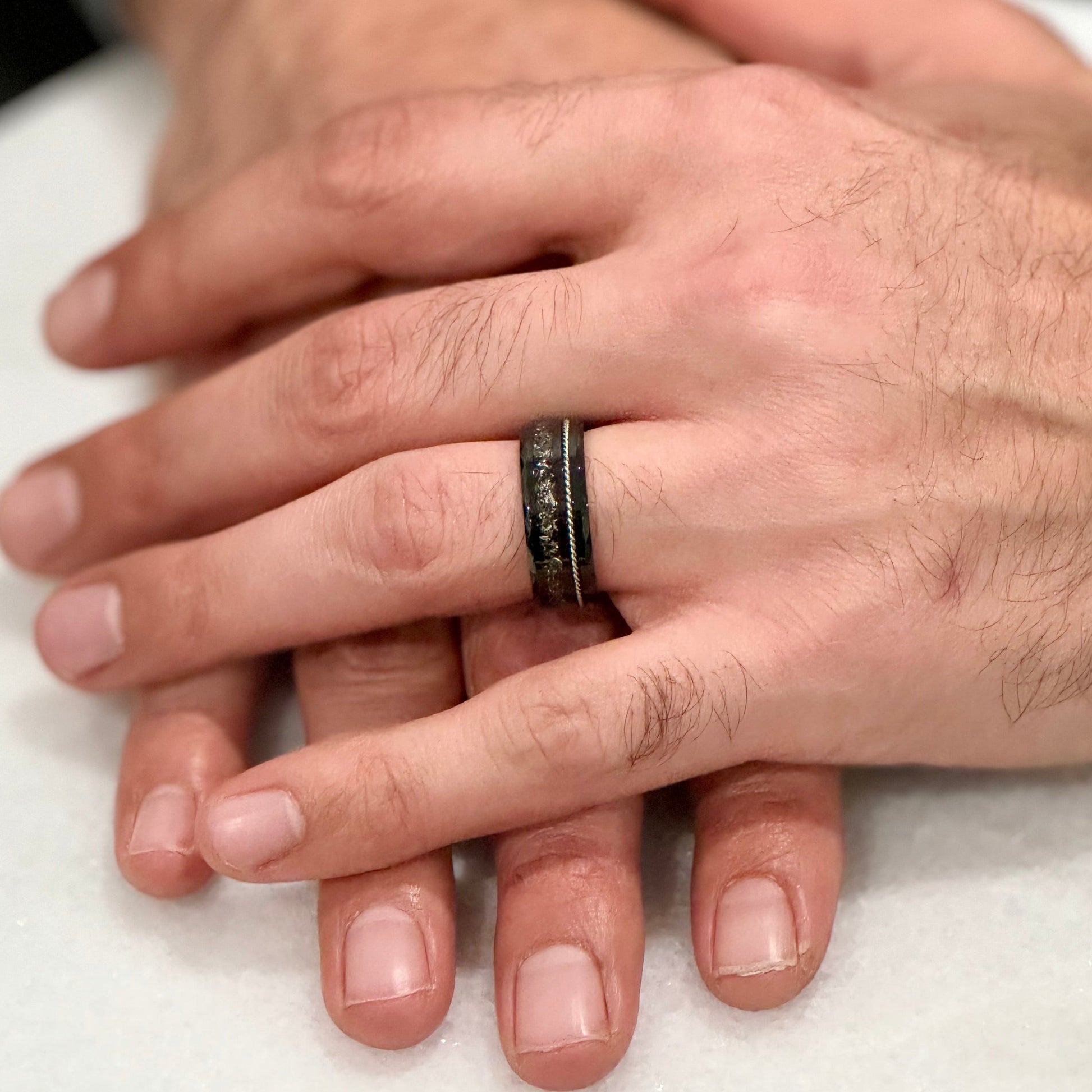 Regular price $337.00 Sale price $252.75"TETHER" Tungsten Carbide Black Ring 8mm w/ Crushed Meteorite and Silver Rope