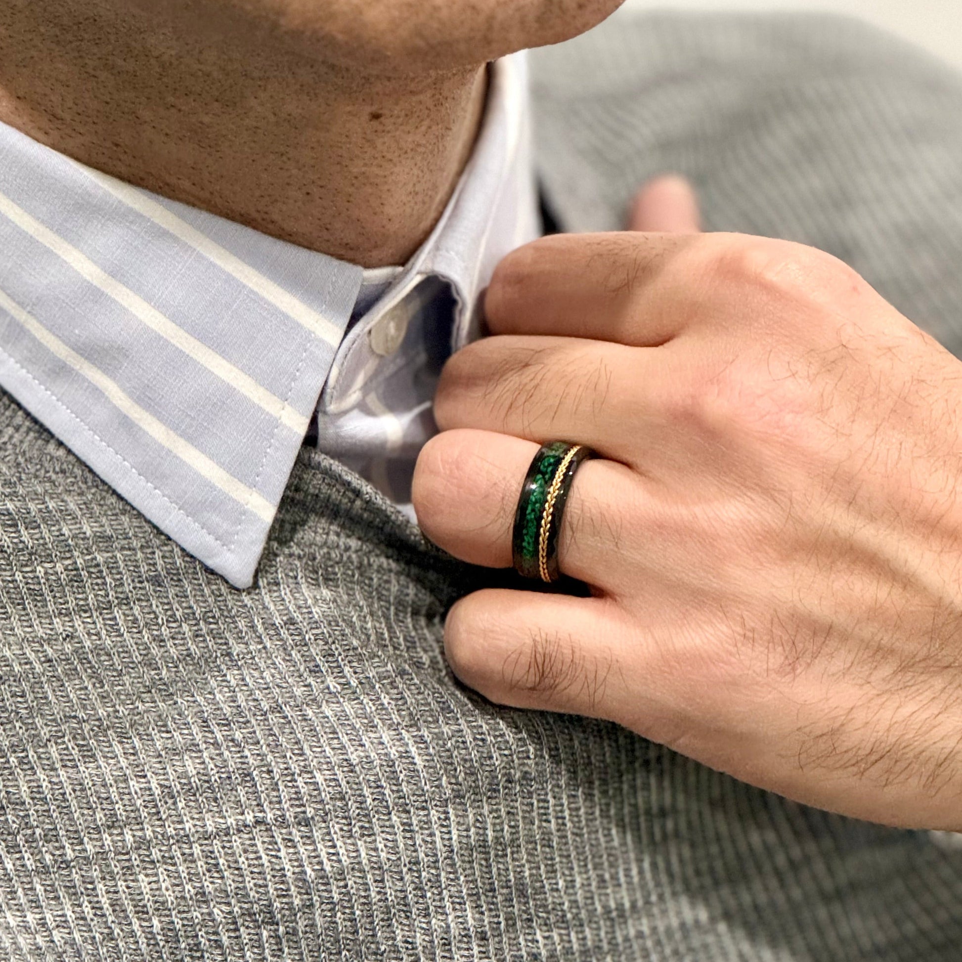 Regular price $306.00 Sale price $229.50"TETHER" Tungsten Carbide Black Ring 8mm w/ Malachite and Gold Rope