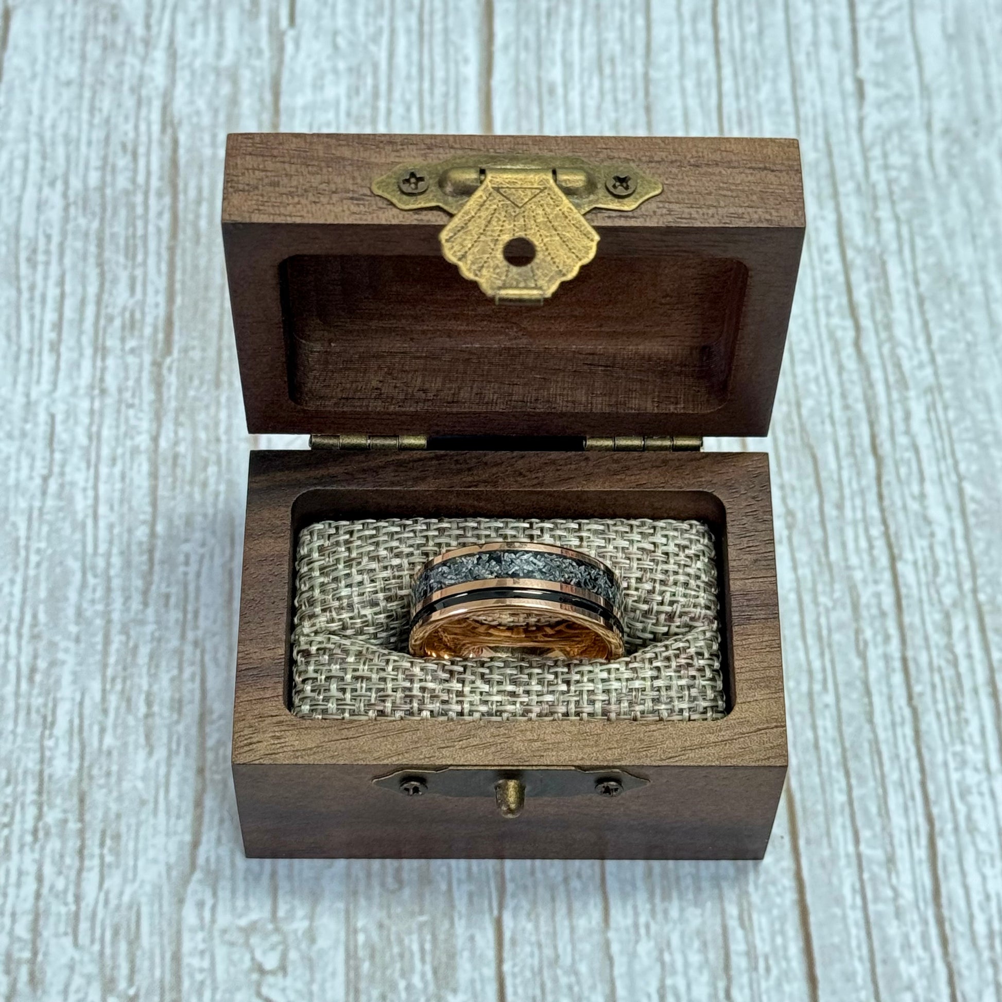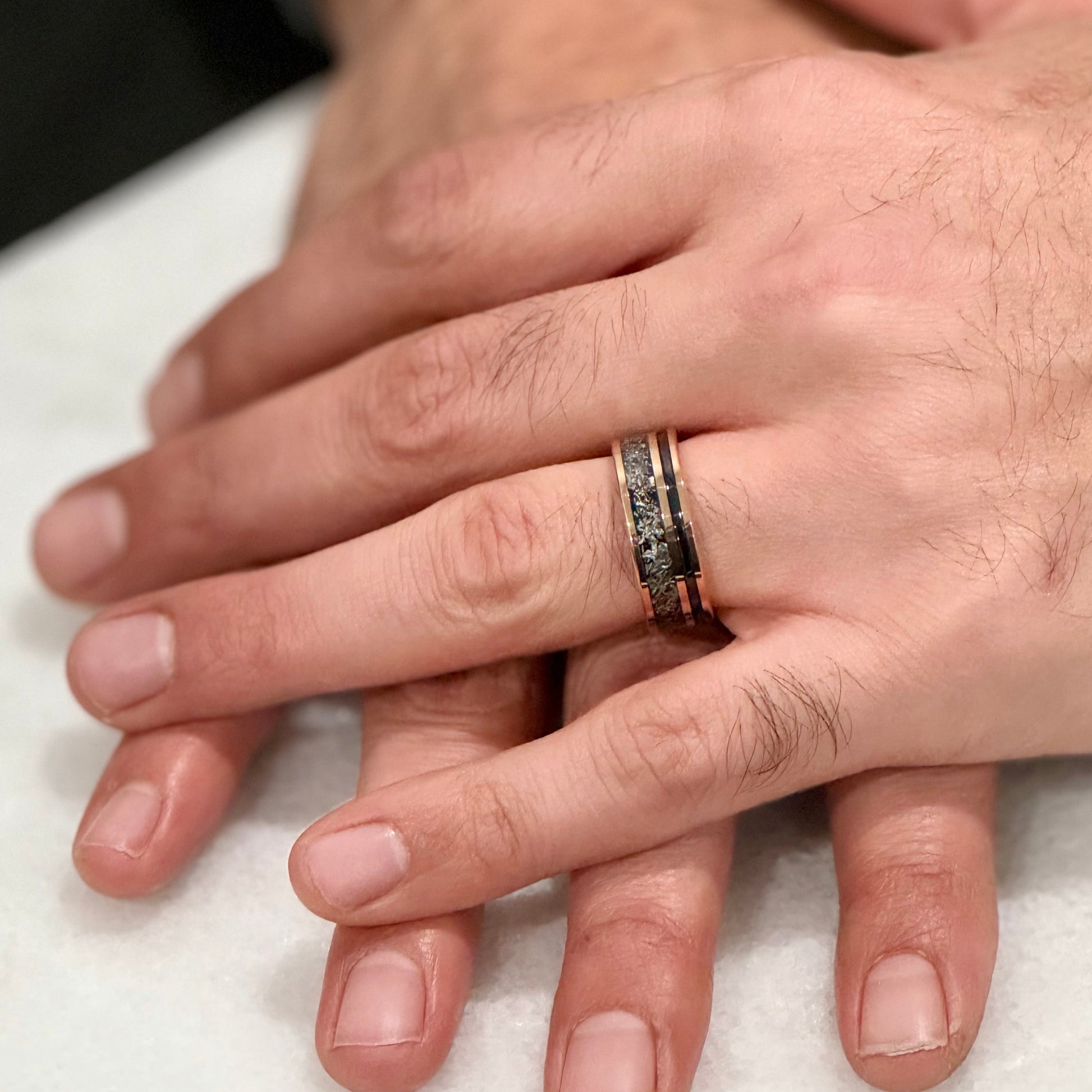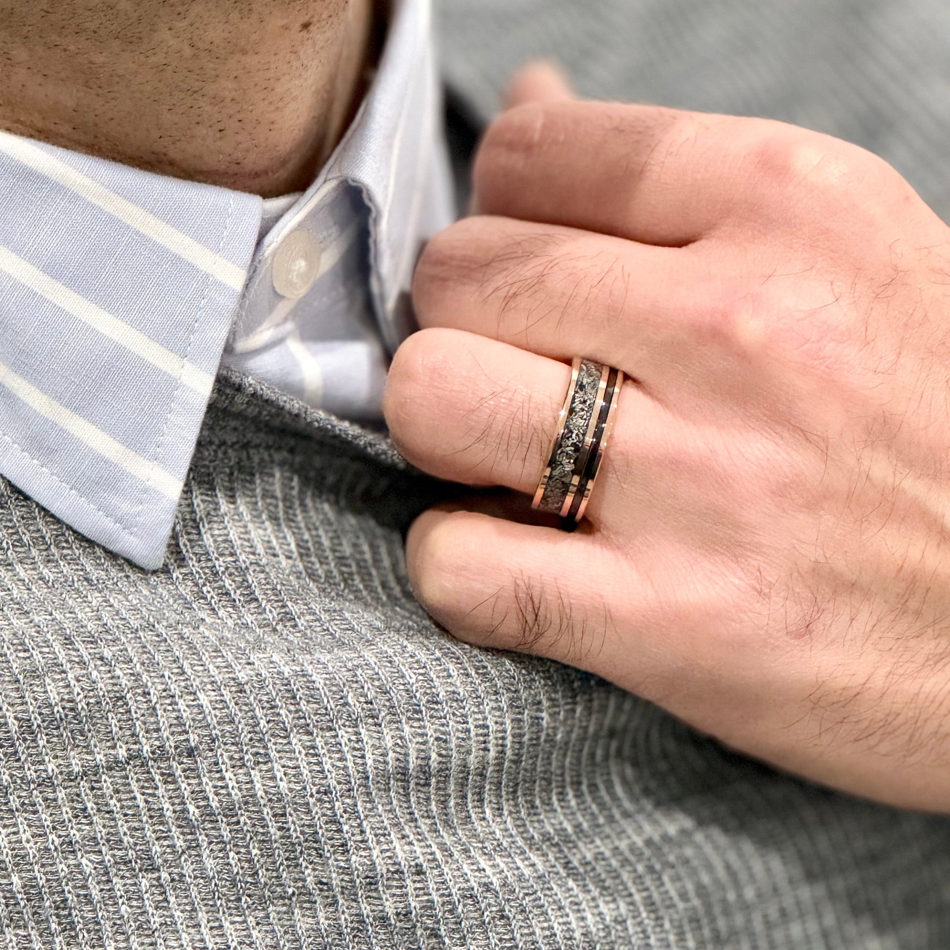 Regular price $303.00 Sale price $227.25“ZENITH” Tungsten Carbide Rose Gold Ring 8mm w/ Crushed Meteorite and Black Line