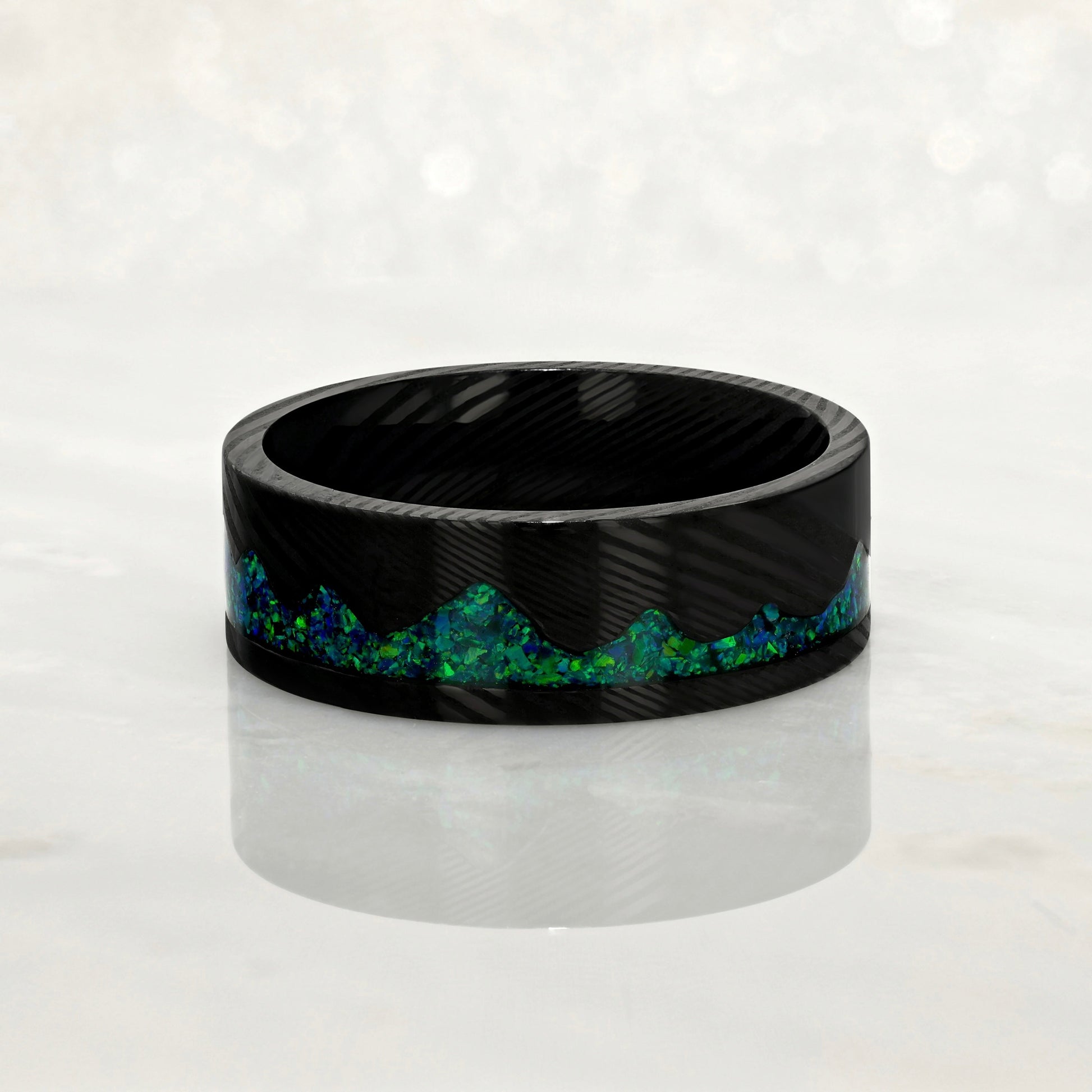 Sale“ARTISAN” Damascus Steel Black Ring 8mm w/Green Opal Mountain Carving