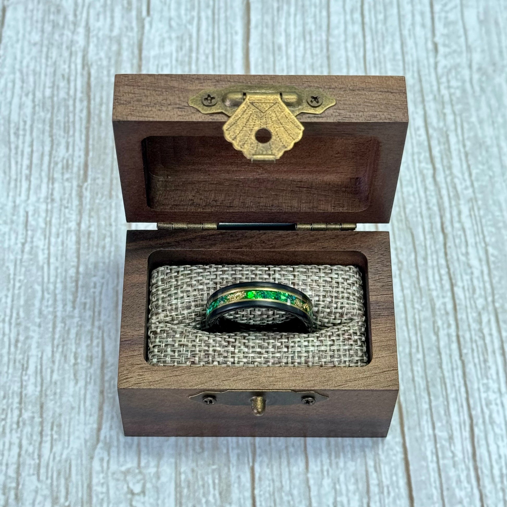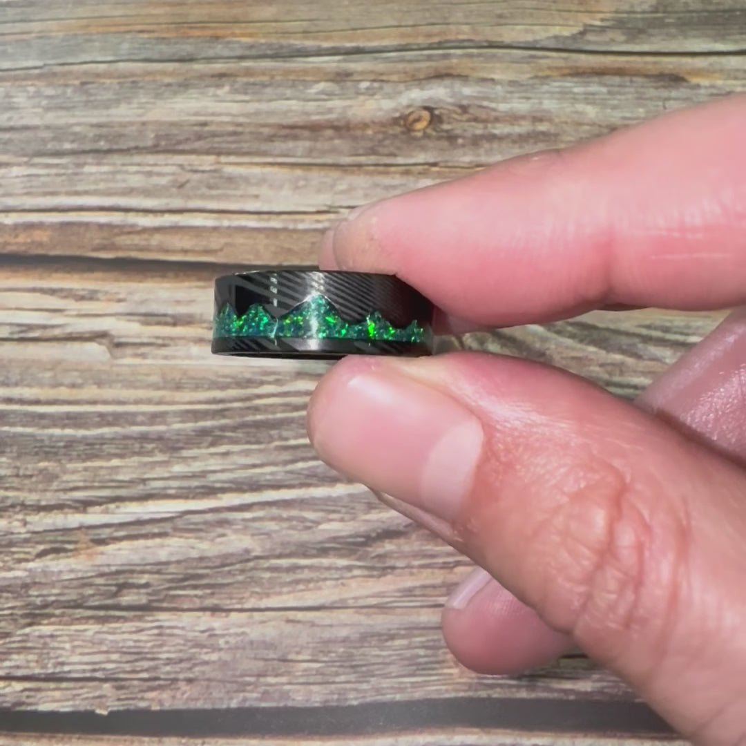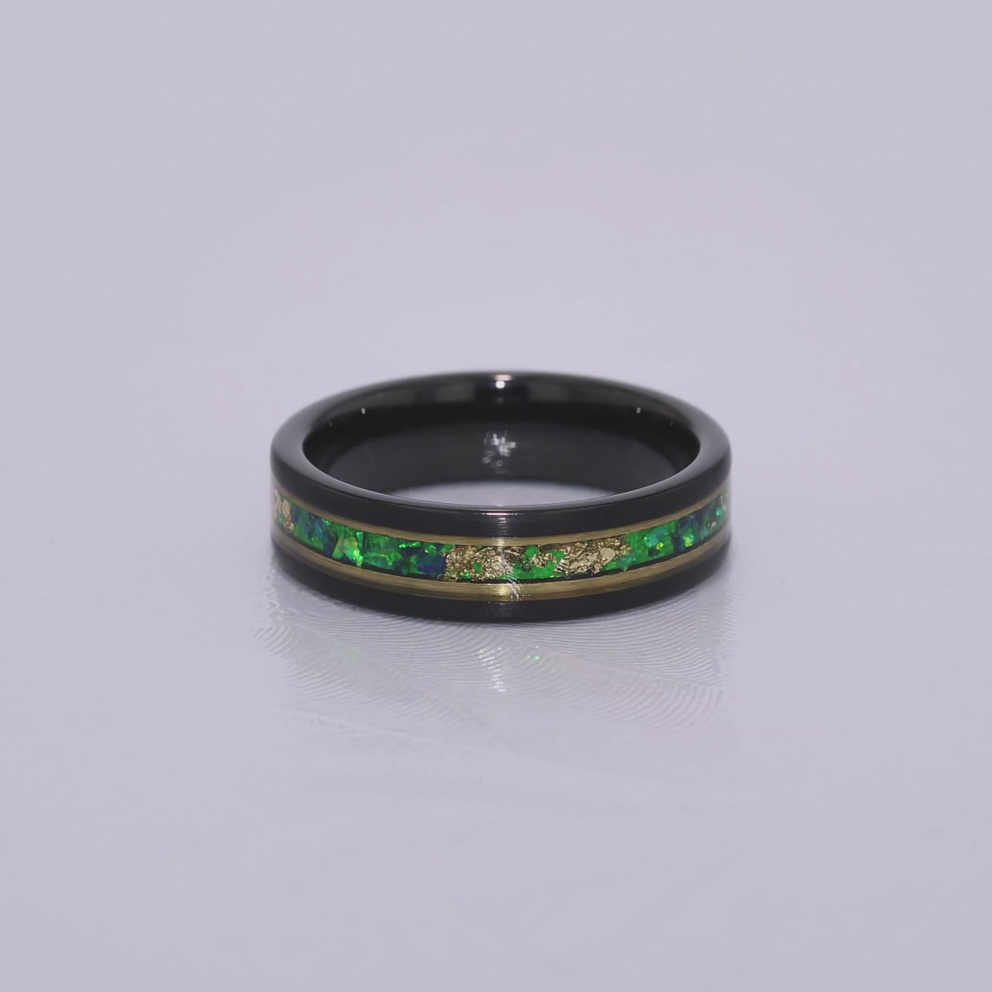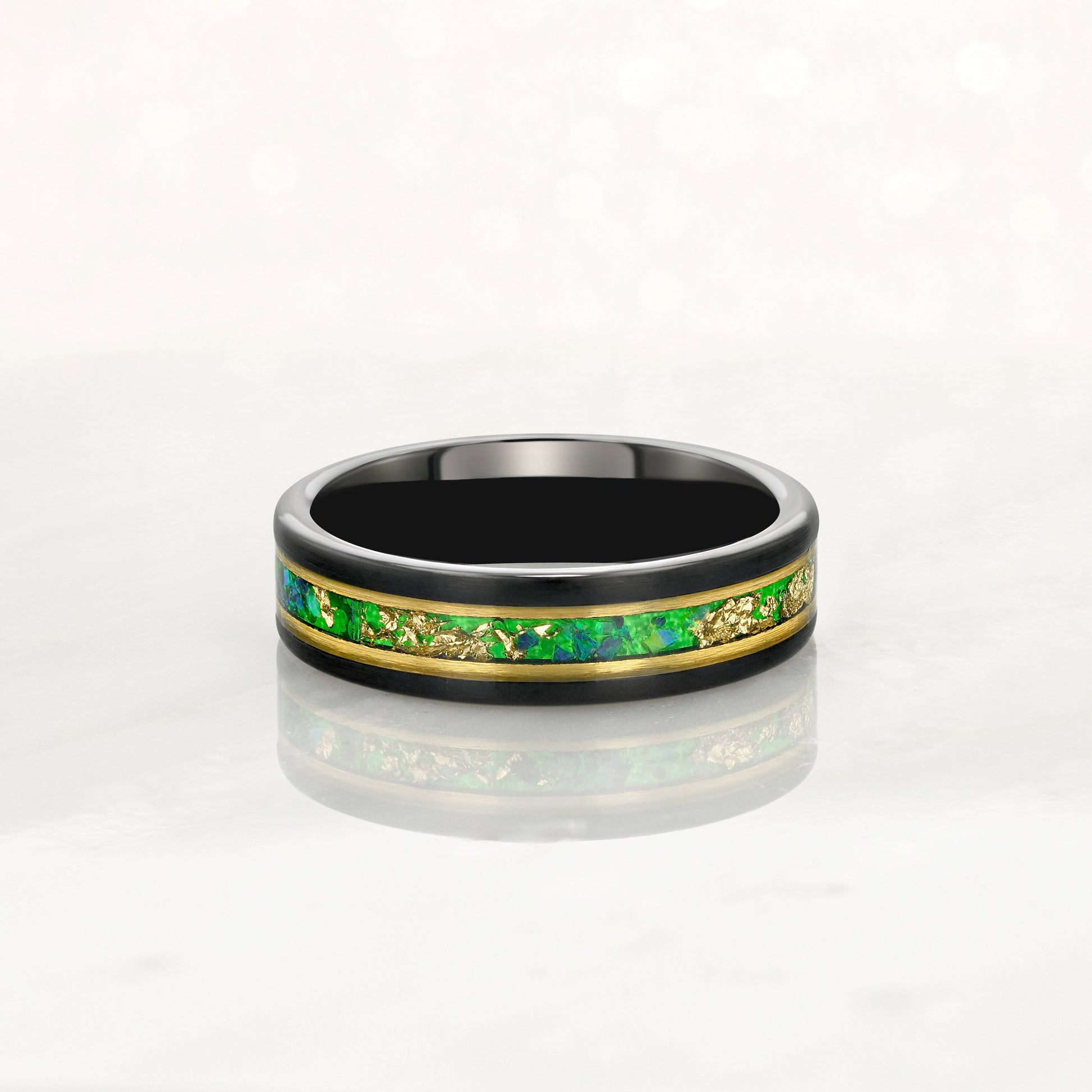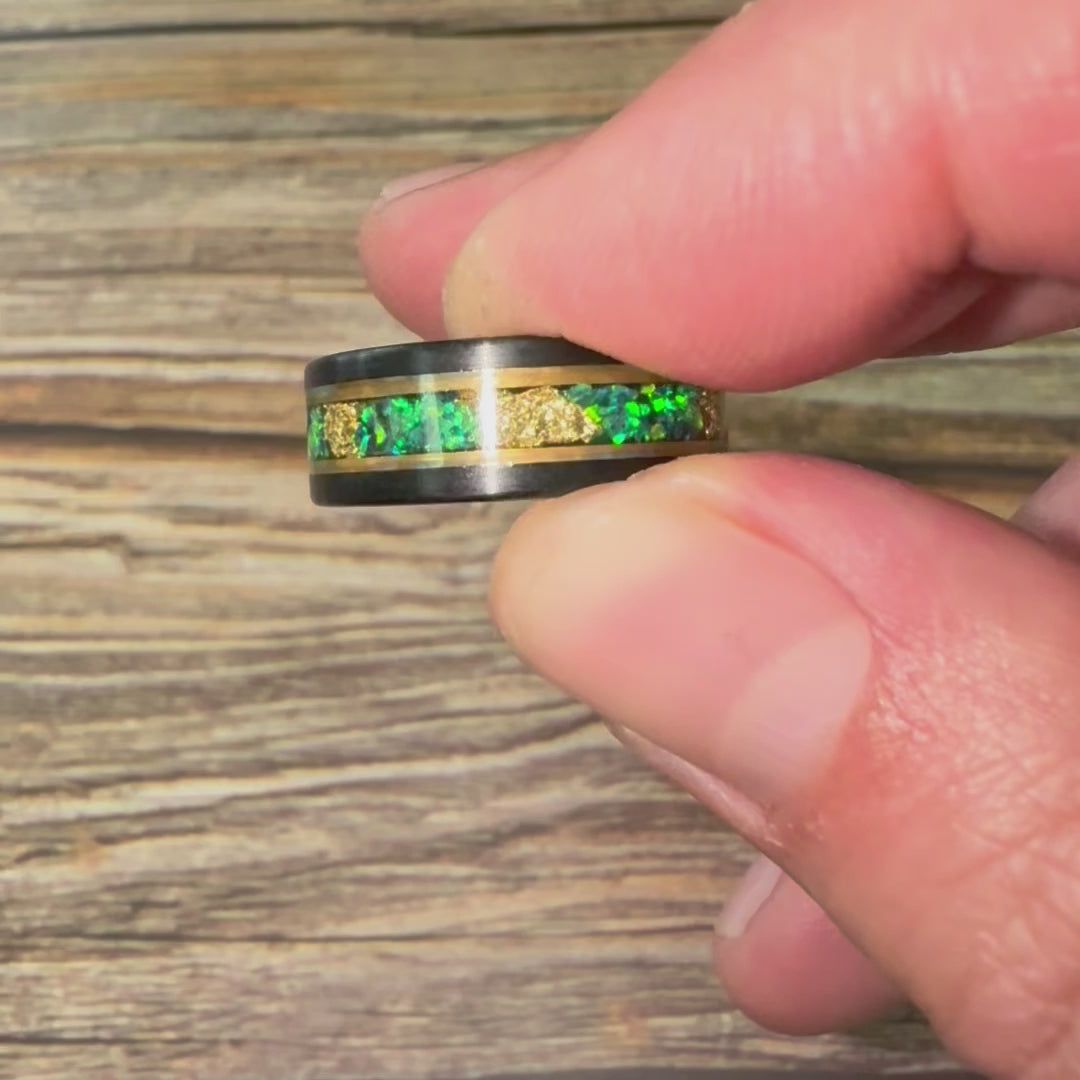 “Binary" Tungsten Carbide Black Ring 6mm, 8mm w/ Green Opal, Gold Accents and Gold Leaf