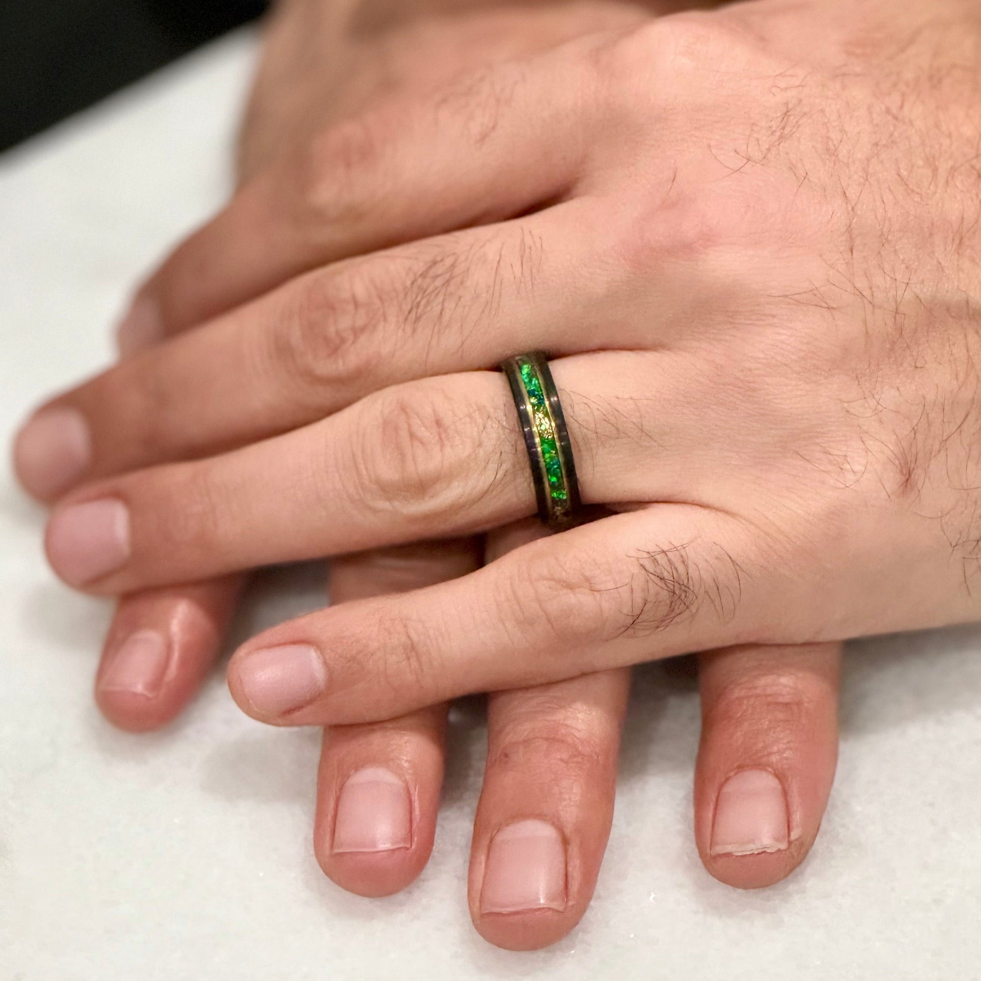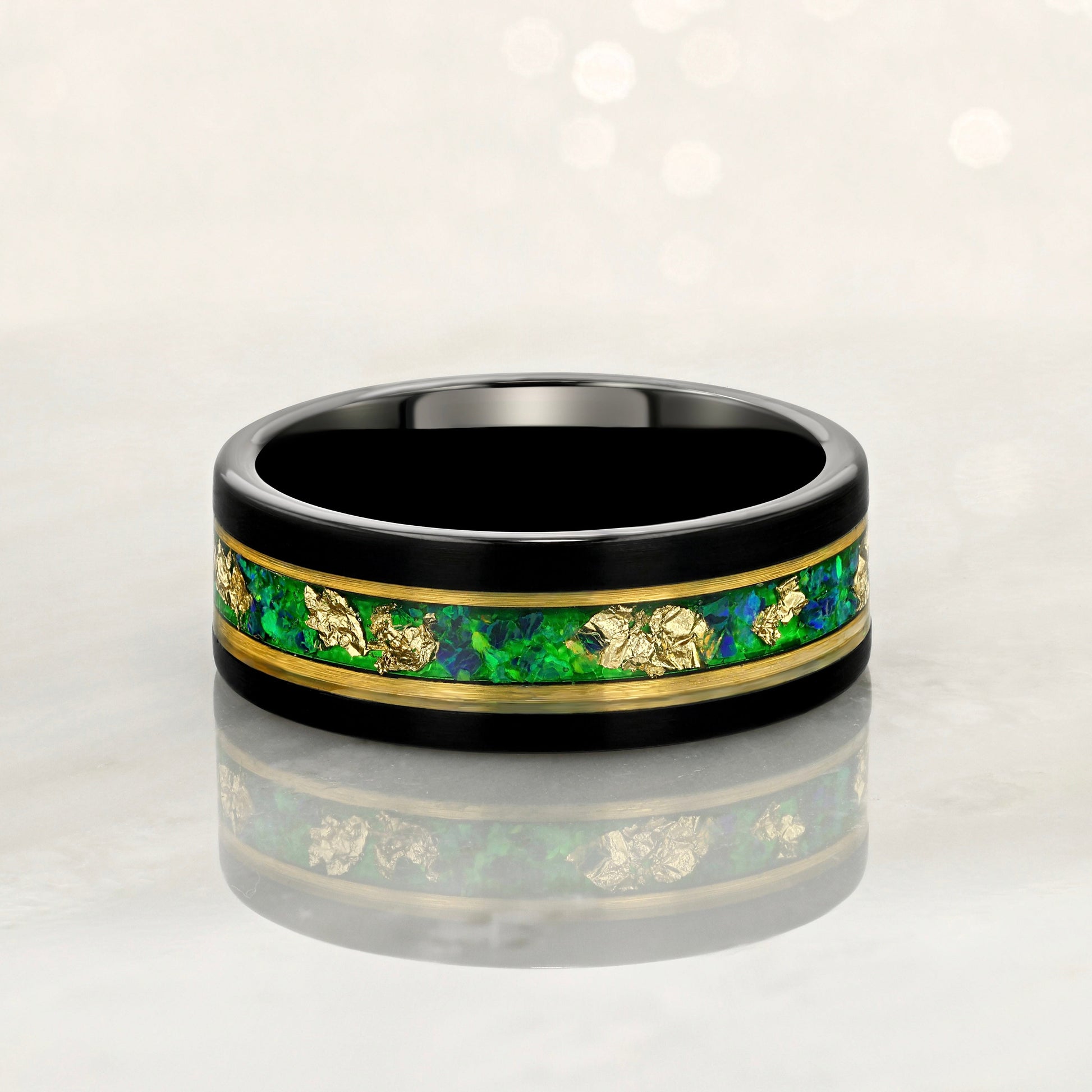 (Couples) “Binary" Tungsten Carbide Black Ring 8mm, 6mm w/ Green Opal, Gold Accents and Gold Leaf