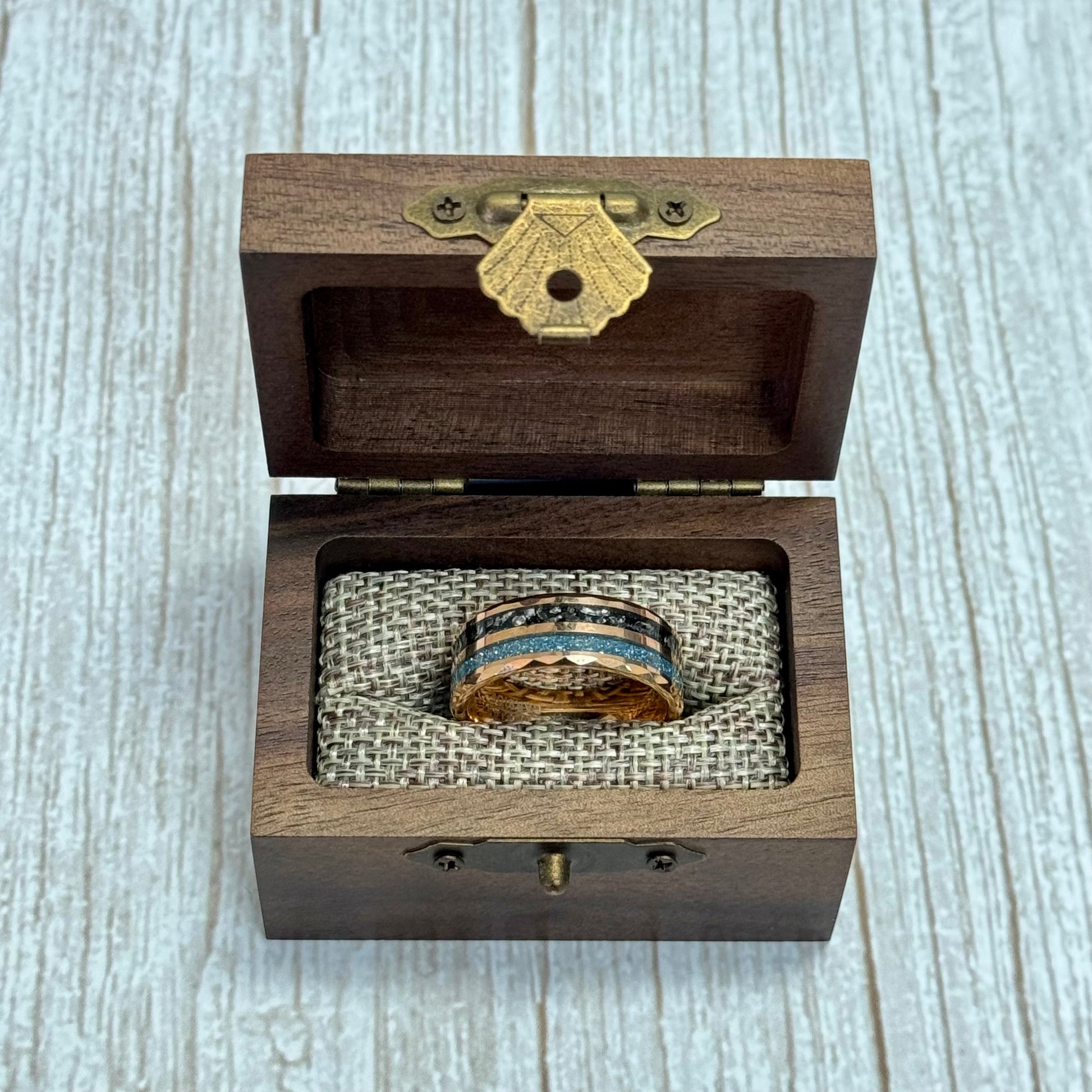 Regular price $299.00 Sale price $224.25"TETHER" Tungsten Carbide Black Ring 8mm w/ Blue Opal and Rose Gold Weave