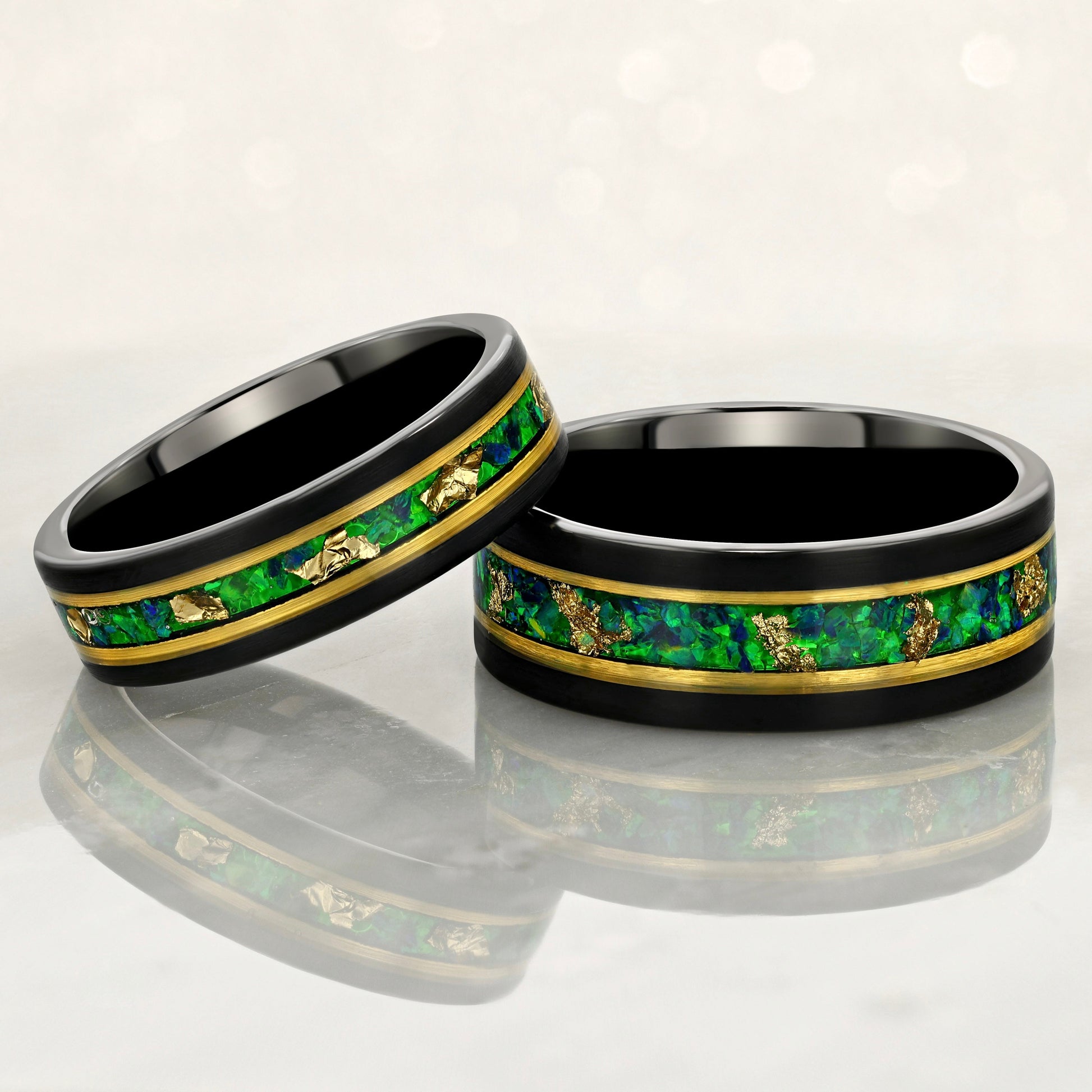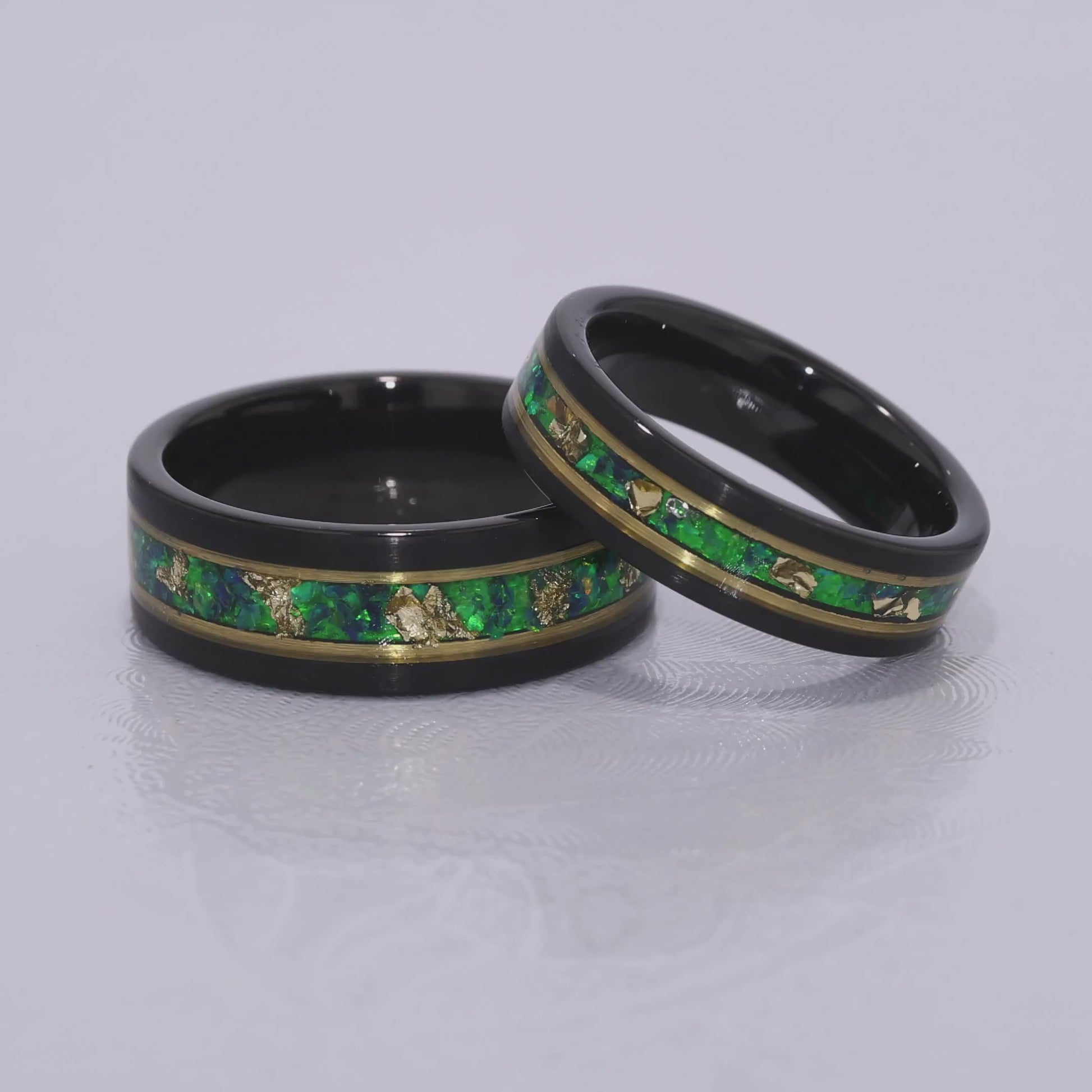Sale(Couples) “Binary" Tungsten Carbide Black Ring 8mm, 6mm w/ Green Opal, Gold Accents and Gold Leaf