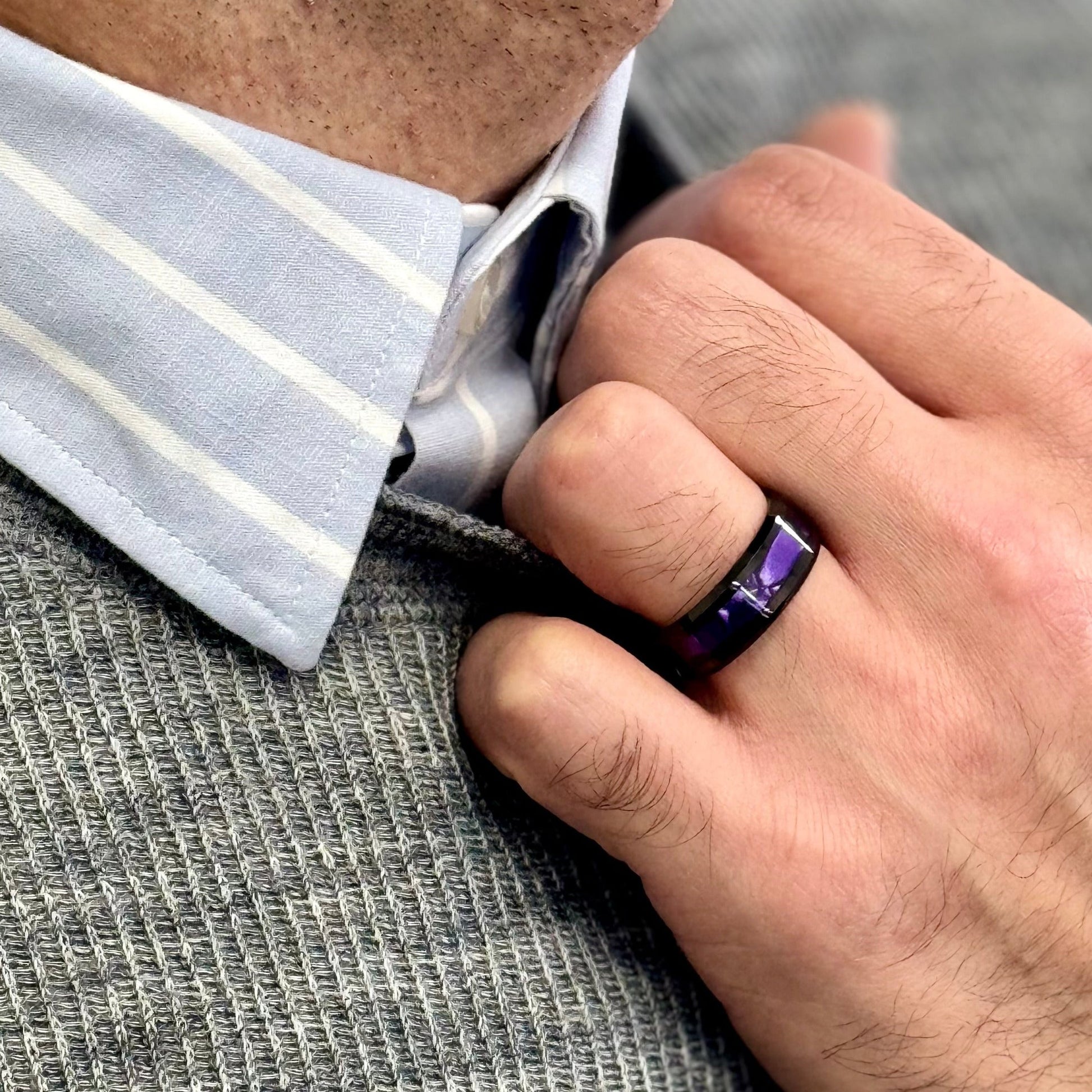 Regular price $265.00 Sale price $198.75"ENIGMA" Tungsten Carbide Black Ring 8mm w/ Purple Agate