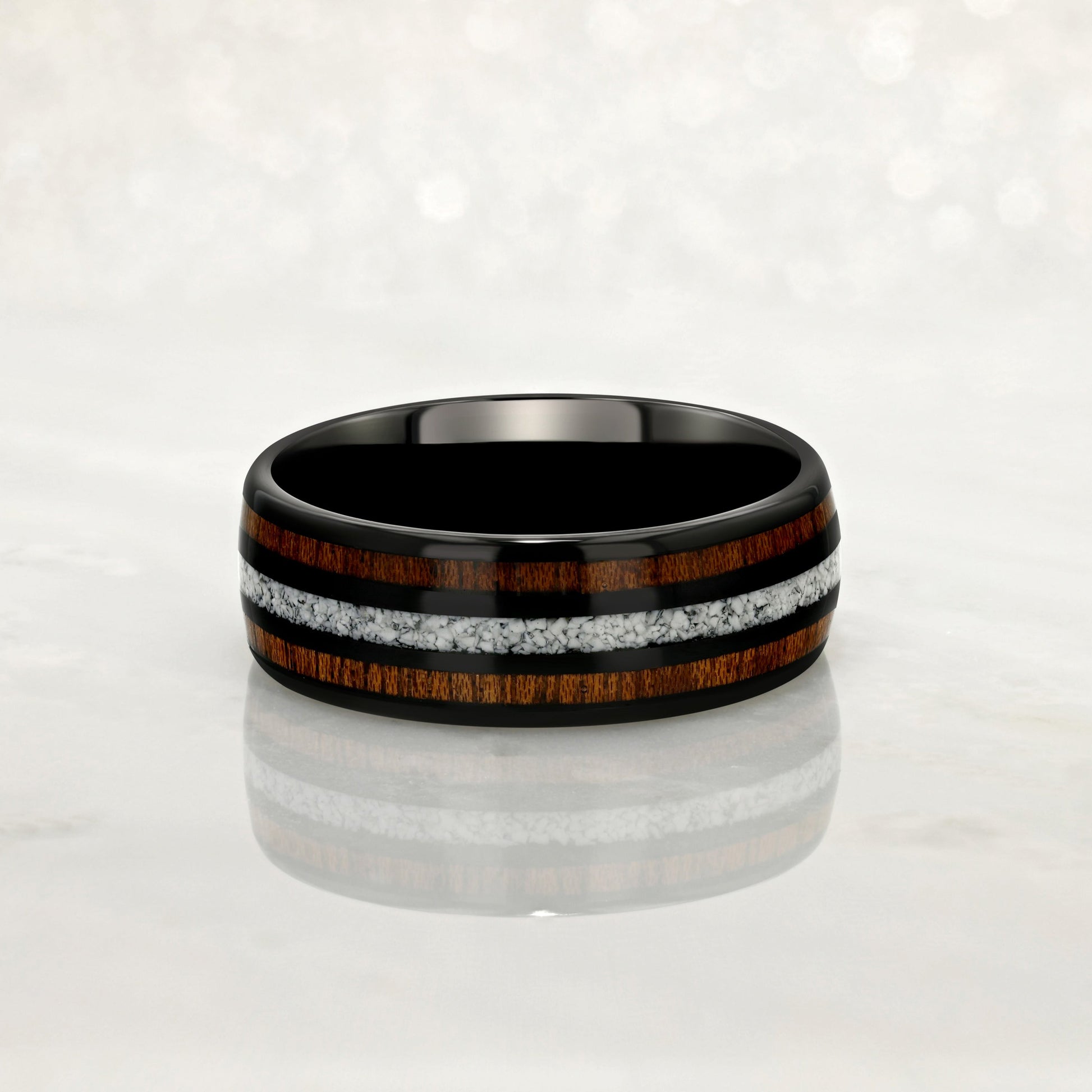 Regular price $275.00 Sale price $206.25"HALO" Tungsten Carbide Black Ring 8mm w/ White Turquoise and Koa Wood