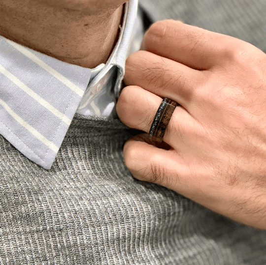 Regular price $295.00 Sale price $221.25"SYNTHESIS" Tungsten Carbide Black Ring 8mm w/ Whiskey Barrel, Opal and Guitar String