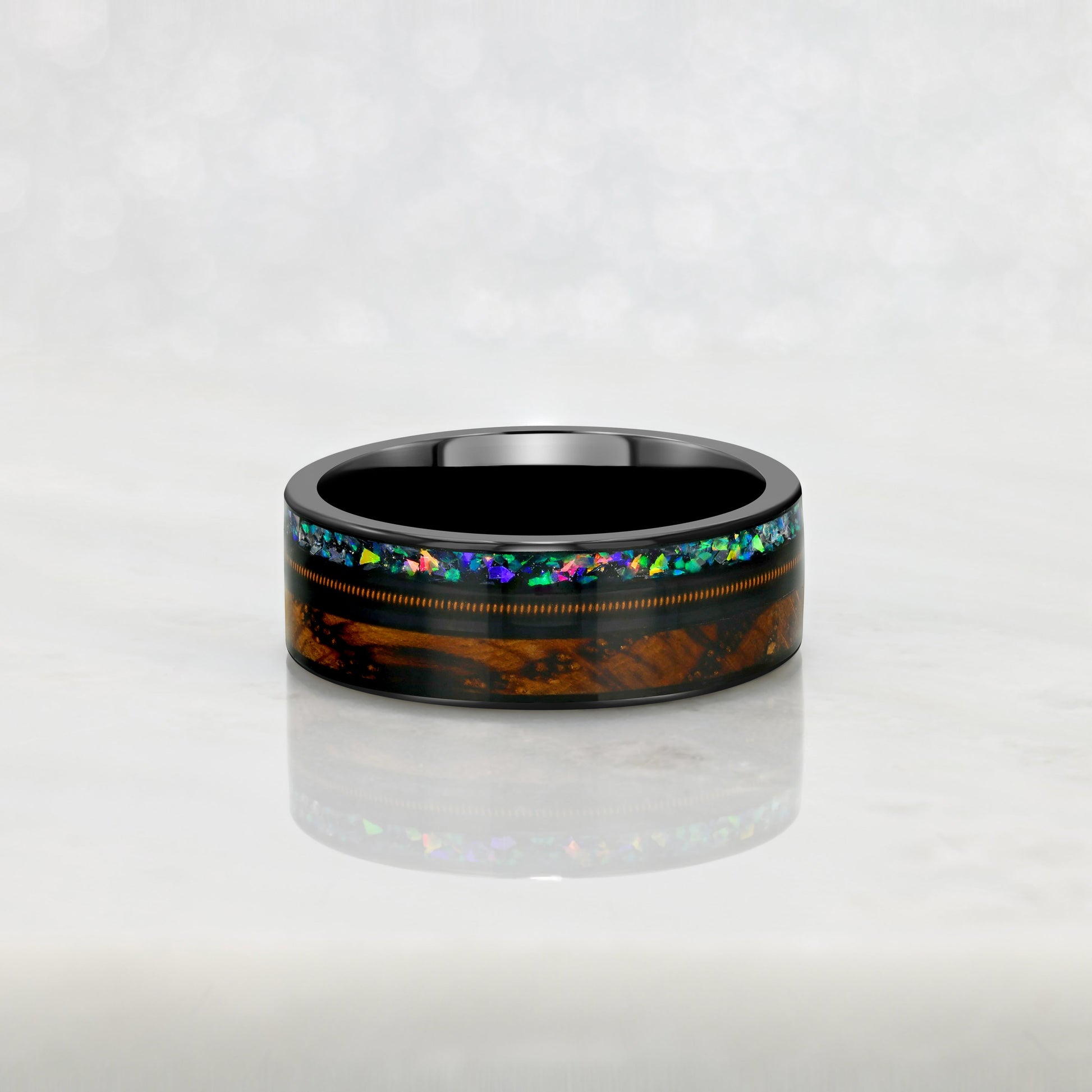 "SYNTHESIS" Tungsten Carbide Black Ring 8mm w/ Whiskey Barrel, Opal and Guitar String