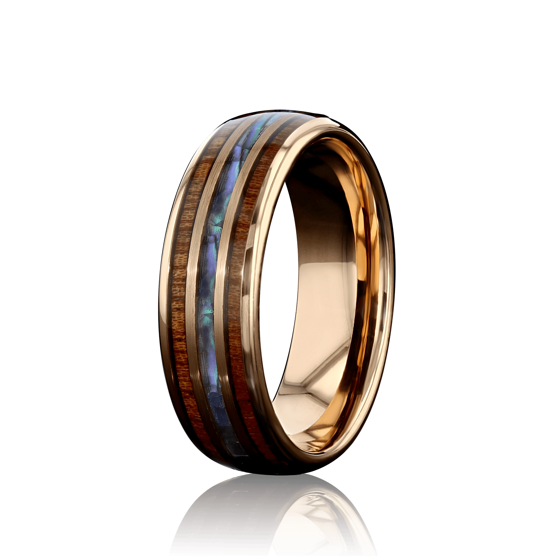 "HALO" Tungsten Carbide Rose Gold Ring 8mm w/ Abalone and Koa Wood