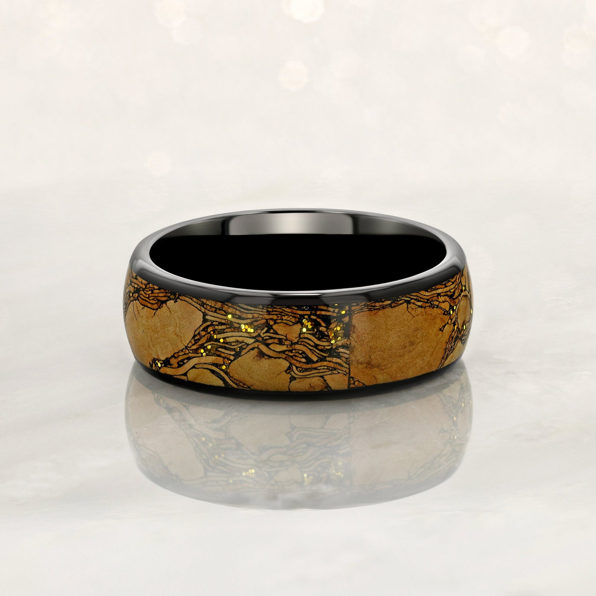 Sale"SYNTHESIS" Tungsten Carbide Black Ring 8mm w/ Whiskey Barrel, Opal and Guitar String