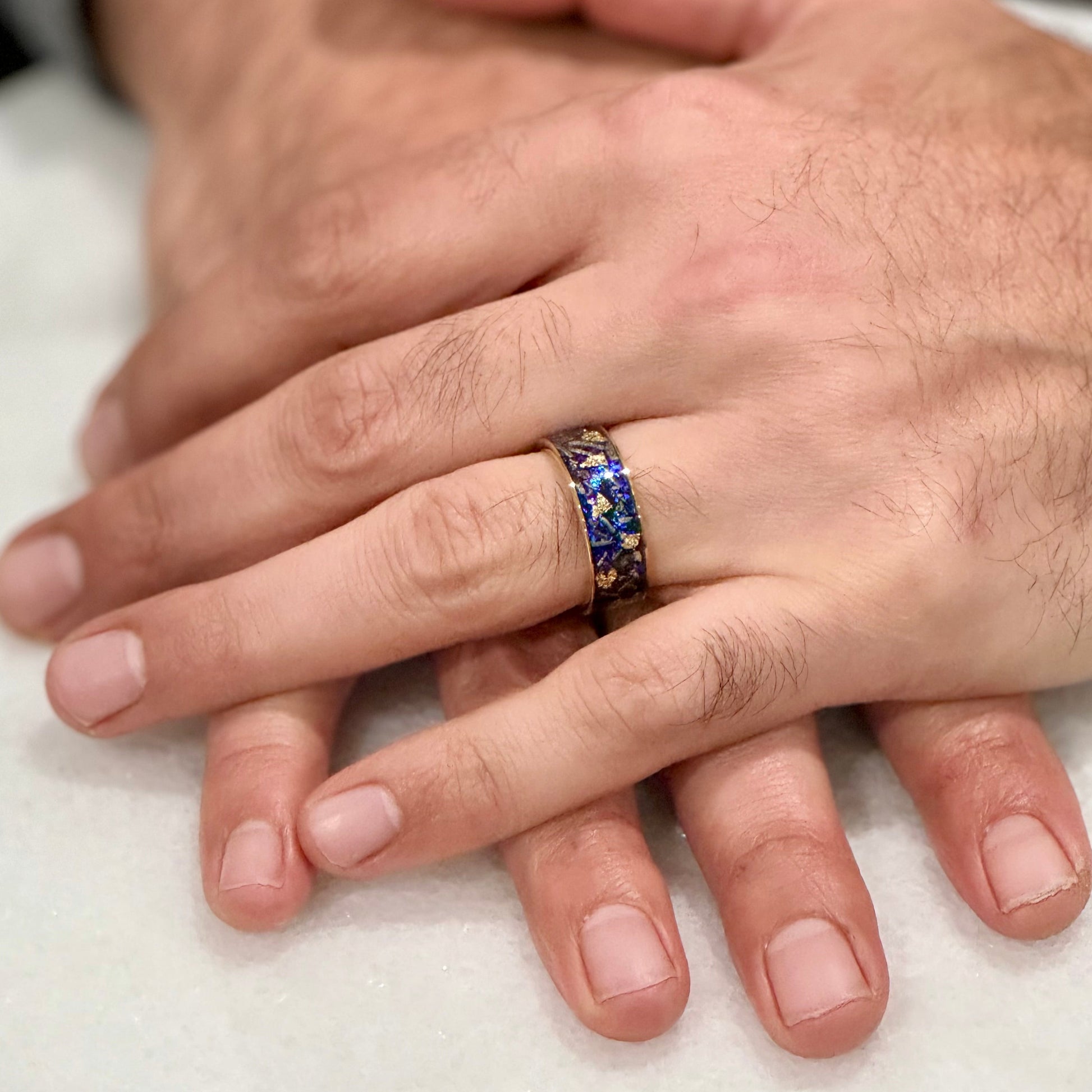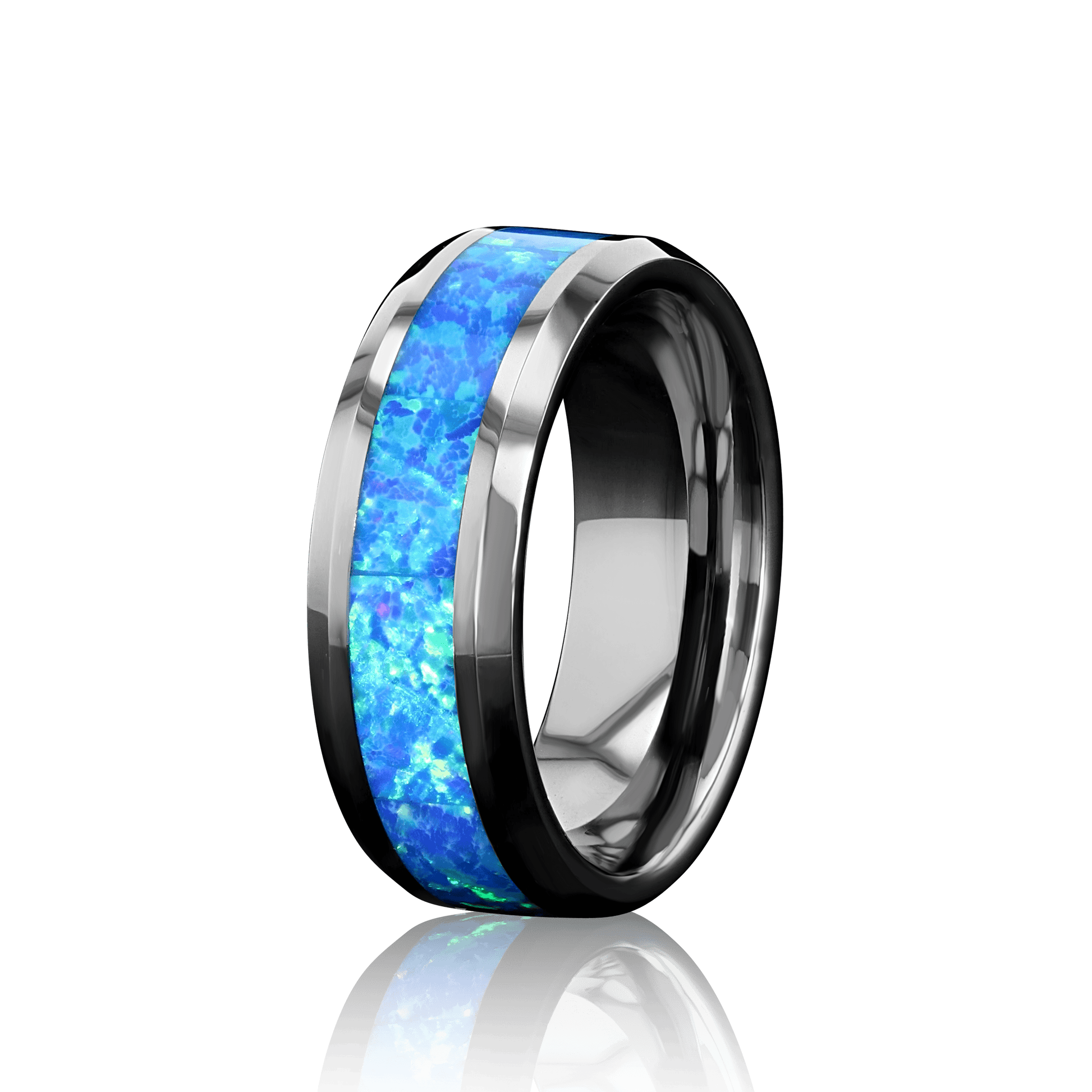 “IRIDESCENCE” Tungsten Carbide Silver Ring 8mm w/ Blue Opal