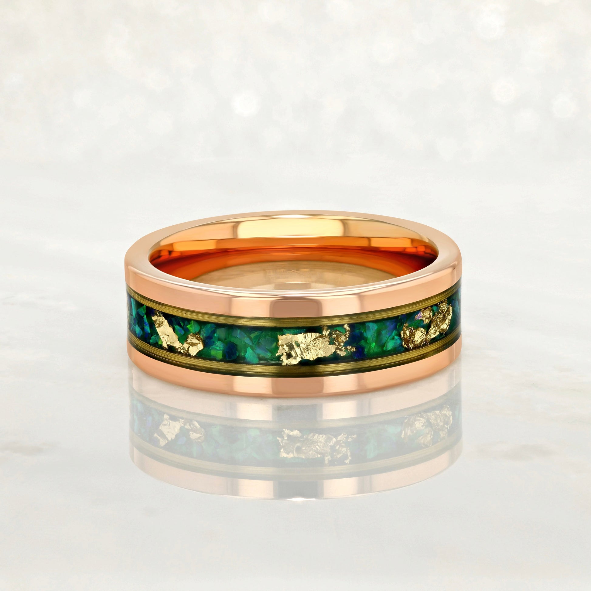 “IRIDESCENCE” Tungsten Carbide Rose Gold Ring 8mm w/ Blue-Green Opal