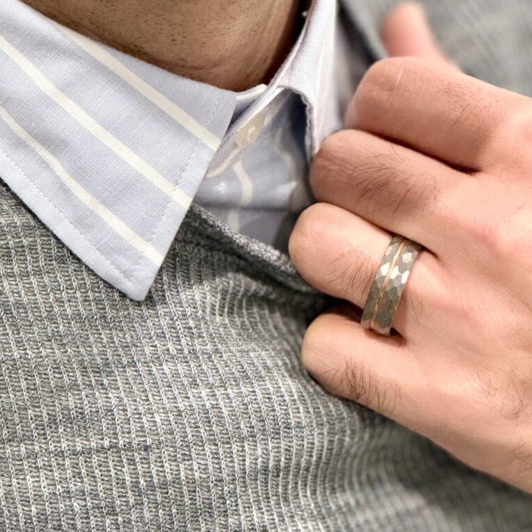Regular price $315.00 Sale price $236.25“PICASSO”Tungsten Carbide Gold Ring 8mm w/ Meteorite, Sandstone and Gold Leaf