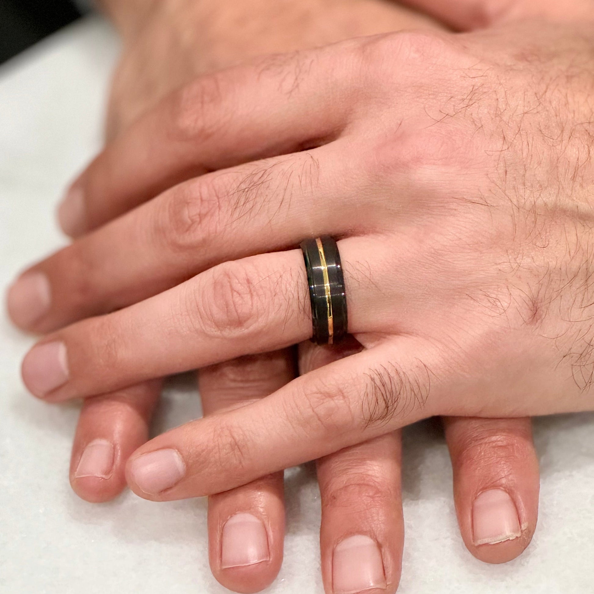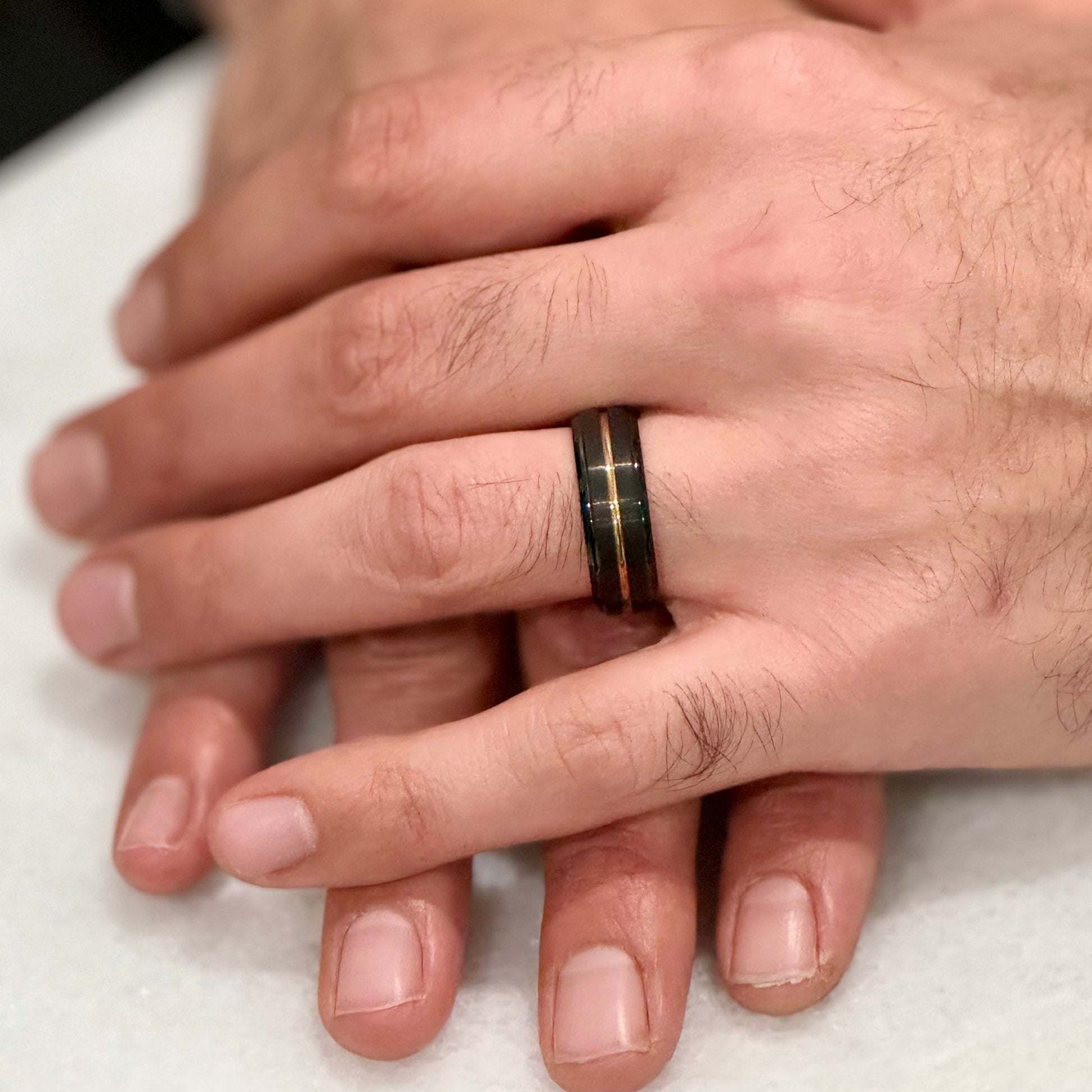 Sale"EQUINOX" Tungsten Carbide Black Ring 8mm w/ Gold Middle Line