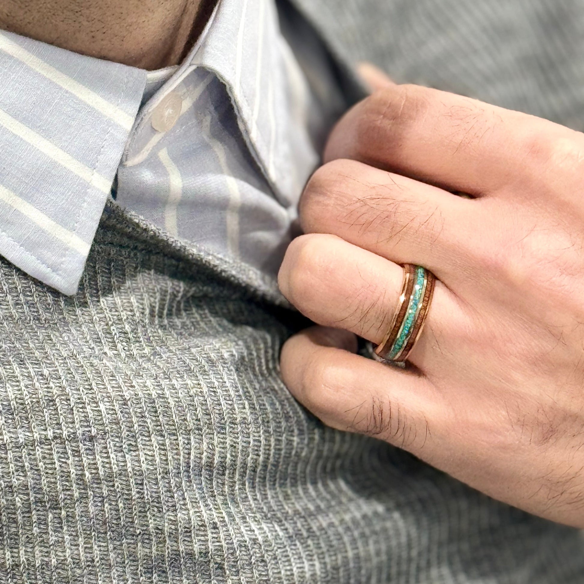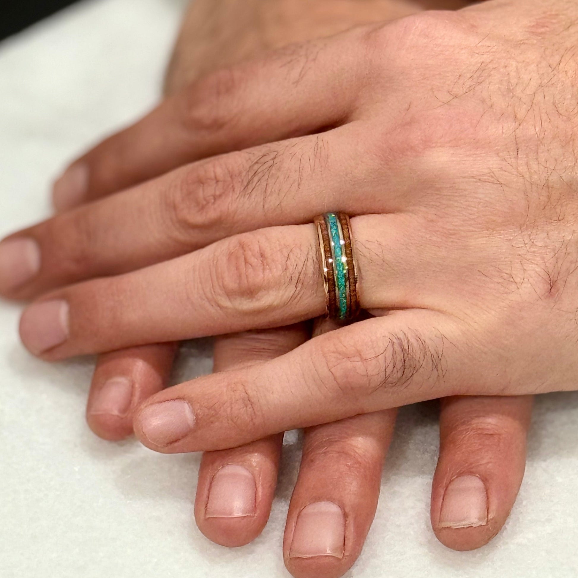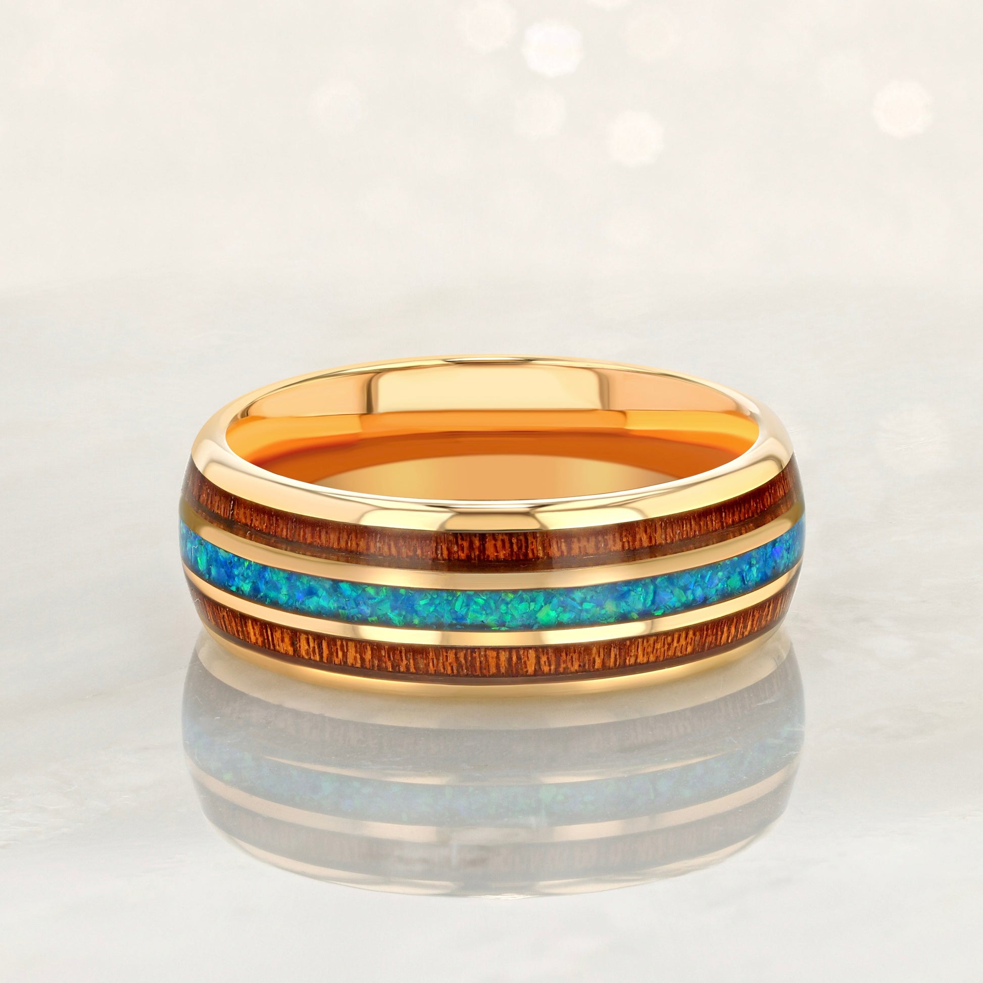 Sale"HALO" Tungsten Carbide Rose Gold Ring 8mm w/ Blue Opal and Koa Wood