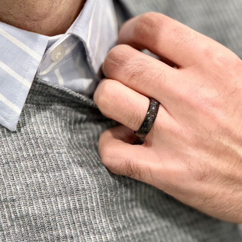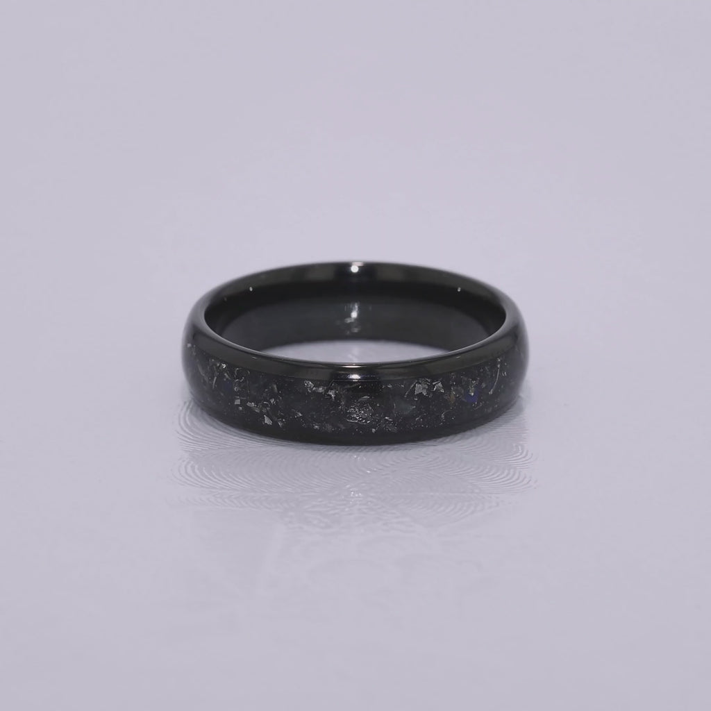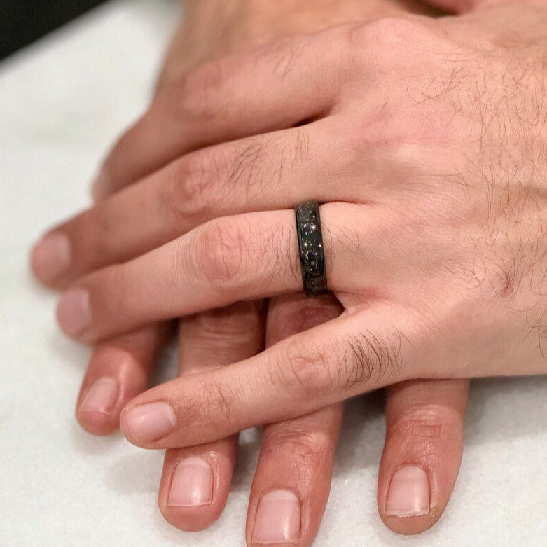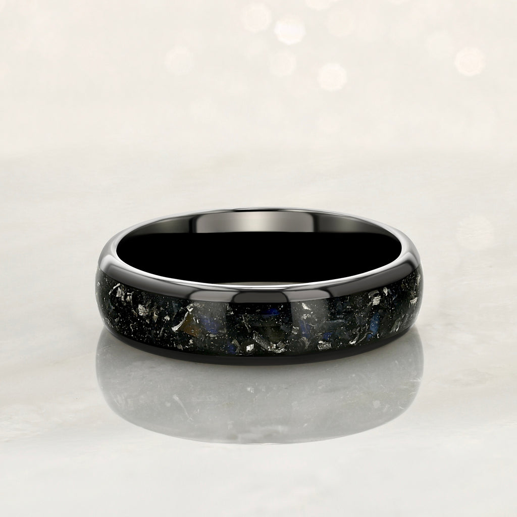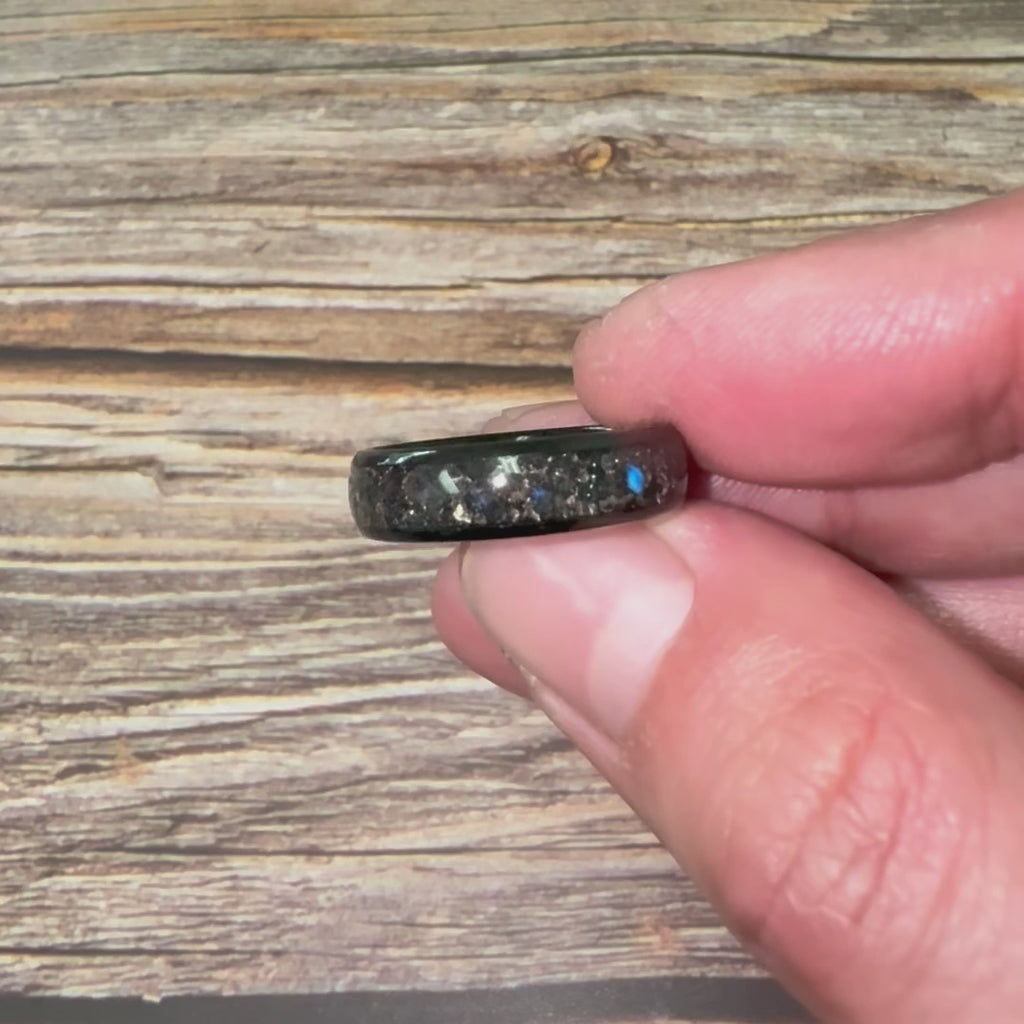 Introducing our Tungsten Carbide Black Ring with Subtle Blue Moonstone and Meteorite Specs, featuring a sleek black exterior with a captivating meteorite design. This 6mm ring's unique combination creates a striking contrast and adds a touch of elegance. Customizable to any size, including those not listed above; contact us for personalized orders!