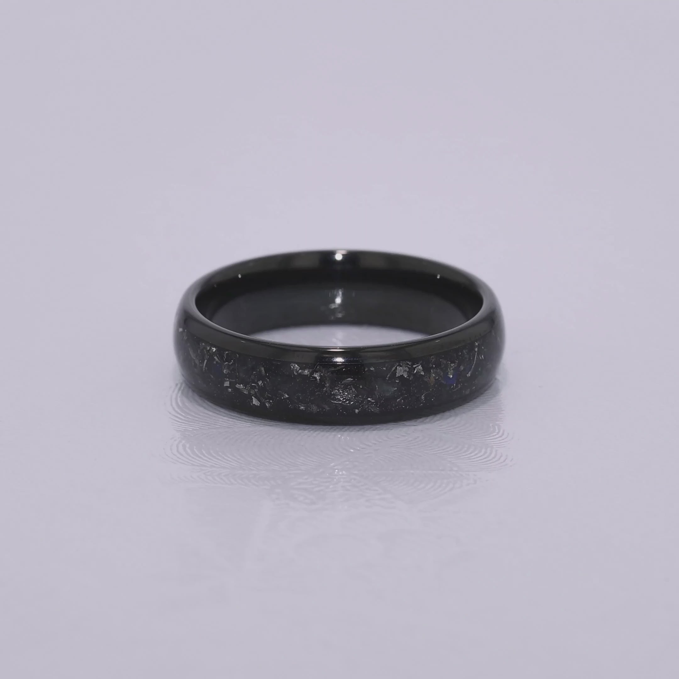 “MOONDUST” Tungsten Carbide Black Ring 6mm w/ Subtle Blue Moonstone and Meteorite Specs