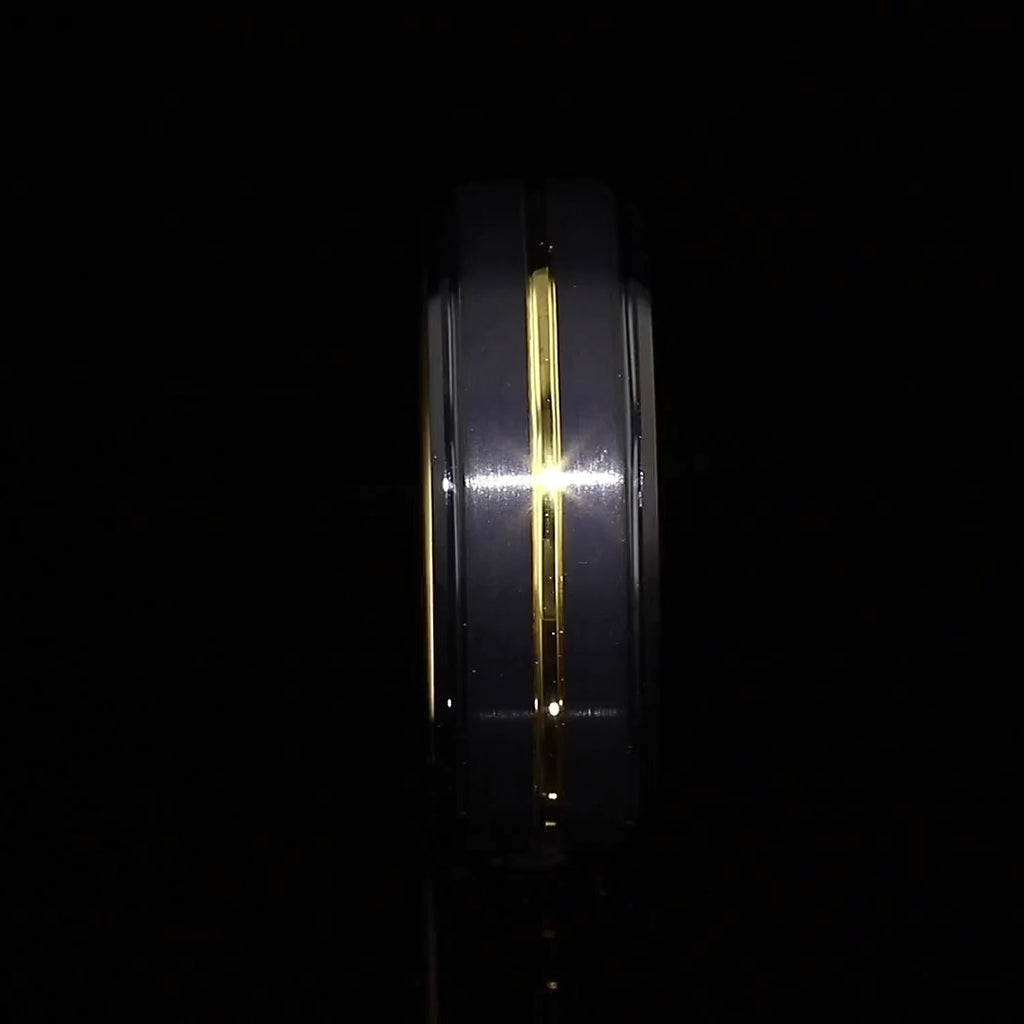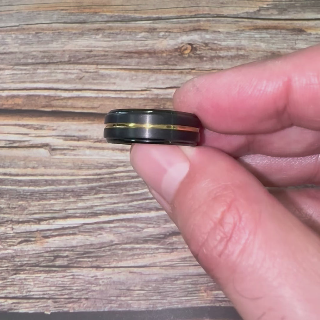 Introducing our Tungsten Carbide Black Ring with a Gold Line, featuring a sleek black exterior and a stunning gold line both in the middle and on the inside of the ring. This 8mm-wide ring can be customized to any size, including those not listed above; contact us for personalized orders!