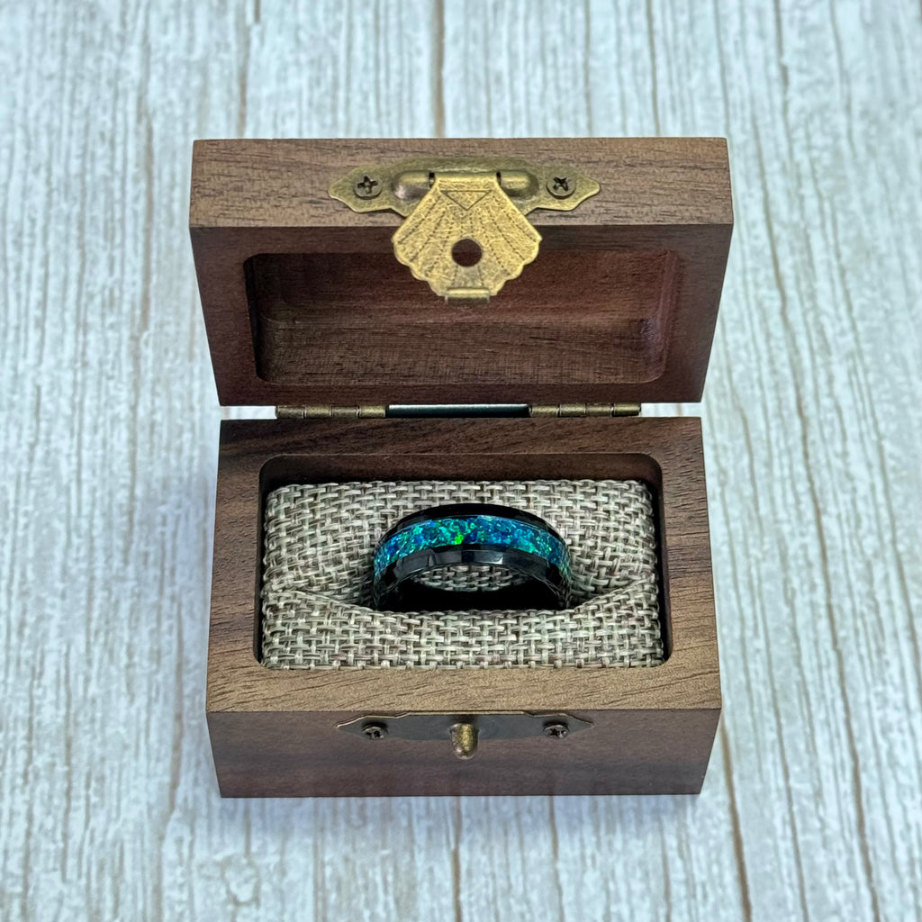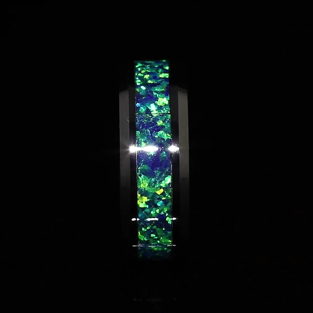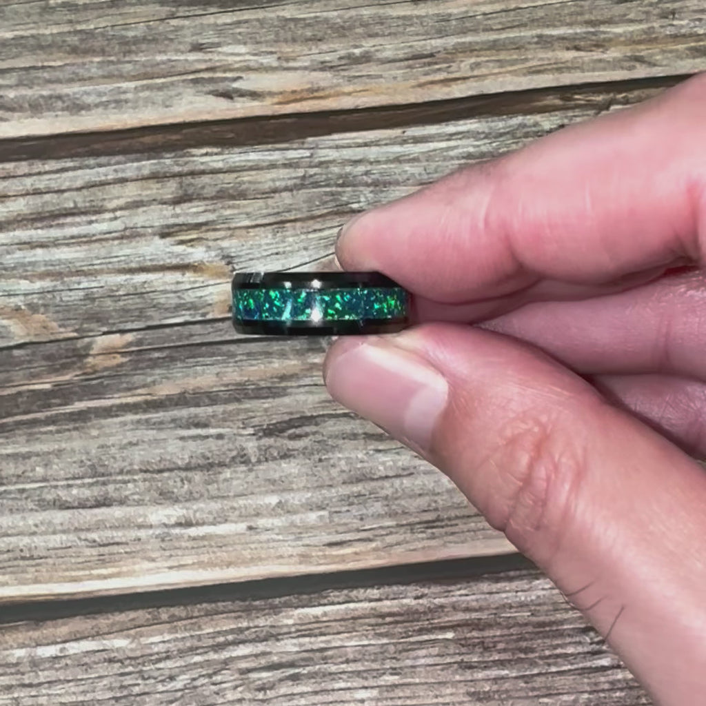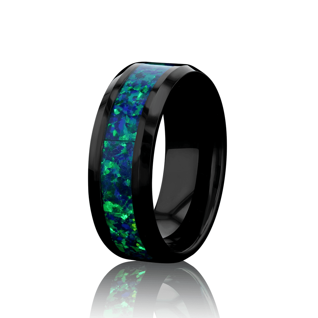 “IRIDESCENCE” Tungsten Carbide Black Ring 8mm w/ Blue-Green Opal