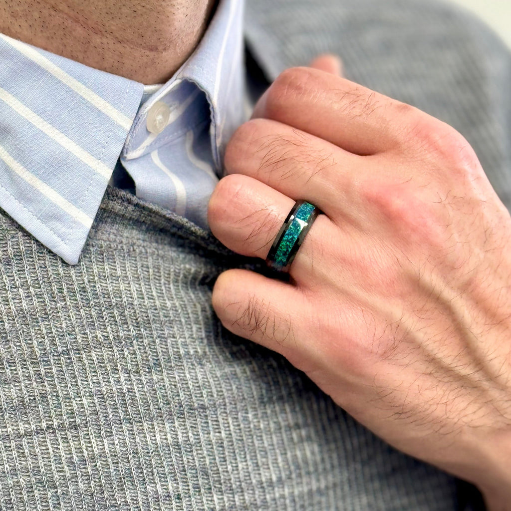 Introducing our Tungsten Carbide Black Ring with Blue-Green Opal, featuring a sleek black exterior adorned with Blue-Green Opal, creating a sophisticated and elegant look. Available in 8mm, and customizable to any other size not listed above; contact us for personalized orders!