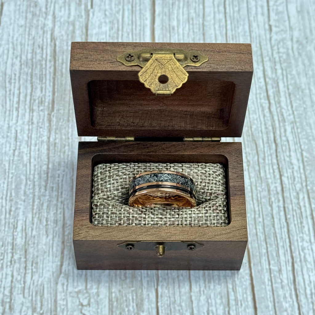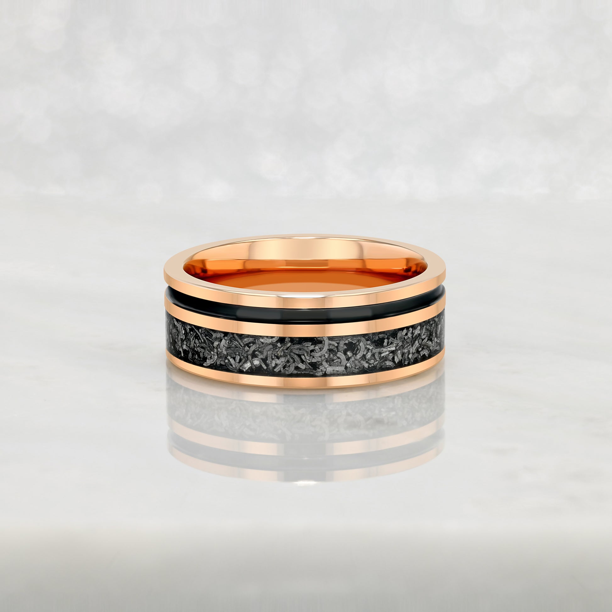 Introducing our Tungsten Carbide Rose Gold Ring with Crushed Meteorite and a Black Line to compliment the design . This ring features a sleek rose gold exterior with Crushed meteorite and and a Black Line inlay. Available in 8mm width and customizable to any other size not listed above; contact us for personalized orders!