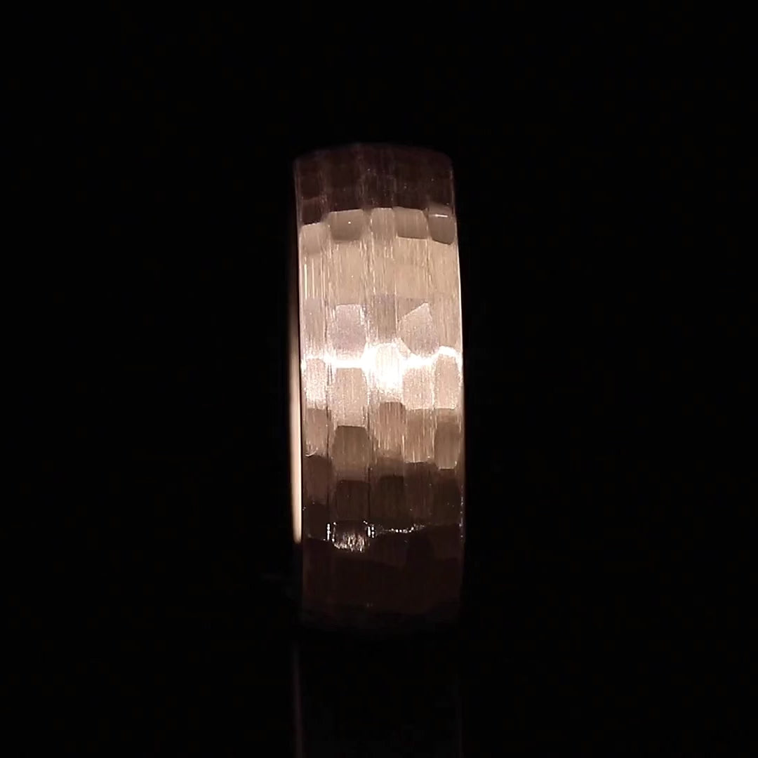 Introducing our meticulously crafted Tungsten Carbide Rose Gold Ring with a hammered design reminiscent of cobblestone and rustic charm, elegantly highlighted by a Rose Gold Hammered exterior. This ring boasts dimensions available in 8mm and 4mm widths, making it an ideal choice for couples seeking timeless sophistication. Customizable to your precise specifications, including sizes not listed, please reach out for personalized orders and impeccable service.