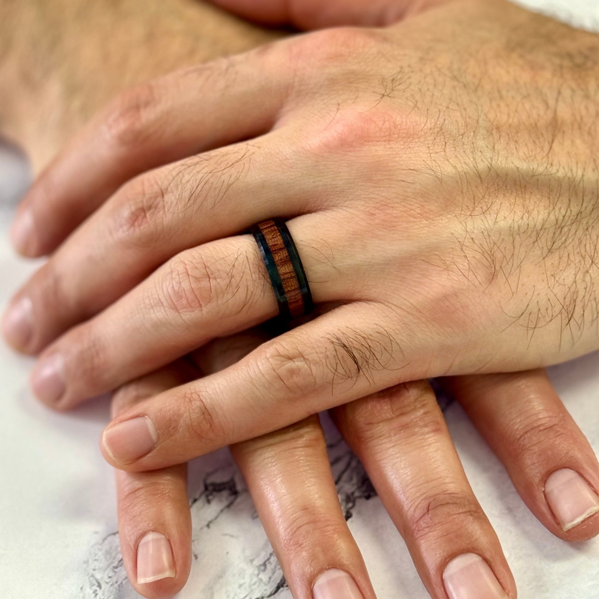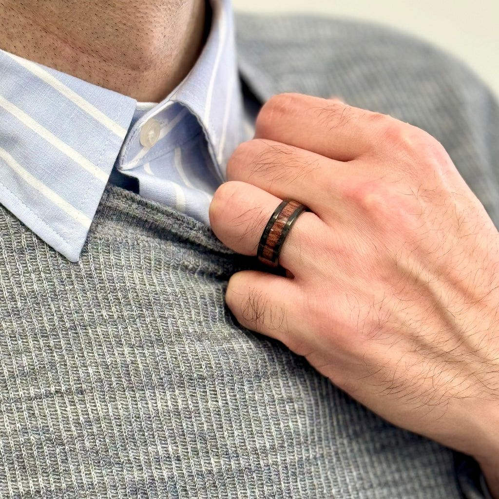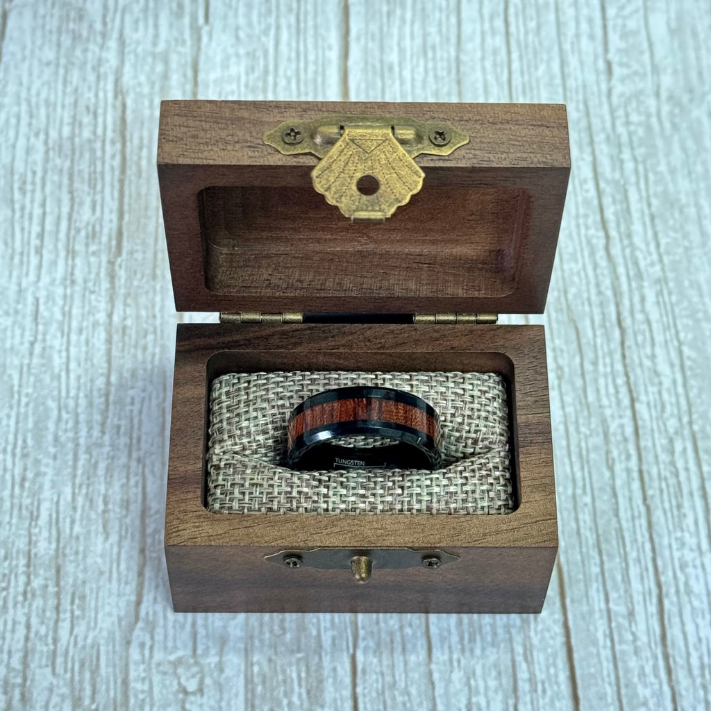 Introducing our Tungsten Carbide Black Ring with a Koa Wood Inlay, showcasing a sleek Black exterior and an inset of Koa Wood. This 8mm-wide ring is customizable to any size, including those not listed above. Please contact us for personalized orders!