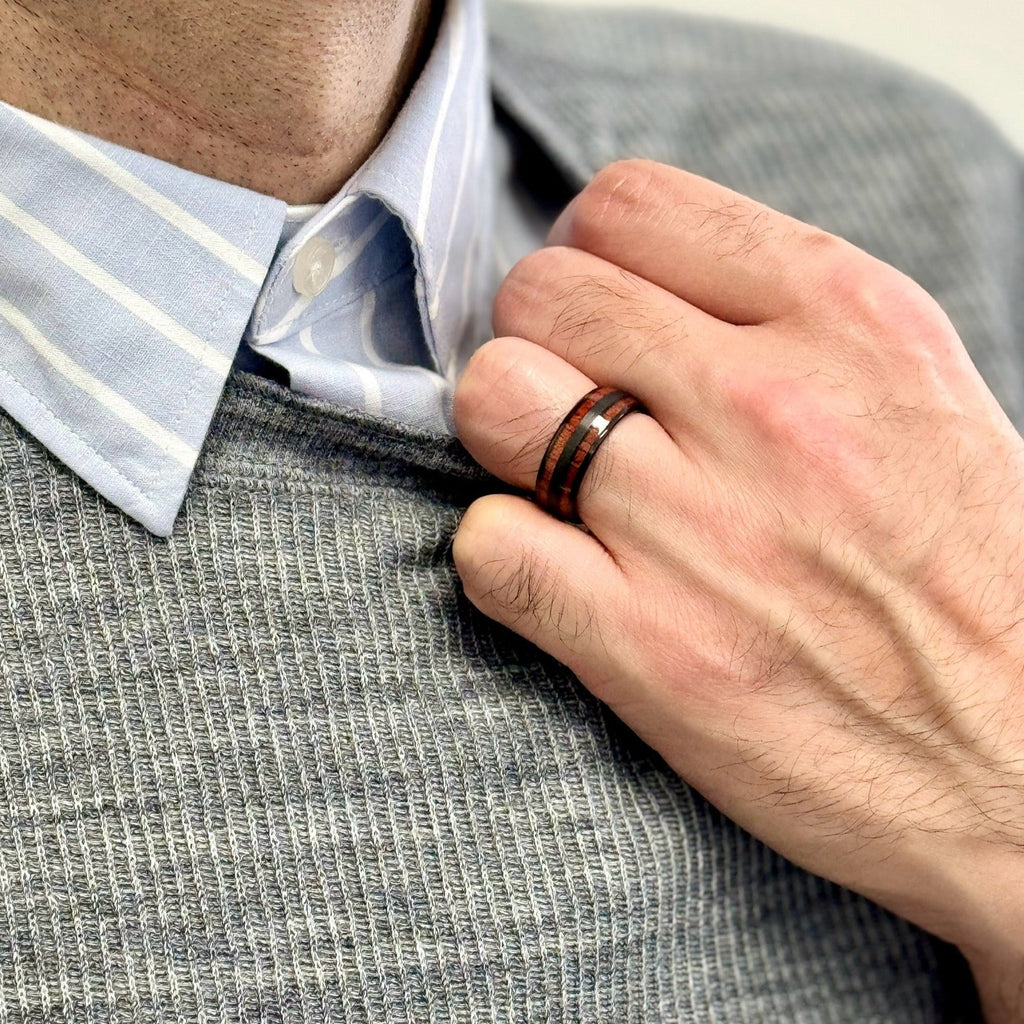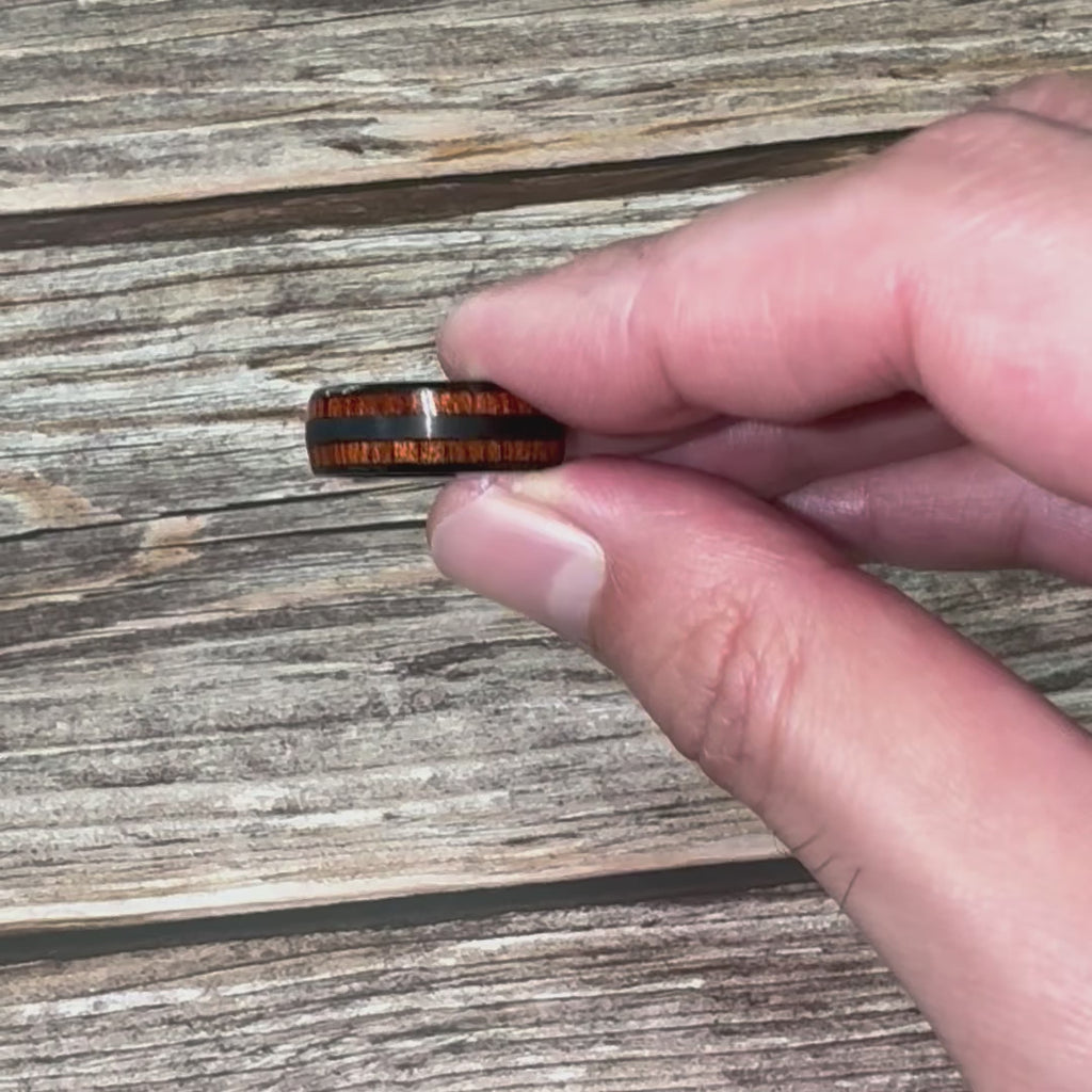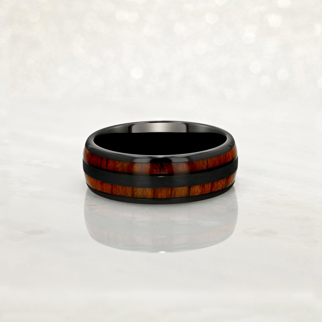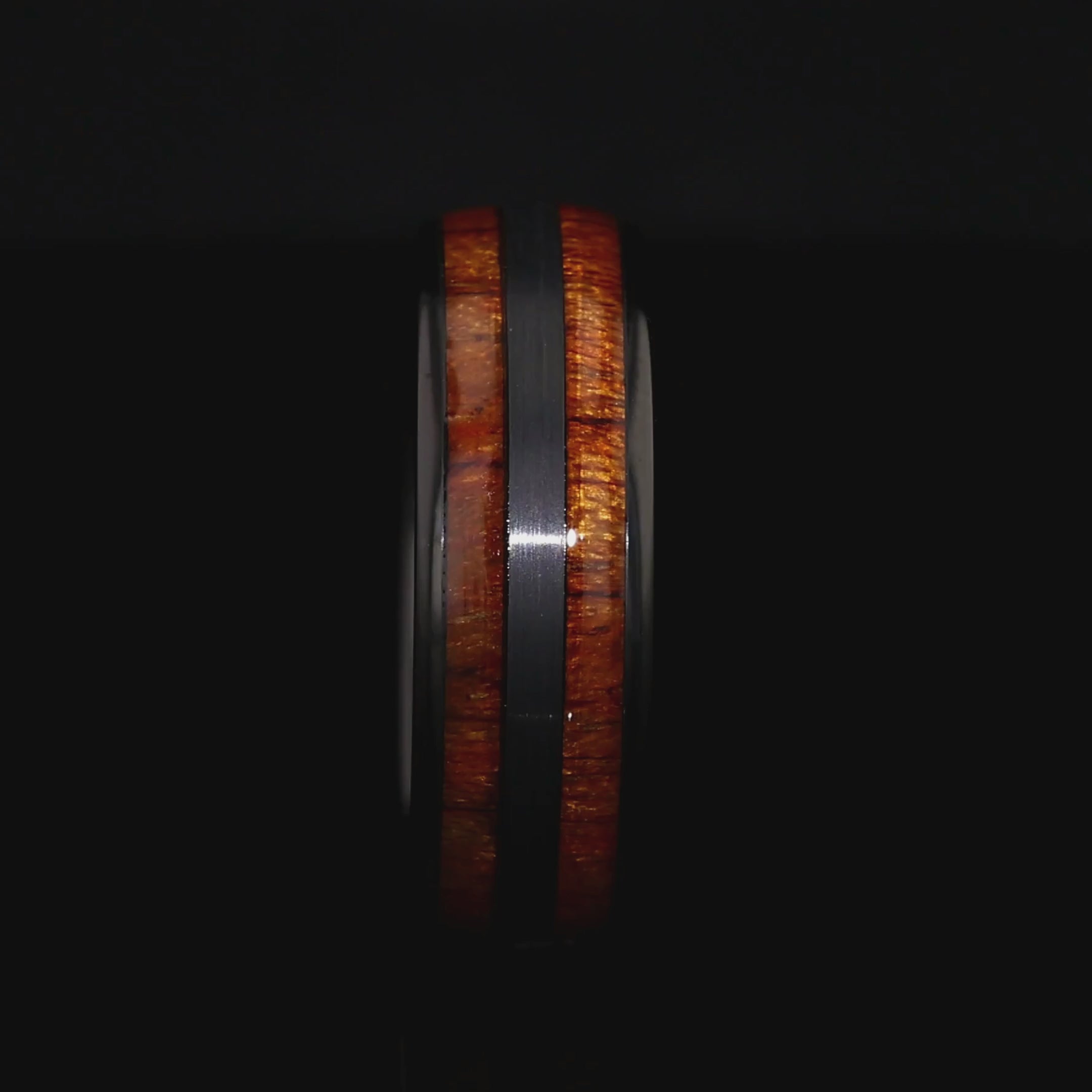 Introducing our stunning Tungsten Carbide Black Ring adorned with two captivating Red Dyed Koa Wood inlays! This ring boasts a sleek Black exterior, creating a bold and striking look. Available in 8mm width and customizable to any other size not listed above; contact us for personalized orders and elevate your style today!