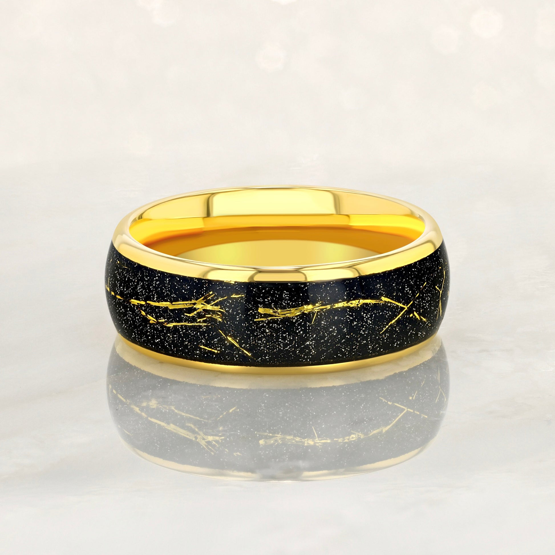 Introducing our Gold Tungsten Ring with Meteorite Dust and Gold Specs, perfect for couples. This ring features a luxurious gold exterior adorned with the shimmer of meteorite dust and intricate gold specs, creating a striking and sophisticated look. Available in 8mm and 6mm sizes, and customizable to any other size not listed above; contact us for personalized orders!