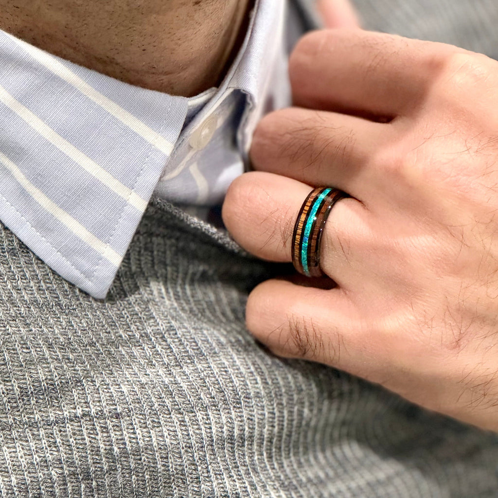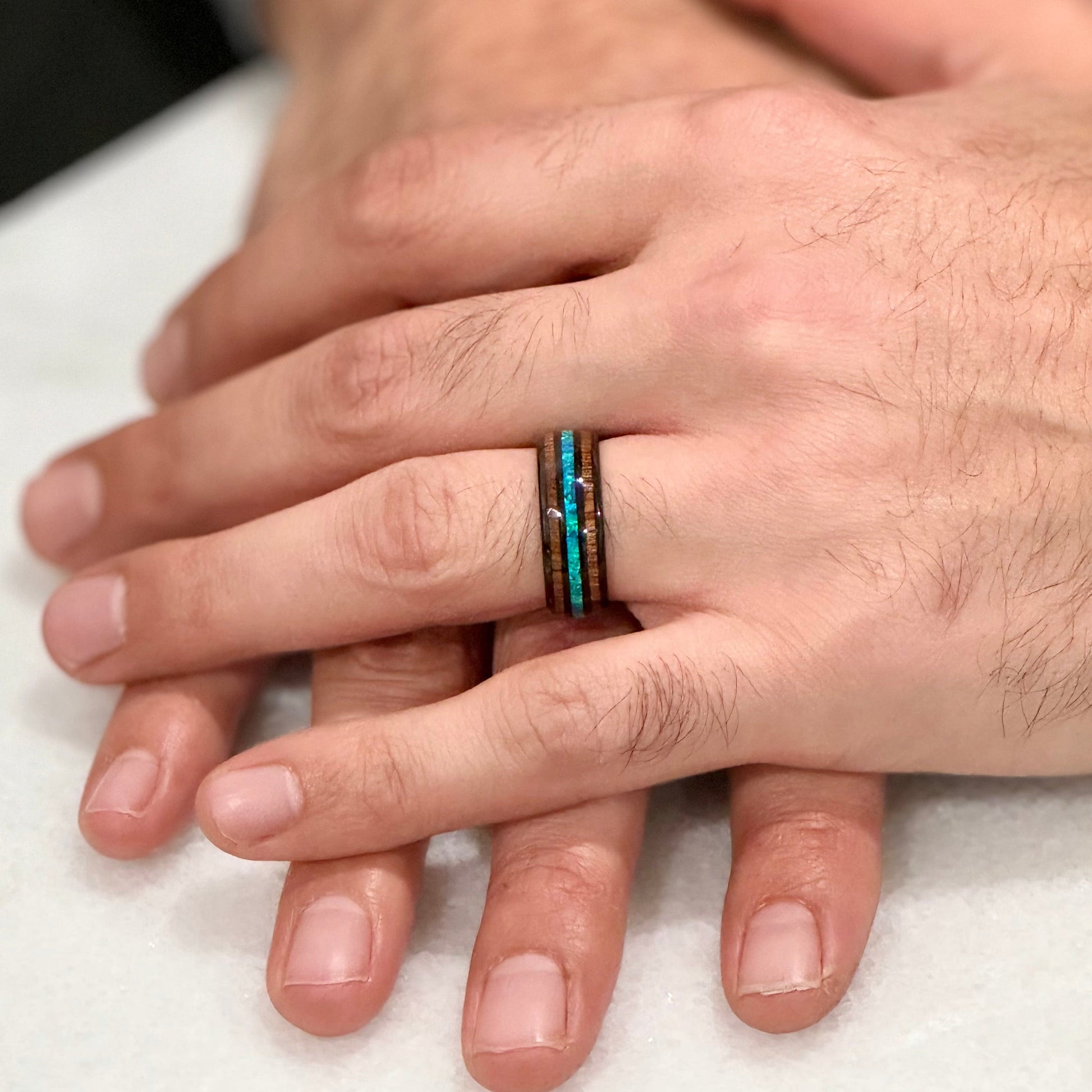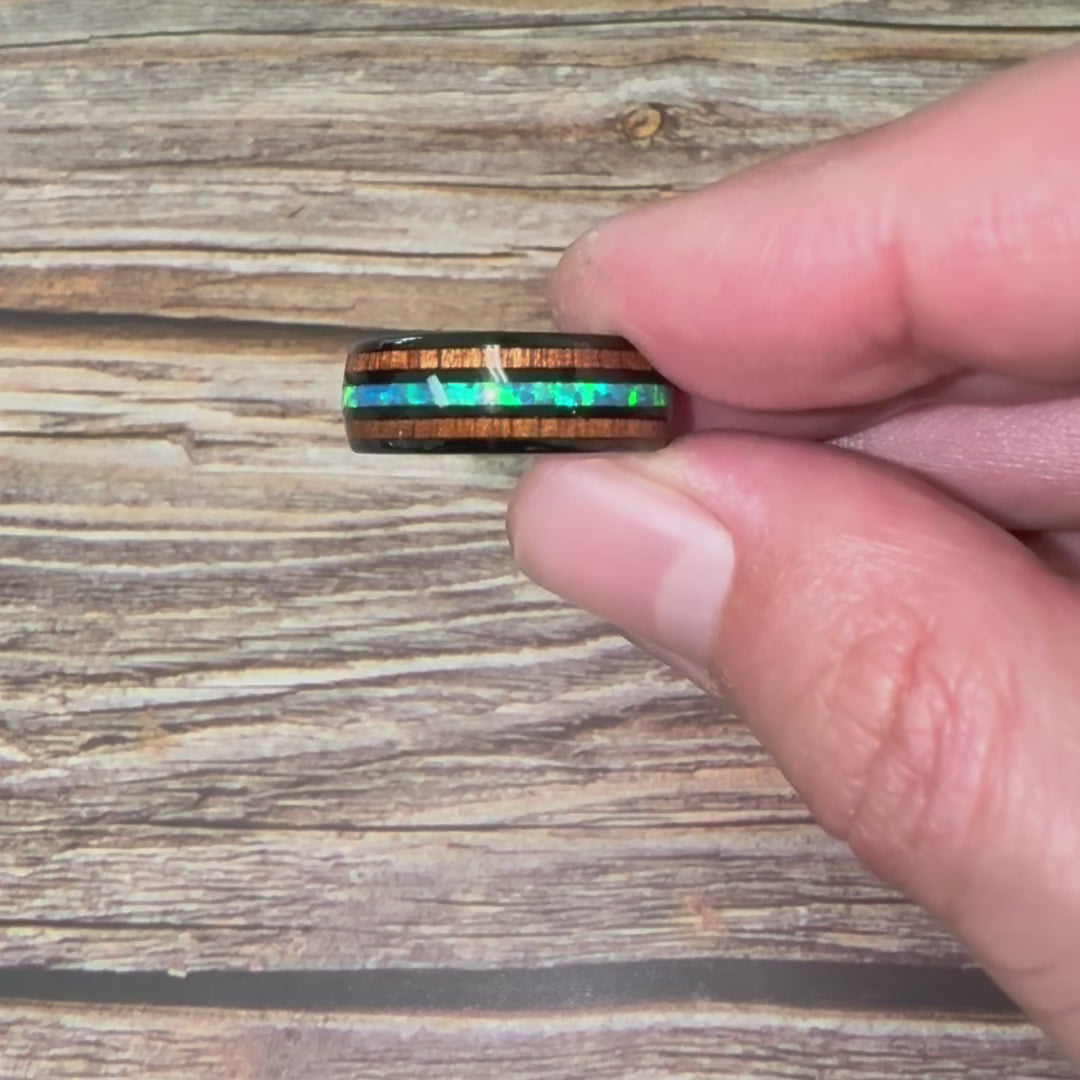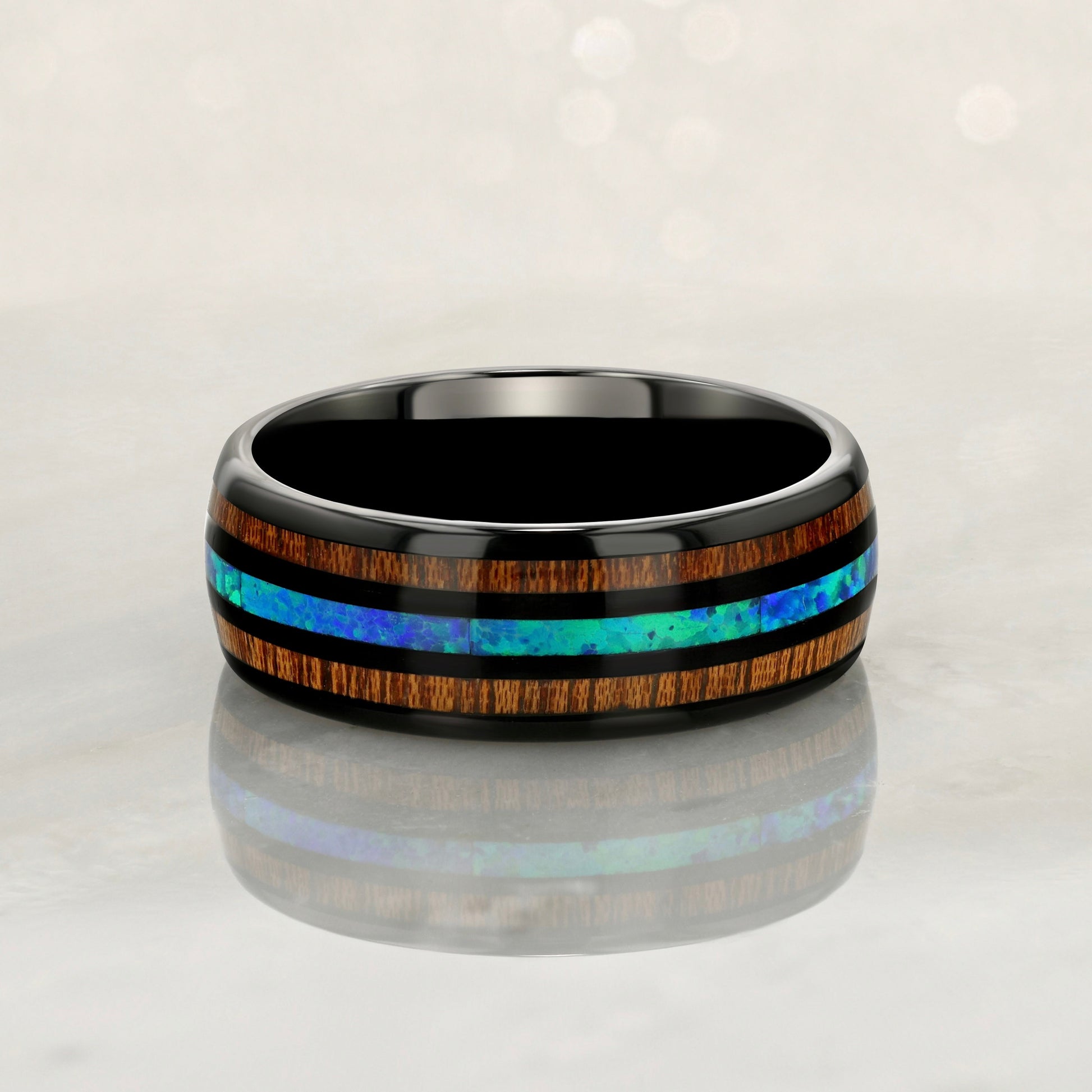 Introducing our Tungsten Carbide Black Ring with Two Koa Wood Inlays and a Blue Opal Middle, featuring a sleek black exterior with two Koa wood inlays and a stunning blue opal middle. The black color is elegantly present both on the inside and outside of the ring, creating a striking contrast. This 8mm-wide ring can be customized to any size, including those not listed above; contact us for personalized orders!