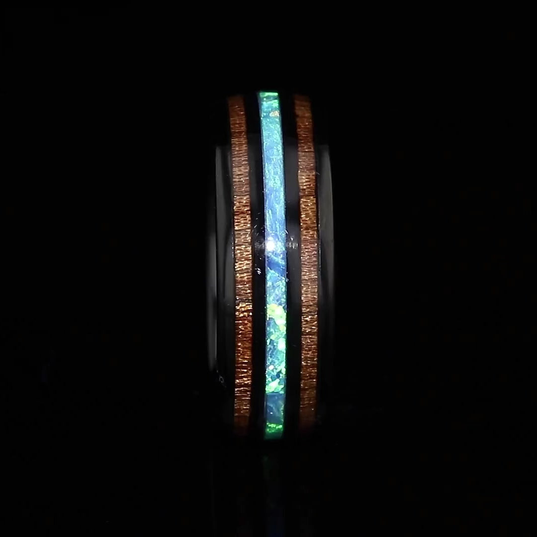 "HALO" Tungsten Carbide Black Ring 8mm w/ Blue Opal and Koa Wood