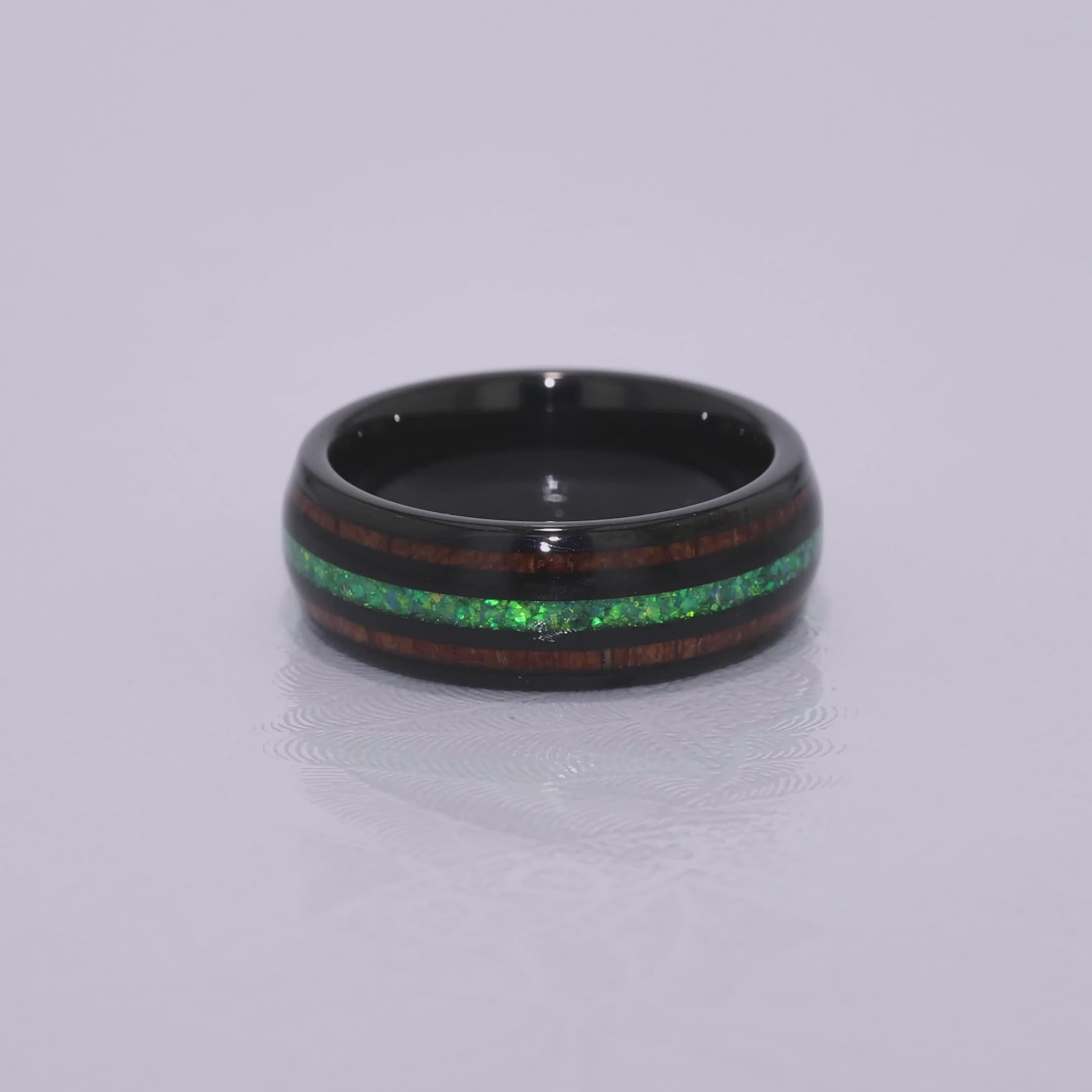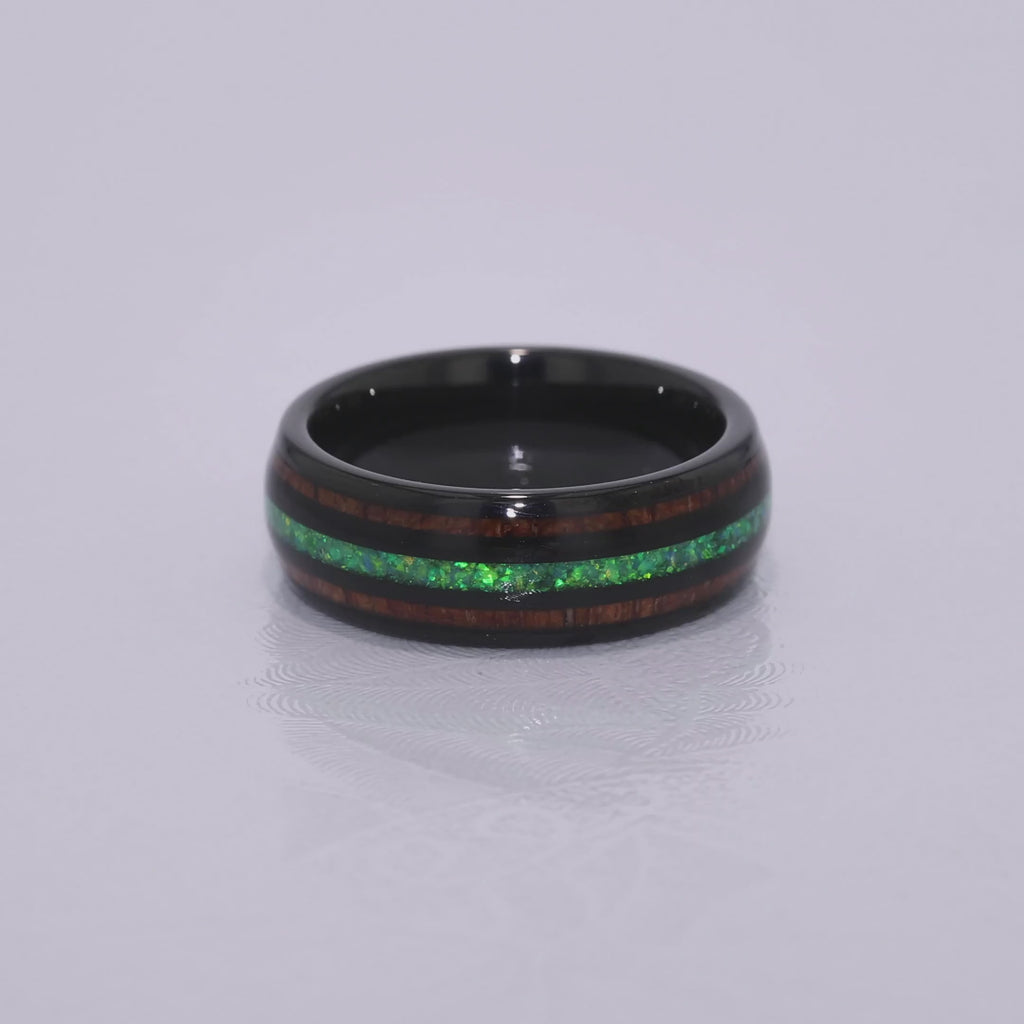 "HALO" Tungsten Carbide Black Ring 8mm w/ Green Opal and Koa Wood