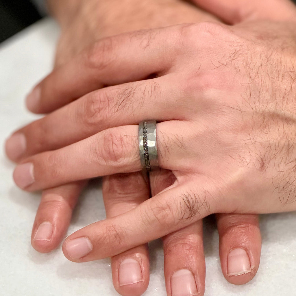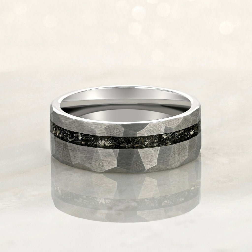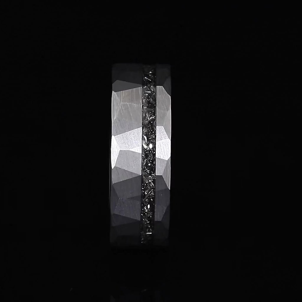 Introducing our Tungsten Carbide Silver Hammered Ring with Crushed Meteorite, showcasing a unique hammered texture and an inset of crushed meteorite set asymmetrically. This 8mm-wide ring can be customized to any size, including those not listed above; contact us for personalized orders!