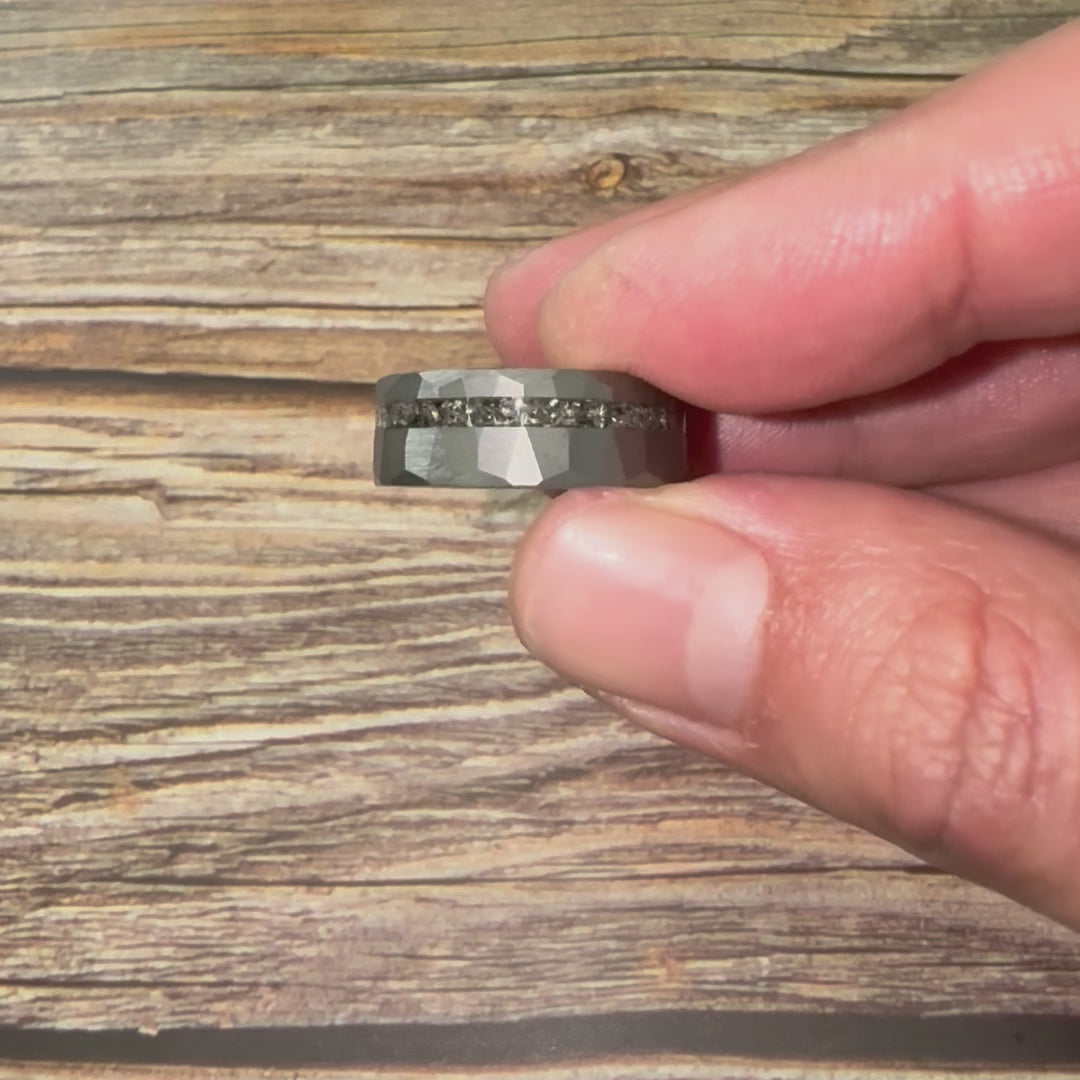 "ECLIPSE" Tungsten Carbide Silver Hammered Ring 8mm w/ Crushed Meteorite