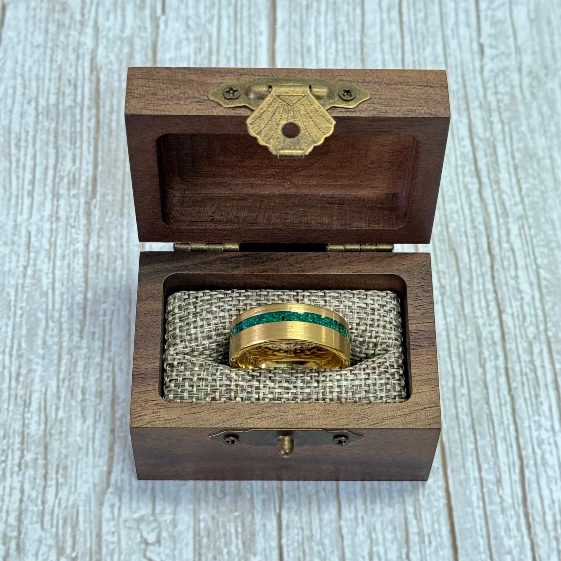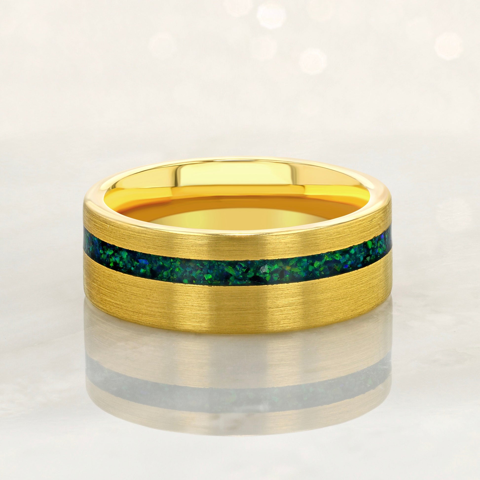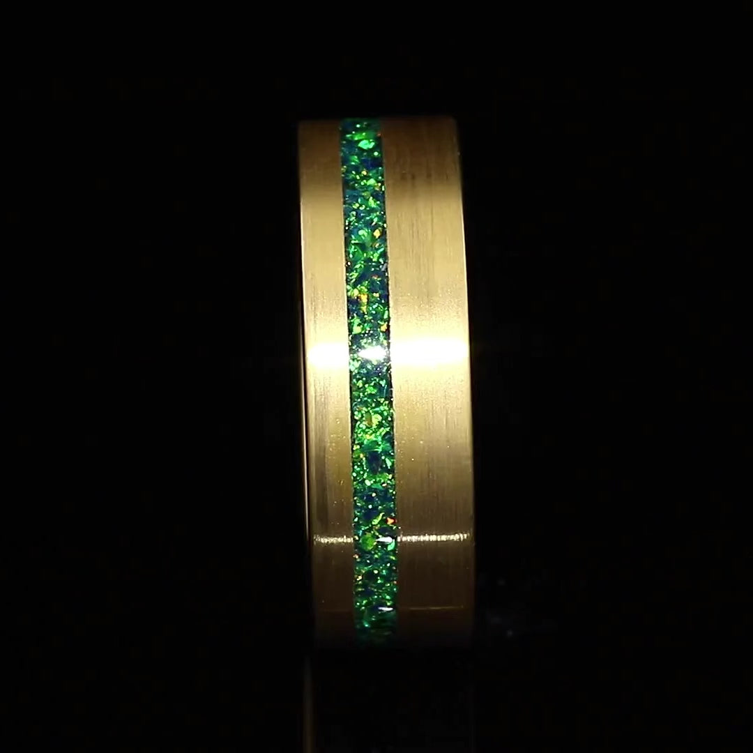 Introducing our Gold Tungsten Ring with Crushed Green Opal set Asymmetrically, featuring a luxurious gold exterior and a mesmerizing crushed green opal inset. This 8mm-wide ring's unique design adds a touch of sophistication and elegance. Customizable to any size, including those not listed above; contact us for personalized orders!