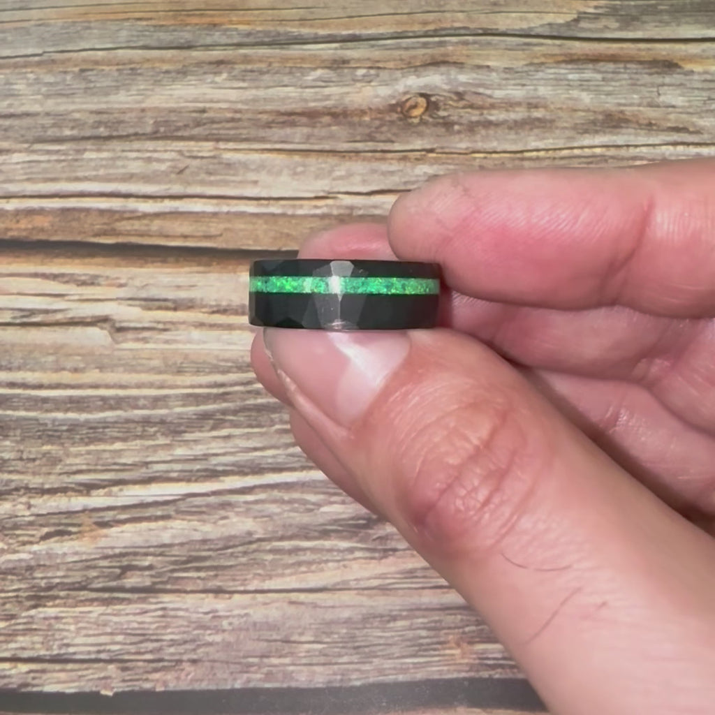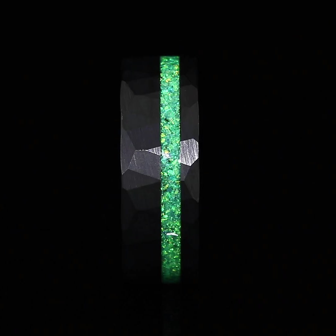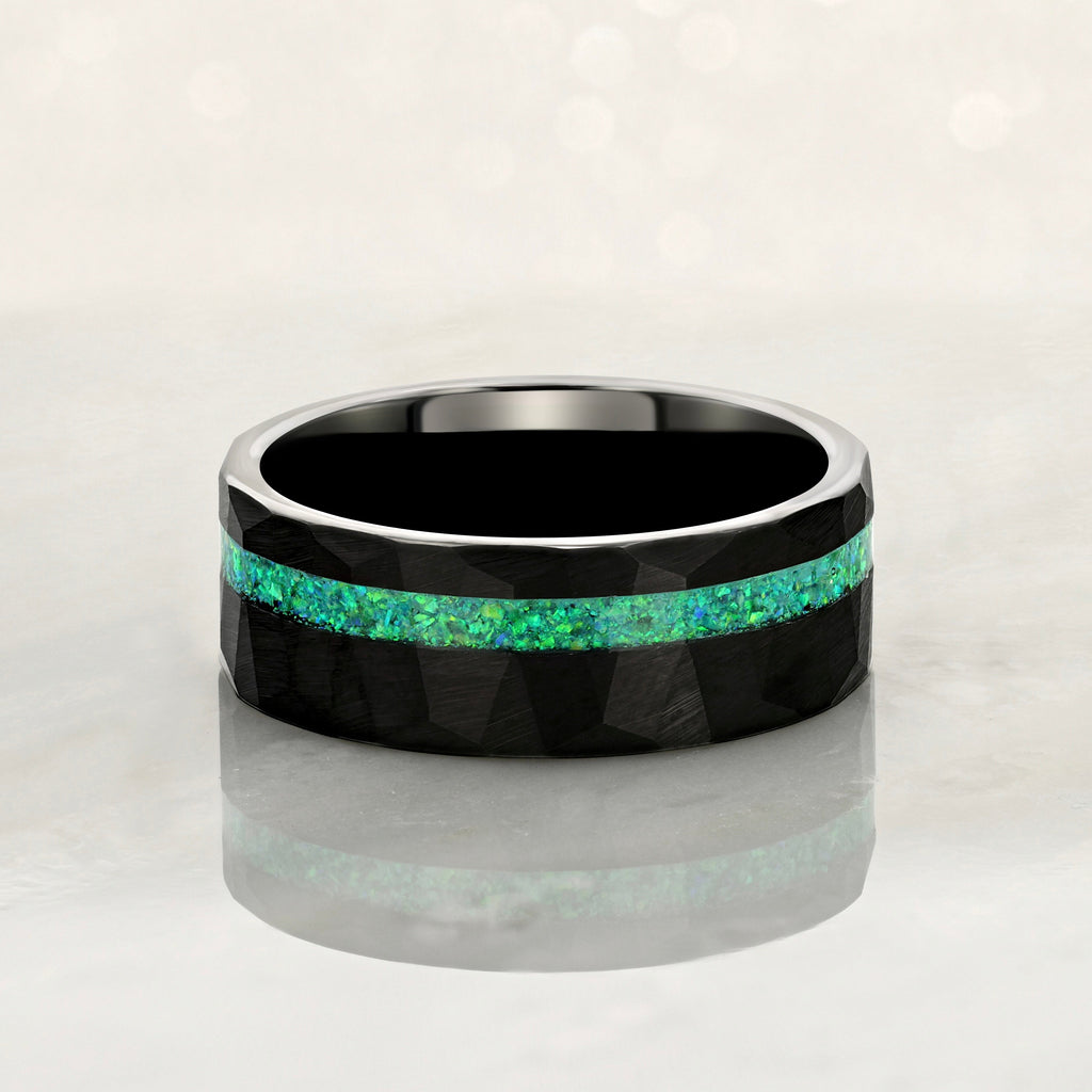 Introducing our Tungsten Carbide Black Hammered Ring with Green Opal, showcasing a distinctive hammered texture and an inset of vibrant green opal set asymmetrically. This 8mm-wide ring can be customized to any size, including those not listed above; contact us for personalized orders!